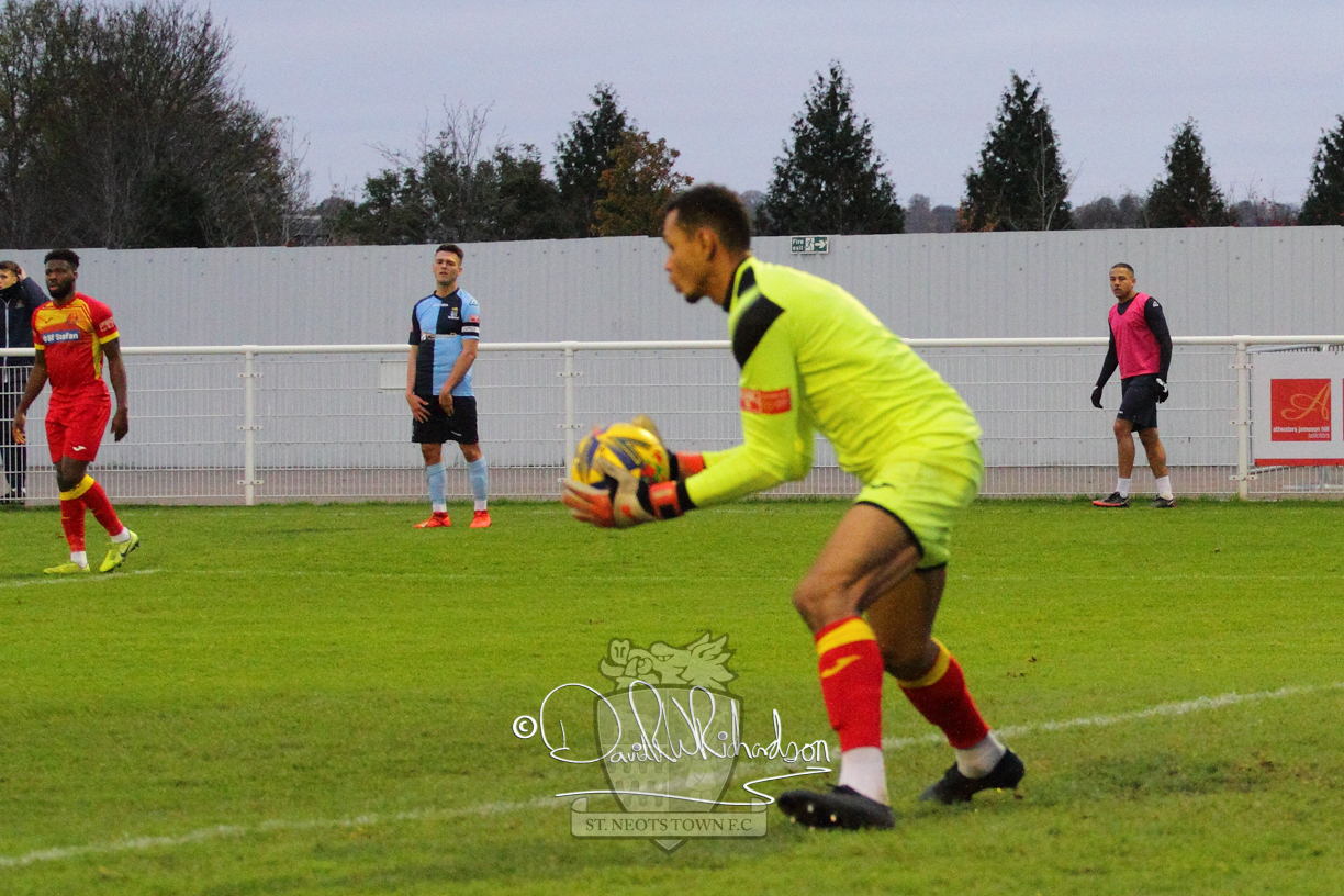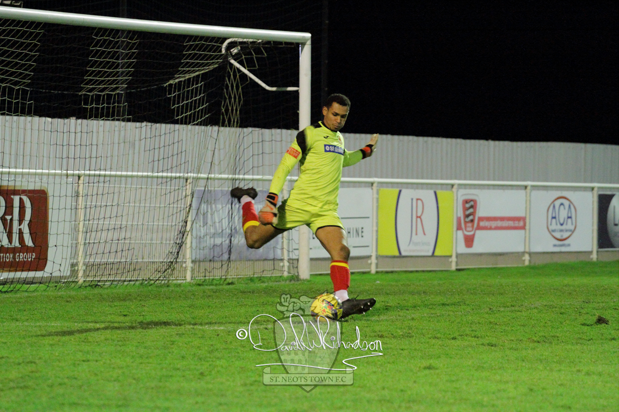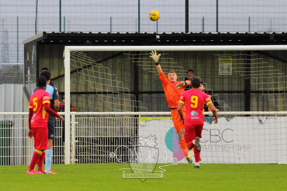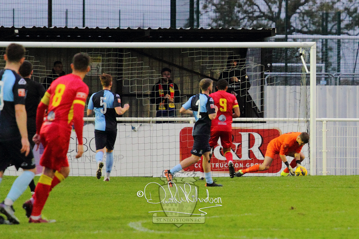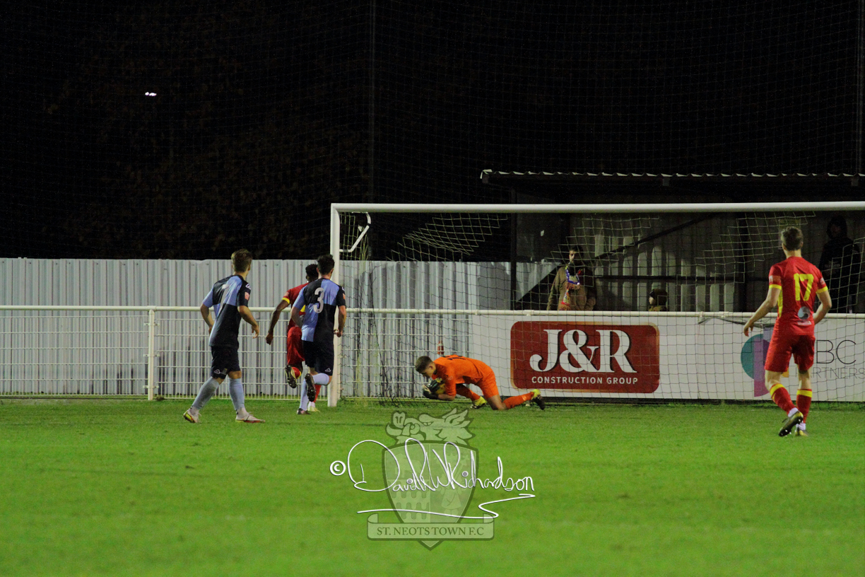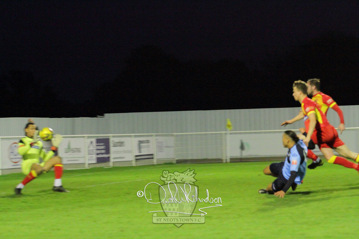 This most recent signing excited with his pace and skill and looks to be a very useful addition to the squad making an early impact after just six minutes as he rounded the home keeper to set up Myles Cowling but his shot from 25 yards sailed harmlessly over the crossbar. Four minutes later St Neots could have been behind as George Whitehall spilled a cross from Jonathan Edwards, but Charlie Johnson hacked the ball clear. Ky Marsh-Brown was then upended in the penalty area, but the referee waved play on whilst at the other end Olluwatobi Coker brought a full length save from Whitehall. His opposite number Lincon Marques then emulated him with an important save from a low Cowling effort and after 33 minutes Coker’s cross picked out the unmarked Anthony Edgar, but he miskicked with the goal at his mercy. Towards the end of the half St Neots were well in control and Ky Marsh-Brown was twice in significant action, bringing an important save from Marques before rounding off a mazy run through the home defence by shooting over the bar.