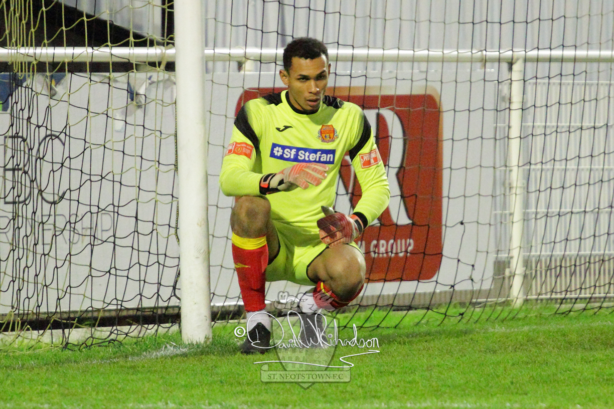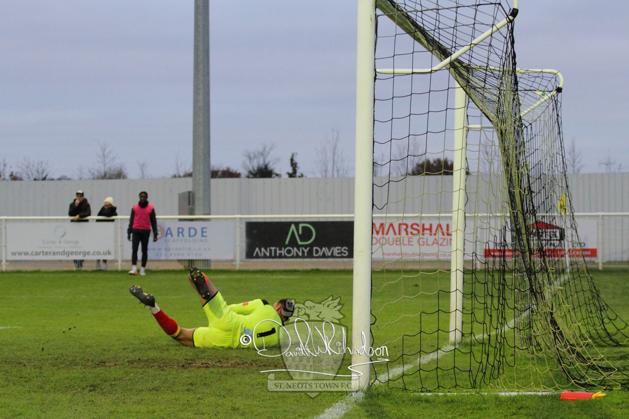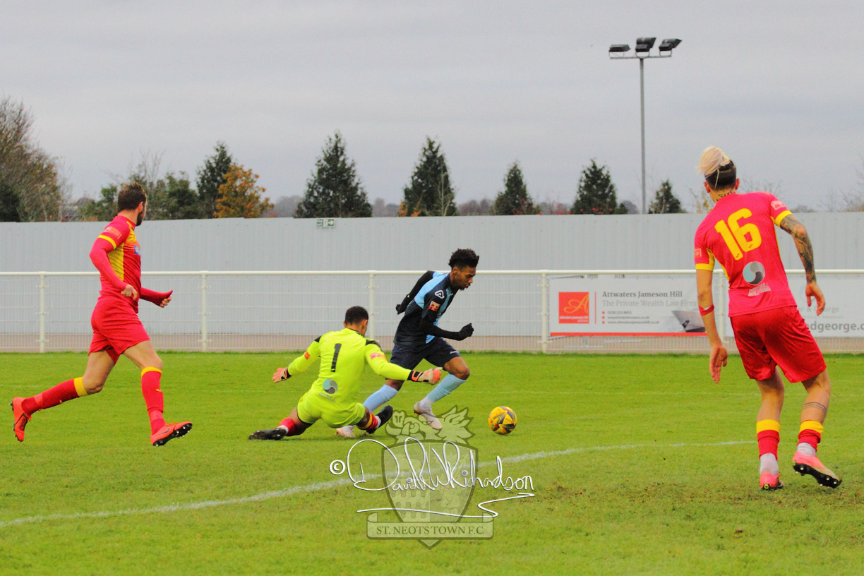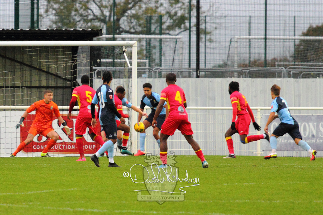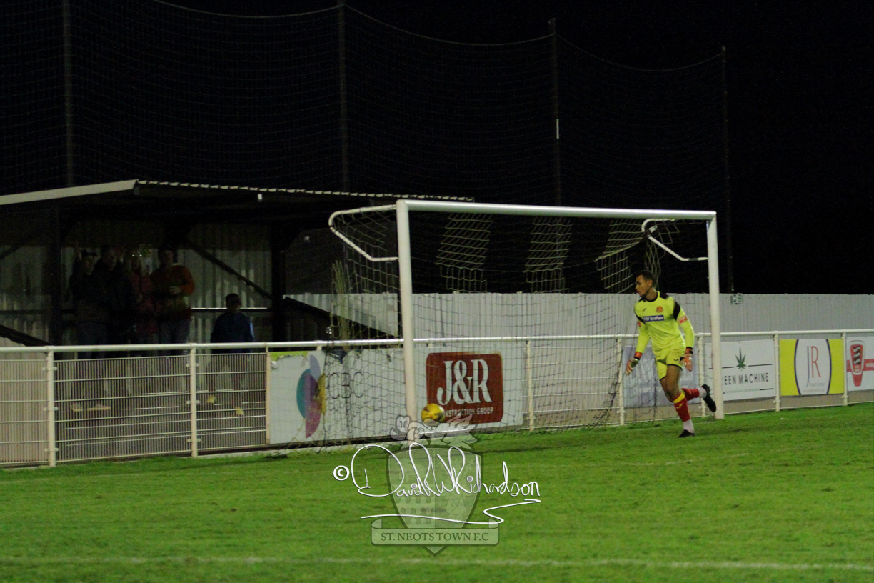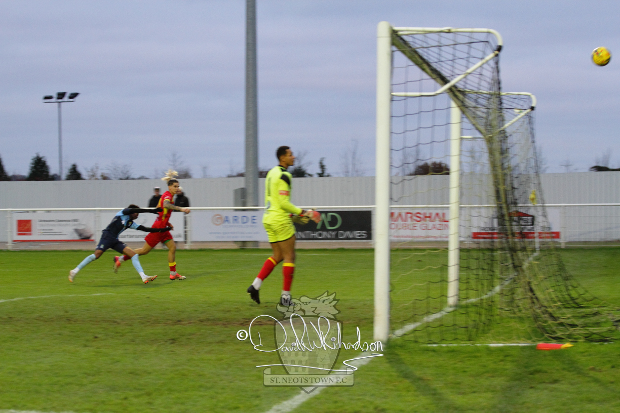 This most recent signing excited with his pace and skill and looks to be a very useful addition to the squad making an early impact after just six minutes as he rounded the home keeper to set up Myles Cowling but his shot from 25 yards sailed harmlessly over the crossbar. Four minutes later St Neots could have been behind as George Whitehall spilled a cross from Jonathan Edwards, but Charlie Johnson hacked the ball clear. Ky Marsh-Brown was then upended in the penalty area, but the referee waved play on whilst at the other end Olluwatobi Coker brought a full length save from Whitehall. His opposite number Lincon Marques then emulated him with an important save from a low Cowling effort and after 33 minutes Coker’s cross picked out the unmarked Anthony Edgar, but he miskicked with the goal at his mercy. Towards the end of the half St Neots were well in control and Ky Marsh-Brown was twice in significant action, bringing an important save from Marques before rounding off a mazy run through the home defence by shooting over the bar.