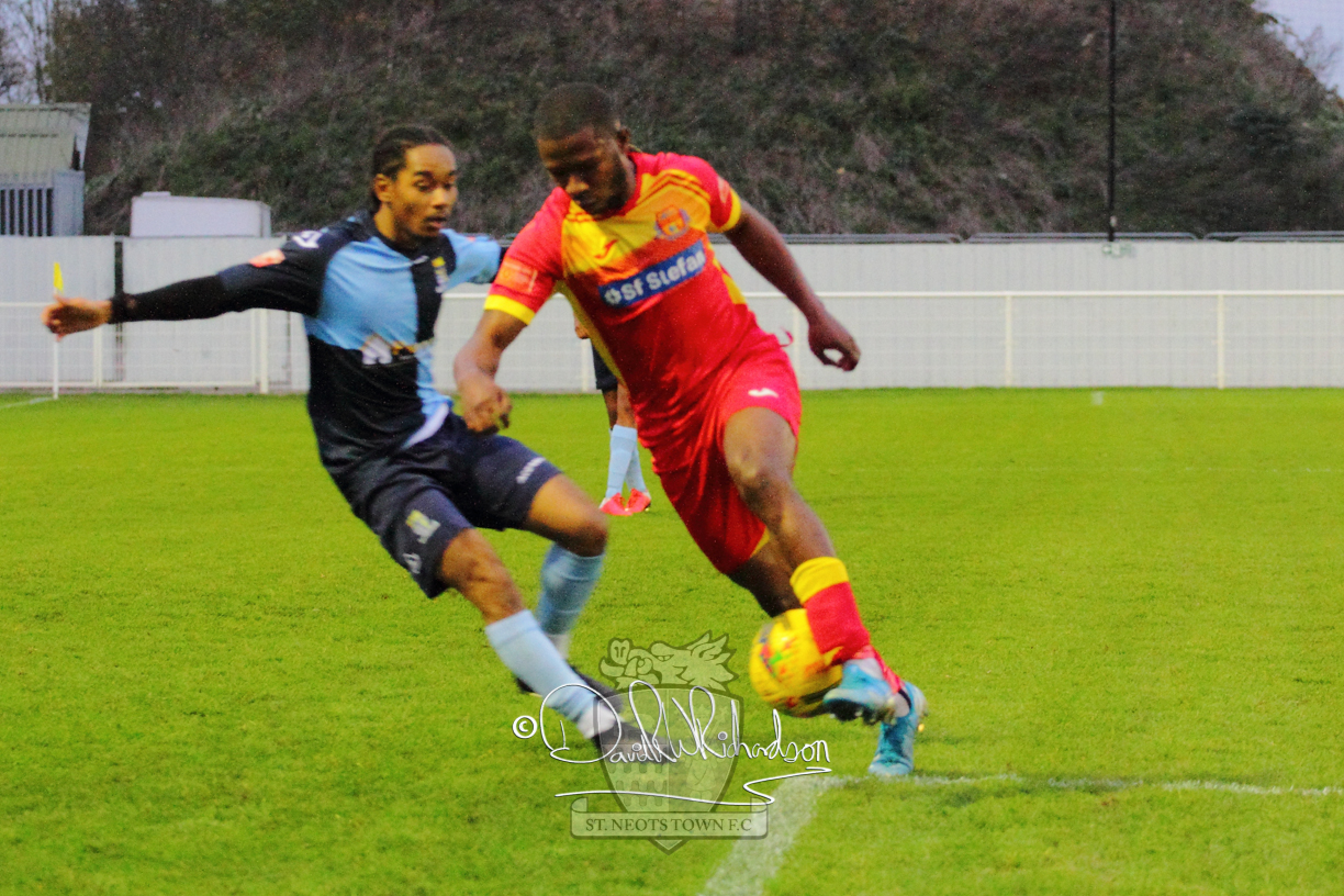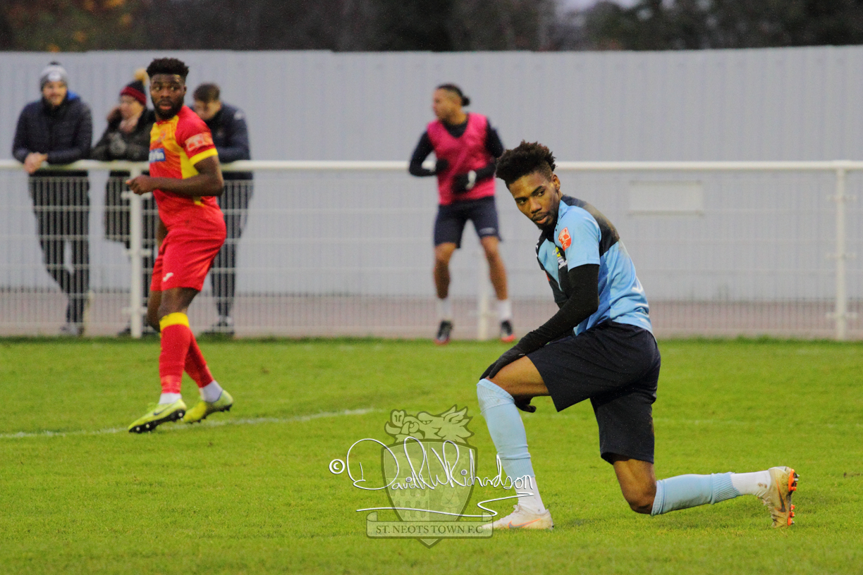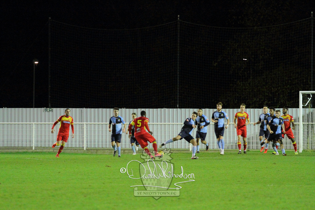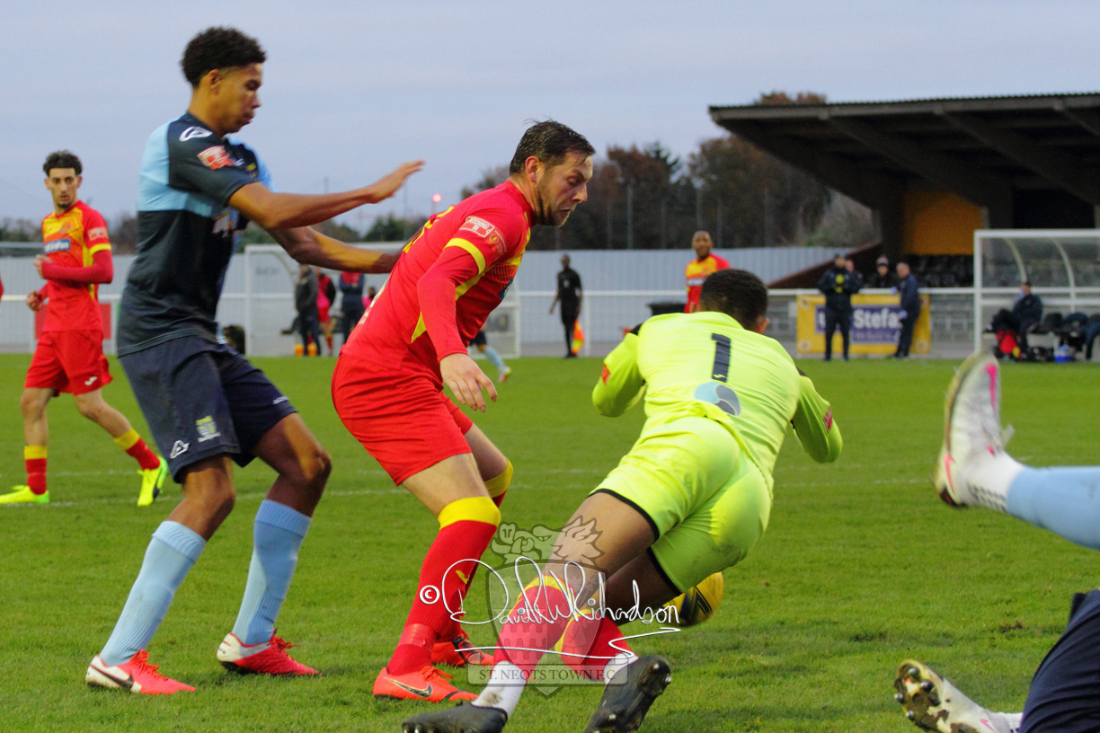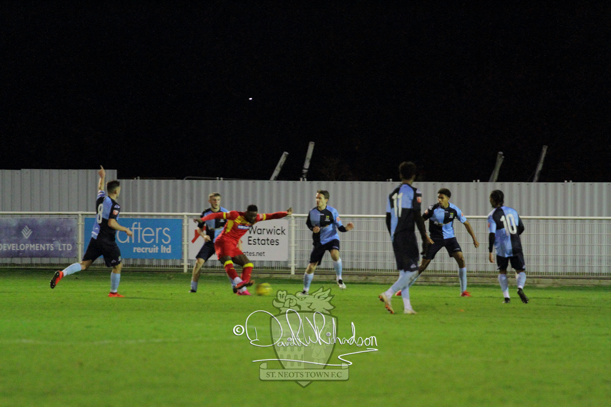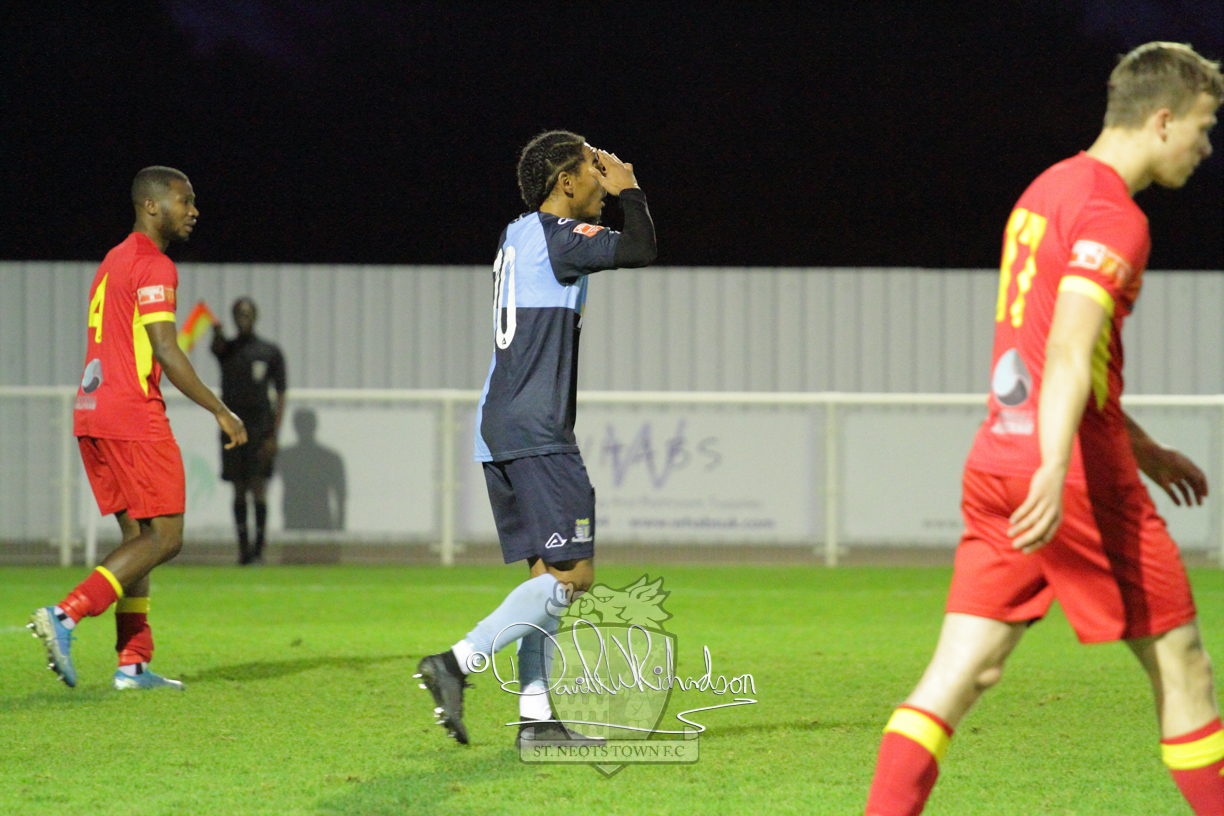 This most recent signing excited with his pace and skill and looks to be a very useful addition to the squad making an early impact after just six minutes as he rounded the home keeper to set up Myles Cowling but his shot from 25 yards sailed harmlessly over the crossbar. Four minutes later St Neots could have been behind as George Whitehall spilled a cross from Jonathan Edwards, but Charlie Johnson hacked the ball clear. Ky Marsh-Brown was then upended in the penalty area, but the referee waved play on whilst at the other end Olluwatobi Coker brought a full length save from Whitehall. His opposite number Lincon Marques then emulated him with an important save from a low Cowling effort and after 33 minutes Coker’s cross picked out the unmarked Anthony Edgar, but he miskicked with the goal at his mercy. Towards the end of the half St Neots were well in control and Ky Marsh-Brown was twice in significant action, bringing an important save from Marques before rounding off a mazy run through the home defence by shooting over the bar.