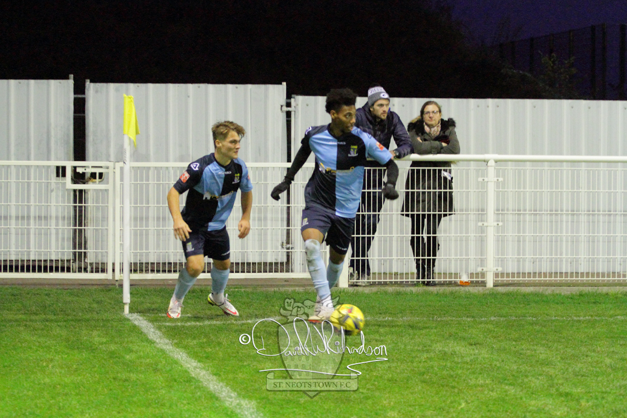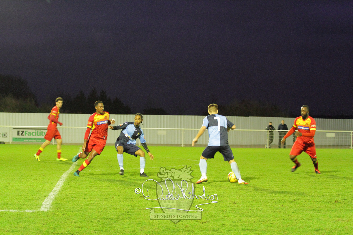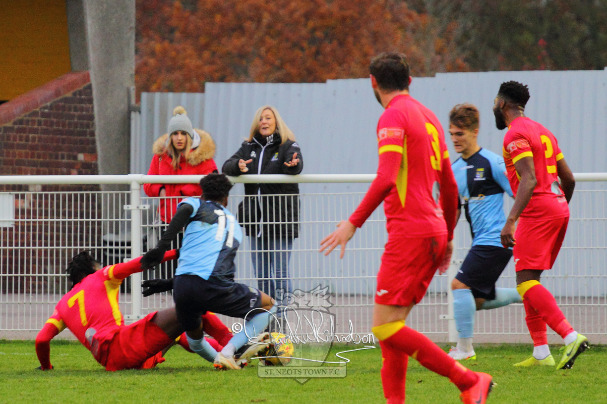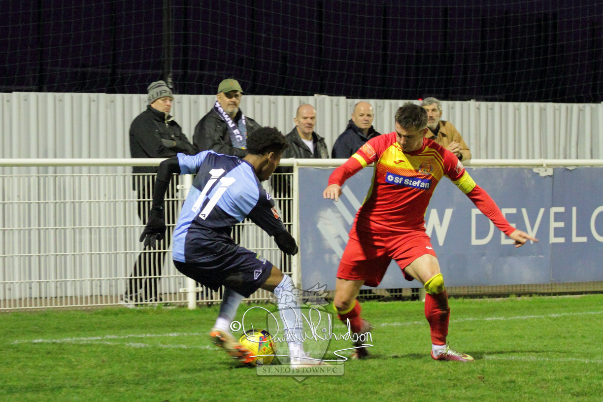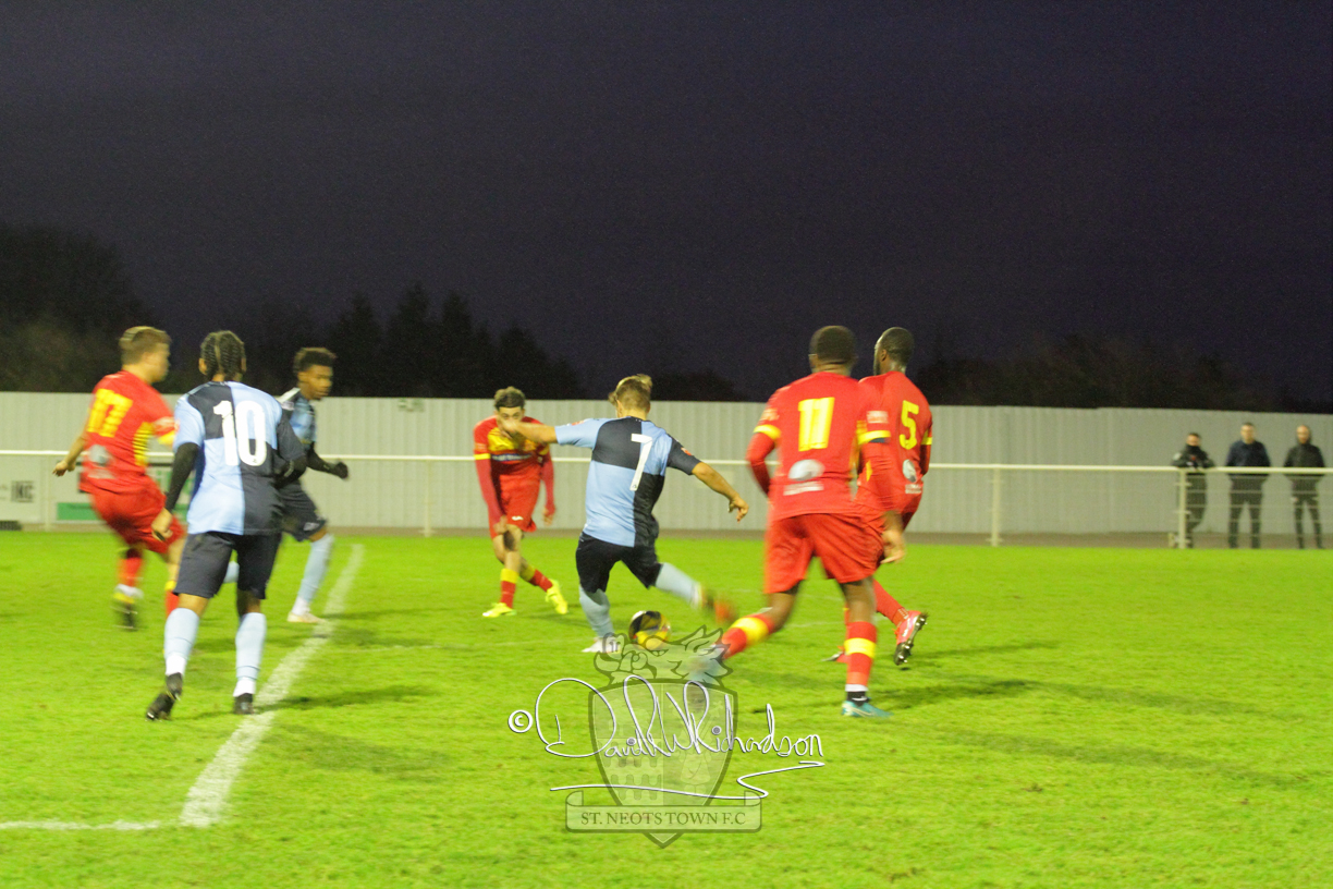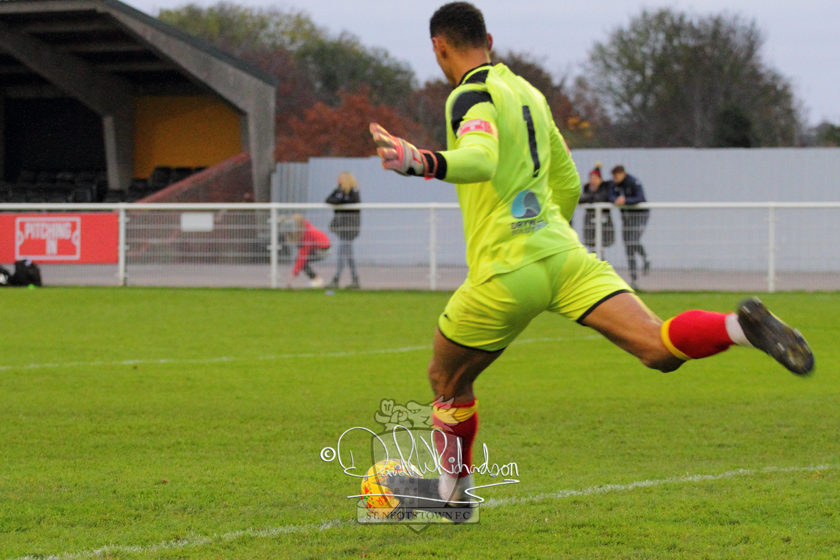 This most recent signing excited with his pace and skill and looks to be a very useful addition to the squad making an early impact after just six minutes as he rounded the home keeper to set up Myles Cowling but his shot from 25 yards sailed harmlessly over the crossbar. Four minutes later St Neots could have been behind as George Whitehall spilled a cross from Jonathan Edwards, but Charlie Johnson hacked the ball clear. Ky Marsh-Brown was then upended in the penalty area, but the referee waved play on whilst at the other end Olluwatobi Coker brought a full length save from Whitehall. His opposite number Lincon Marques then emulated him with an important save from a low Cowling effort and after 33 minutes Coker’s cross picked out the unmarked Anthony Edgar, but he miskicked with the goal at his mercy. Towards the end of the half St Neots were well in control and Ky Marsh-Brown was twice in significant action, bringing an important save from Marques before rounding off a mazy run through the home defence by shooting over the bar.