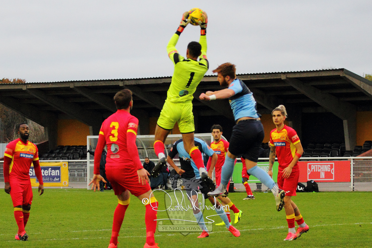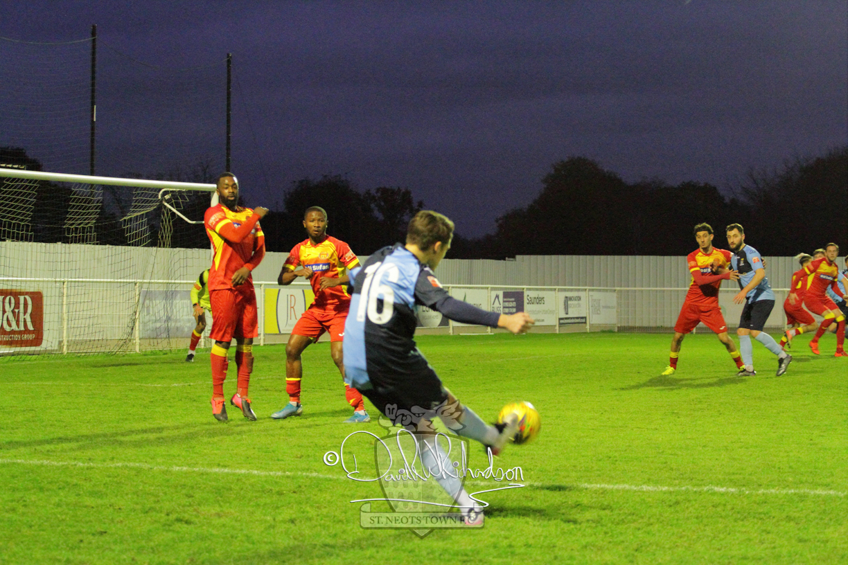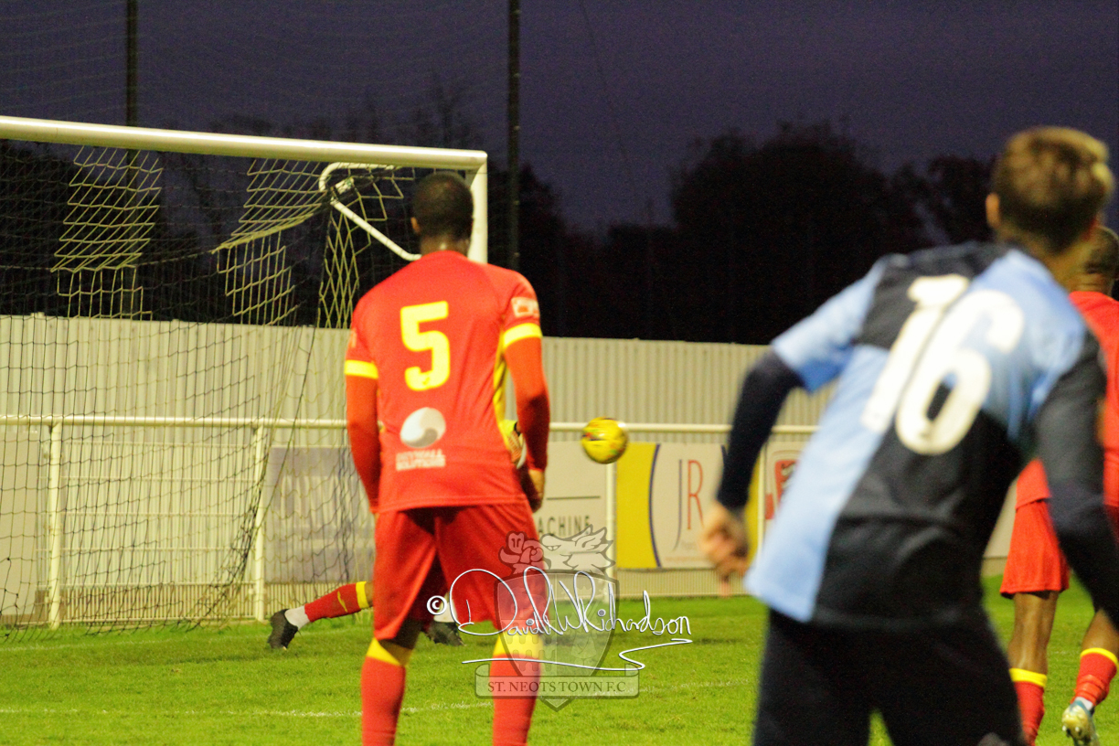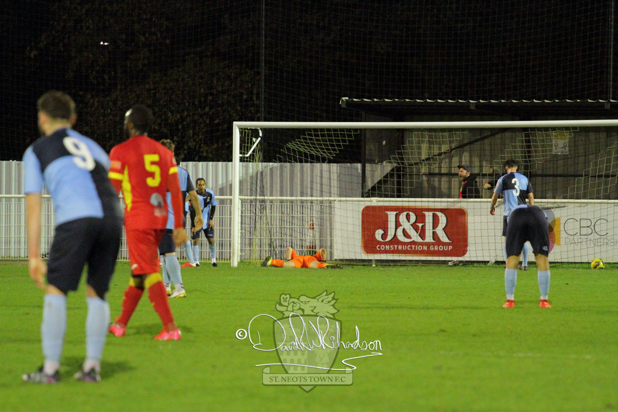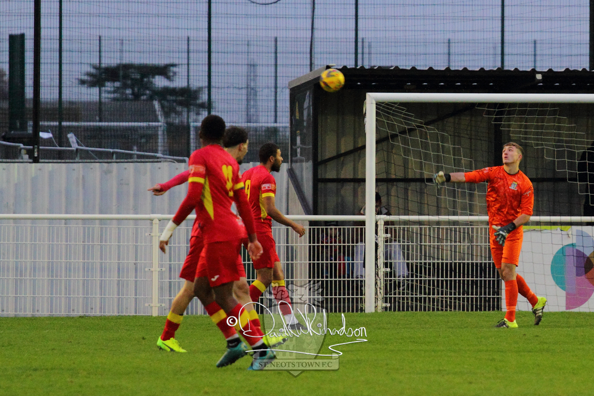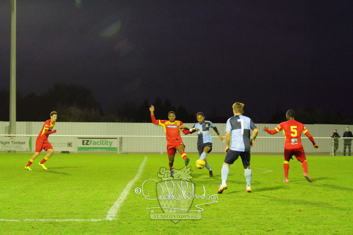 This most recent signing excited with his pace and skill and looks to be a very useful addition to the squad making an early impact after just six minutes as he rounded the home keeper to set up Myles Cowling but his shot from 25 yards sailed harmlessly over the crossbar. Four minutes later St Neots could have been behind as George Whitehall spilled a cross from Jonathan Edwards, but Charlie Johnson hacked the ball clear. Ky Marsh-Brown was then upended in the penalty area, but the referee waved play on whilst at the other end Olluwatobi Coker brought a full length save from Whitehall. His opposite number Lincon Marques then emulated him with an important save from a low Cowling effort and after 33 minutes Coker’s cross picked out the unmarked Anthony Edgar, but he miskicked with the goal at his mercy. Towards the end of the half St Neots were well in control and Ky Marsh-Brown was twice in significant action, bringing an important save from Marques before rounding off a mazy run through the home defence by shooting over the bar.