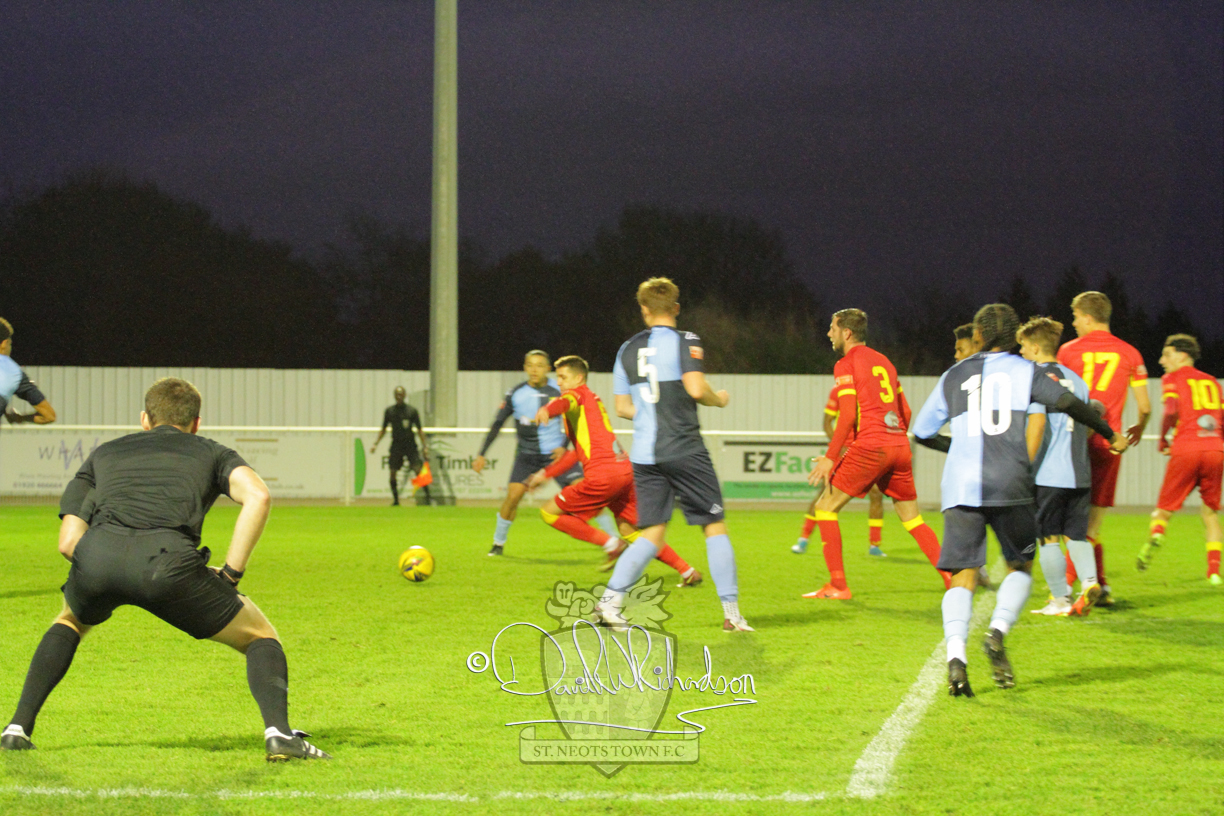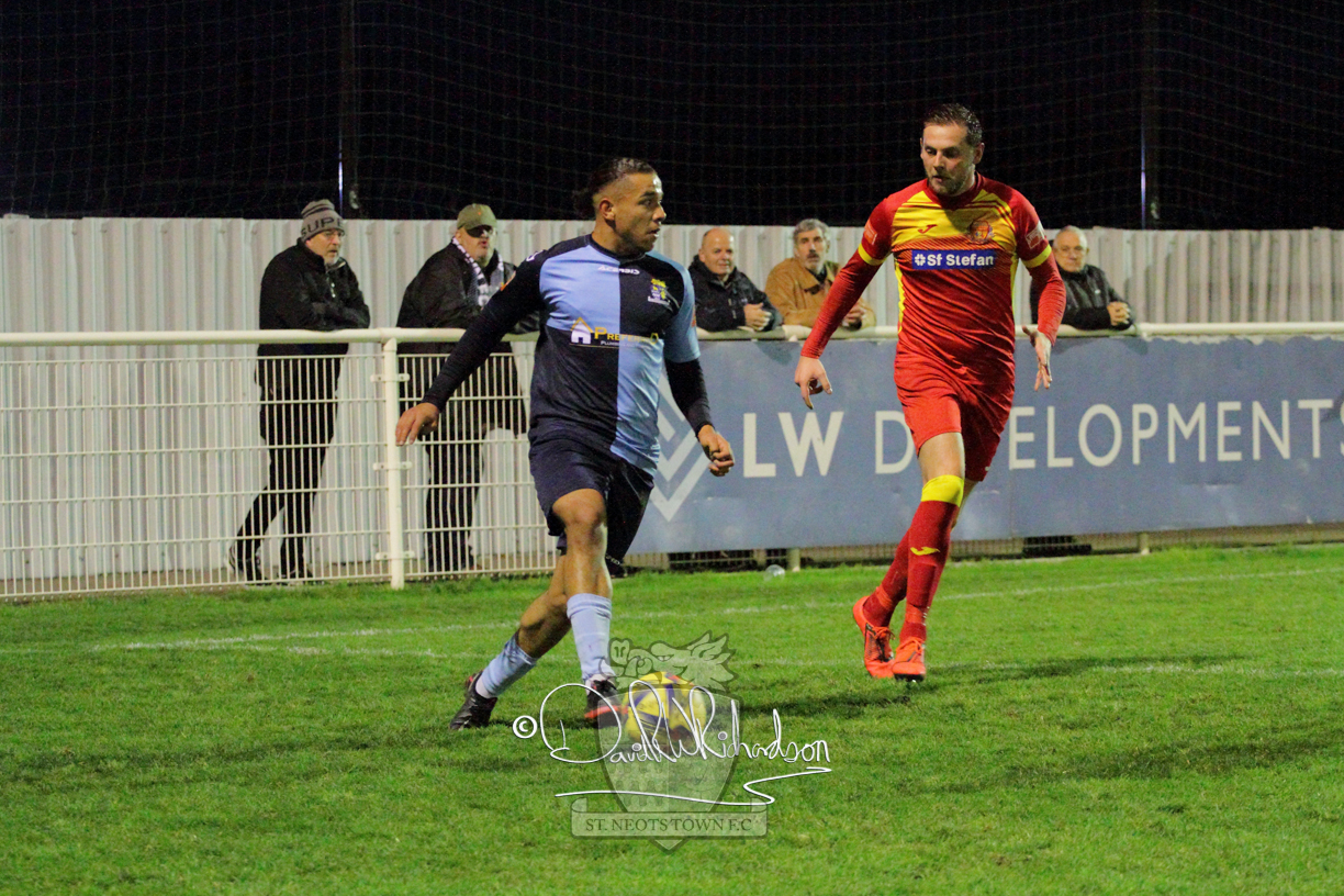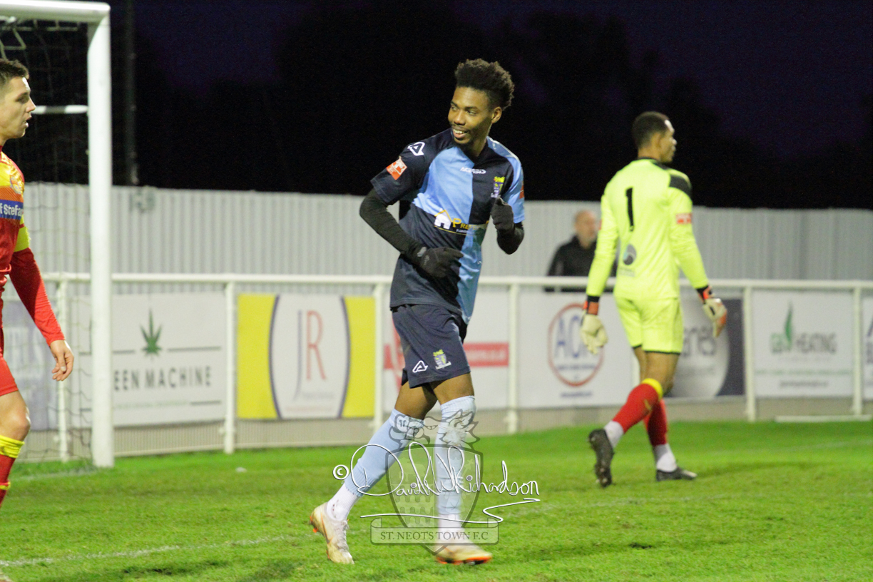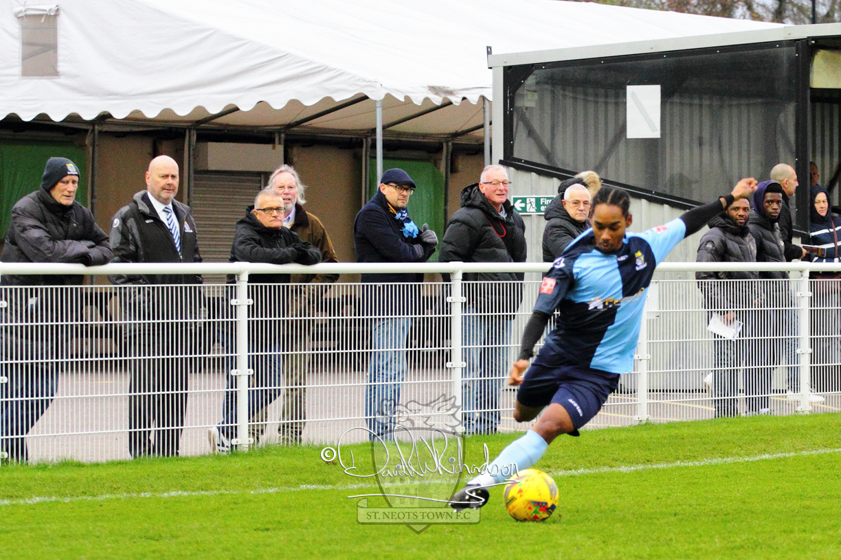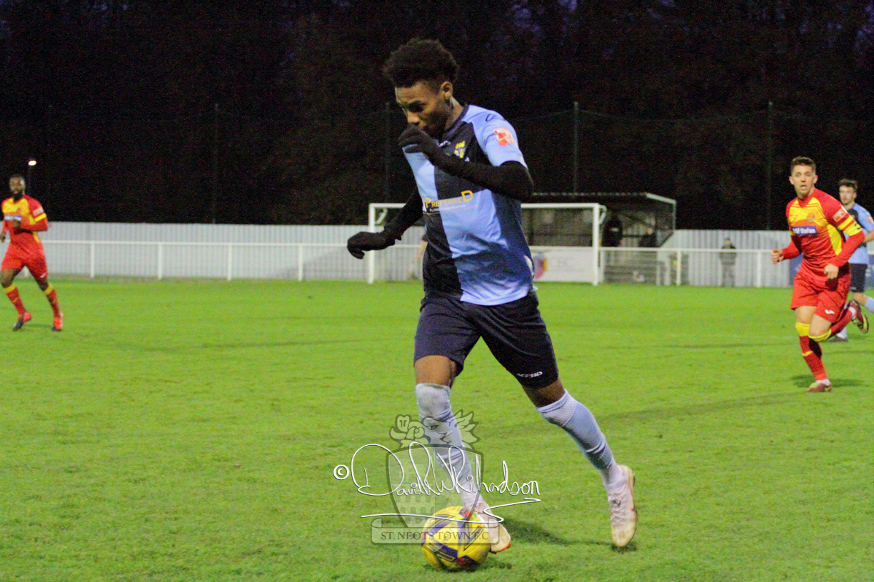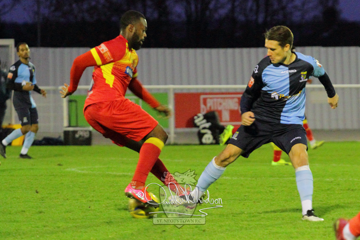 This most recent signing excited with his pace and skill and looks to be a very useful addition to the squad making an early impact after just six minutes as he rounded the home keeper to set up Myles Cowling but his shot from 25 yards sailed harmlessly over the crossbar. Four minutes later St Neots could have been behind as George Whitehall spilled a cross from Jonathan Edwards, but Charlie Johnson hacked the ball clear. Ky Marsh-Brown was then upended in the penalty area, but the referee waved play on whilst at the other end Olluwatobi Coker brought a full length save from Whitehall. His opposite number Lincon Marques then emulated him with an important save from a low Cowling effort and after 33 minutes Coker’s cross picked out the unmarked Anthony Edgar, but he miskicked with the goal at his mercy. Towards the end of the half St Neots were well in control and Ky Marsh-Brown was twice in significant action, bringing an important save from Marques before rounding off a mazy run through the home defence by shooting over the bar.