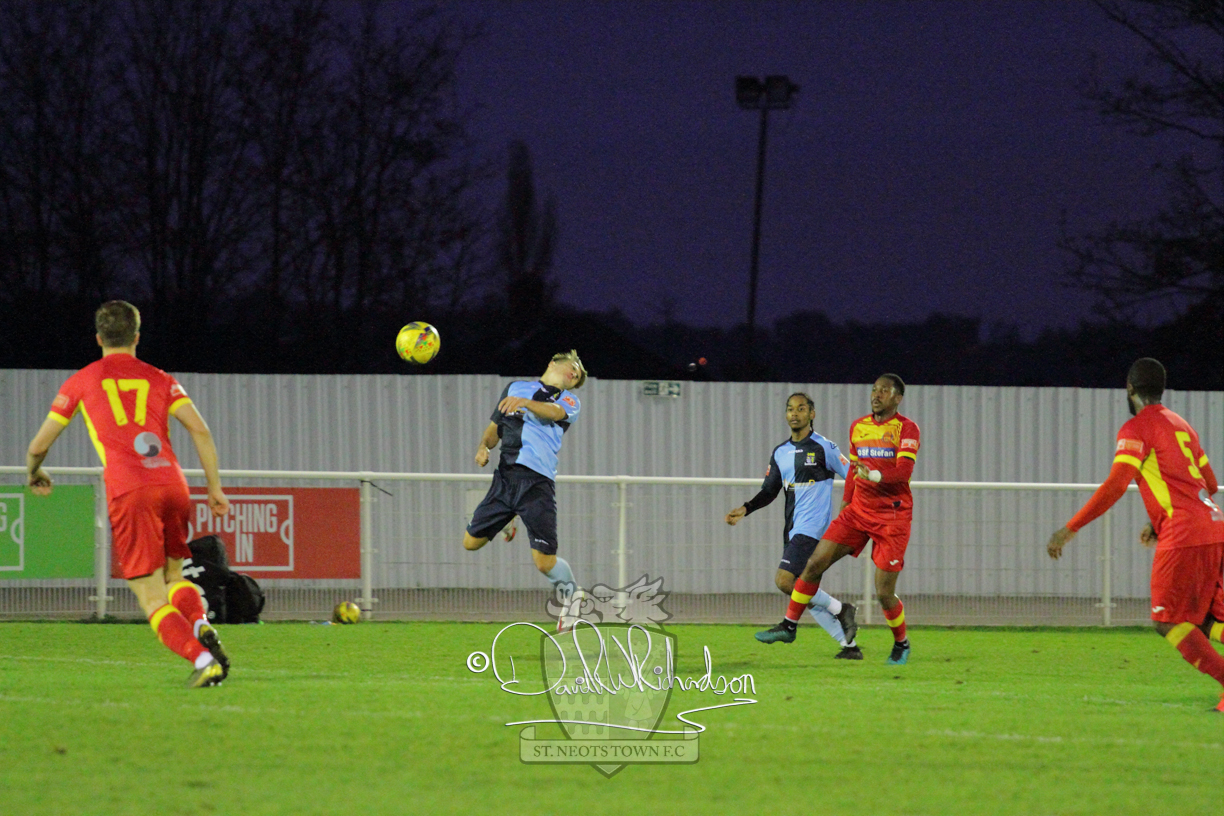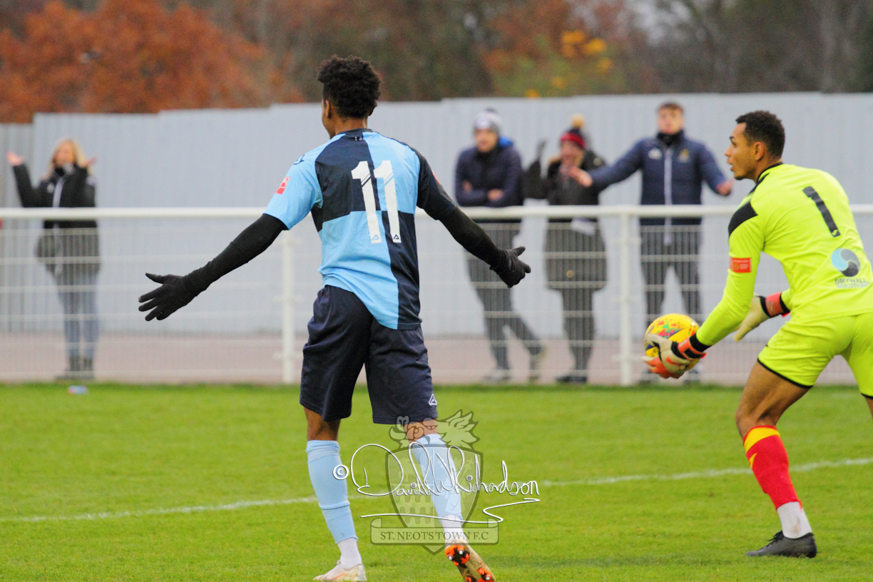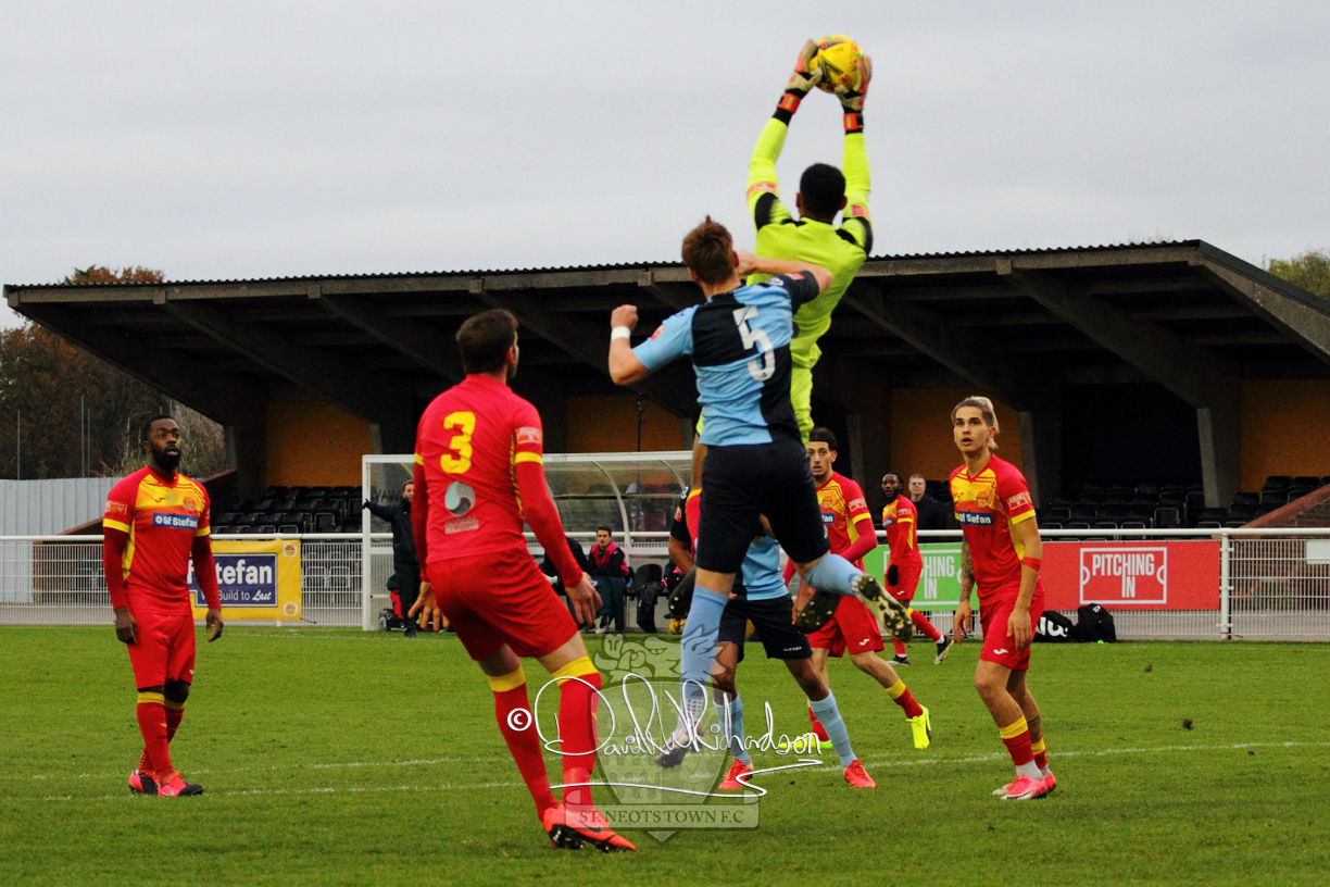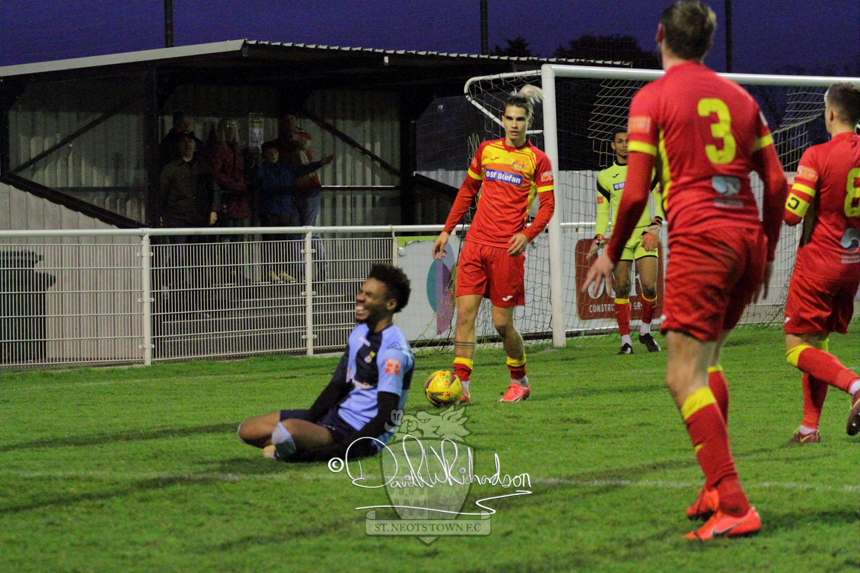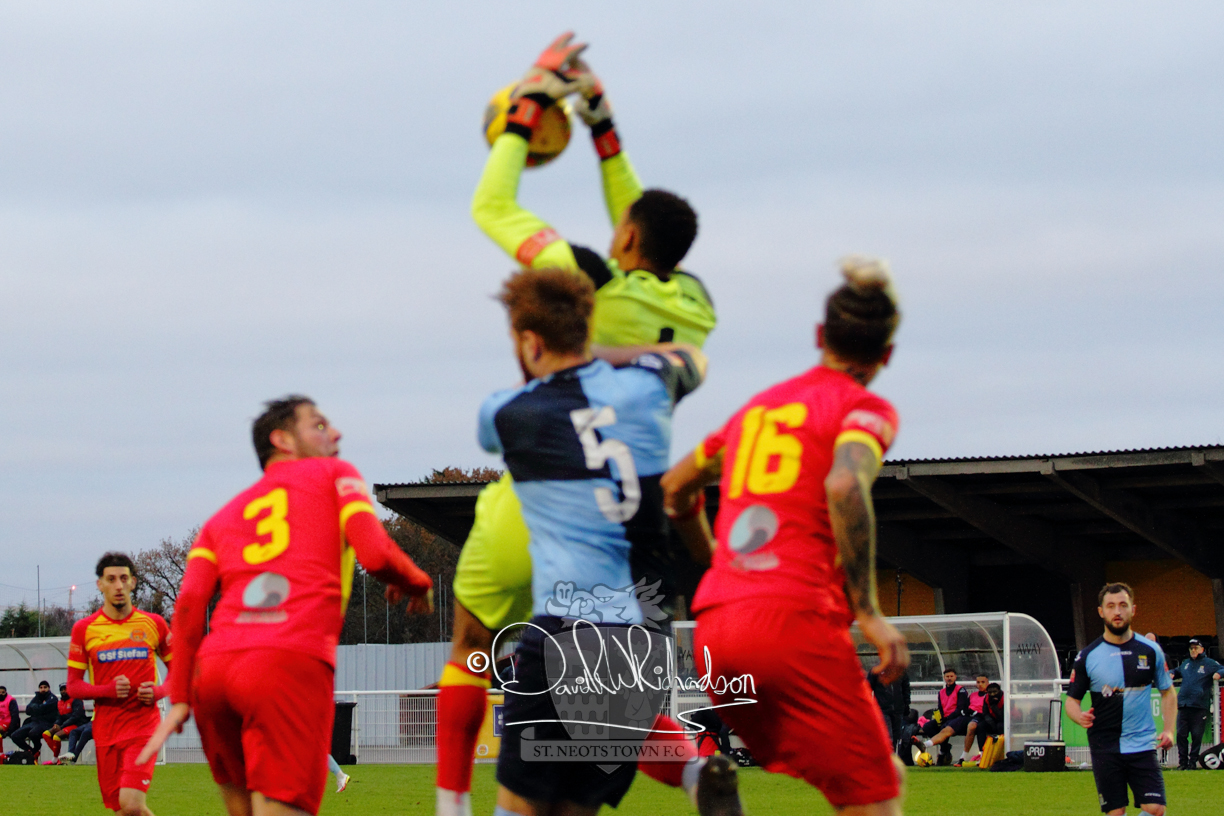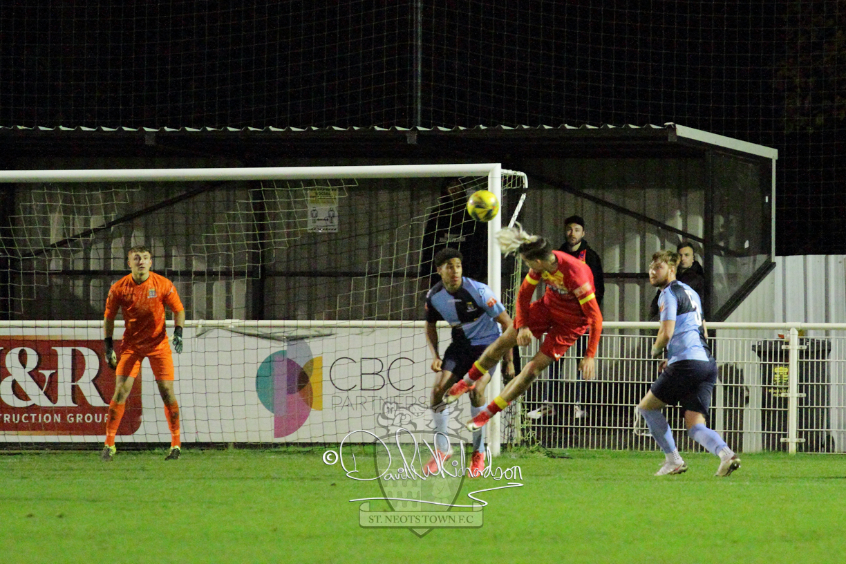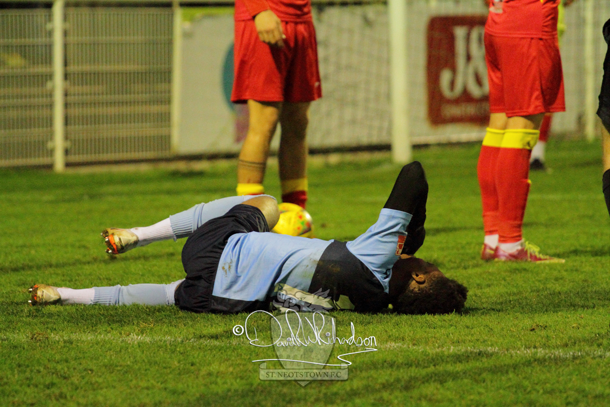 This most recent signing excited with his pace and skill and looks to be a very useful addition to the squad making an early impact after just six minutes as he rounded the home keeper to set up Myles Cowling but his shot from 25 yards sailed harmlessly over the crossbar. Four minutes later St Neots could have been behind as George Whitehall spilled a cross from Jonathan Edwards, but Charlie Johnson hacked the ball clear. Ky Marsh-Brown was then upended in the penalty area, but the referee waved play on whilst at the other end Olluwatobi Coker brought a full length save from Whitehall. His opposite number Lincon Marques then emulated him with an important save from a low Cowling effort and after 33 minutes Coker’s cross picked out the unmarked Anthony Edgar, but he miskicked with the goal at his mercy. Towards the end of the half St Neots were well in control and Ky Marsh-Brown was twice in significant action, bringing an important save from Marques before rounding off a mazy run through the home defence by shooting over the bar.