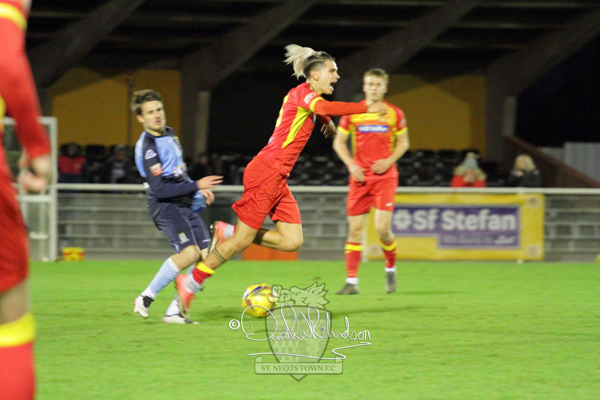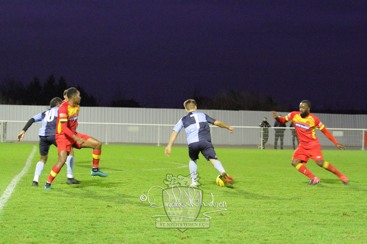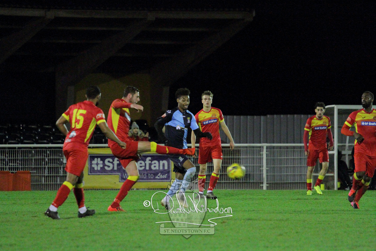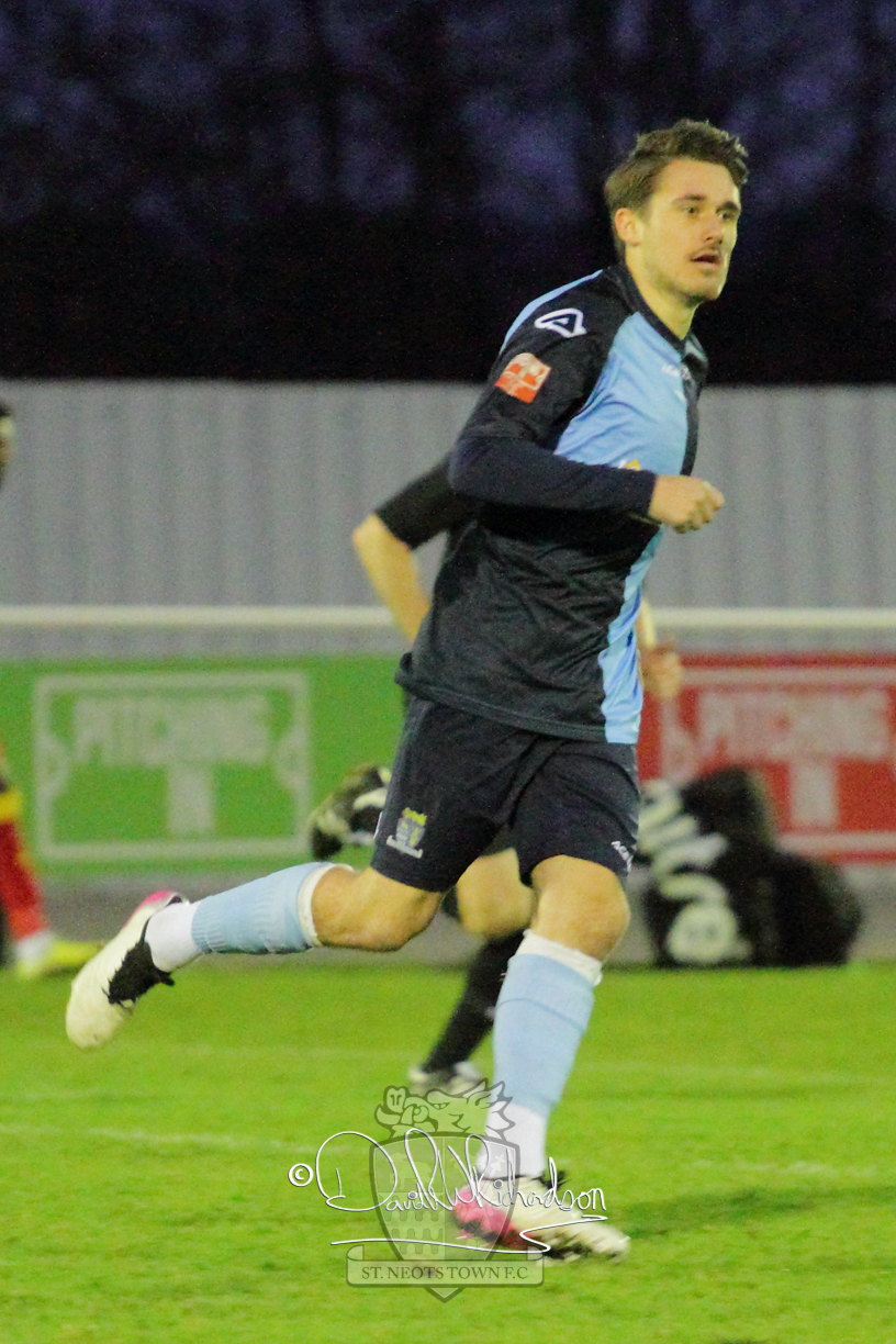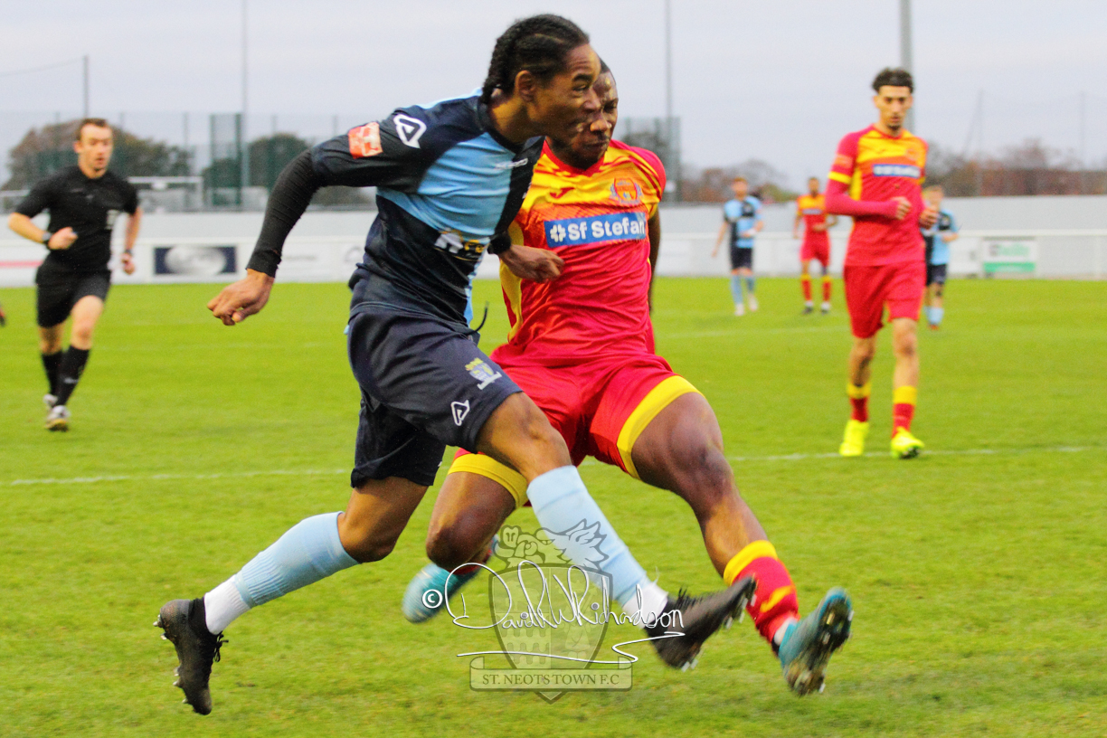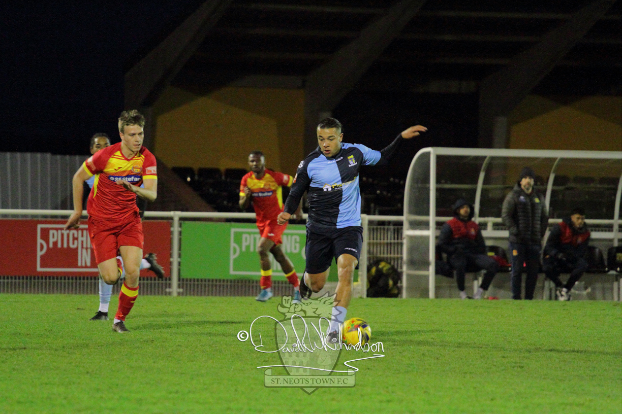 This most recent signing excited with his pace and skill and looks to be a very useful addition to the squad making an early impact after just six minutes as he rounded the home keeper to set up Myles Cowling but his shot from 25 yards sailed harmlessly over the crossbar. Four minutes later St Neots could have been behind as George Whitehall spilled a cross from Jonathan Edwards, but Charlie Johnson hacked the ball clear. Ky Marsh-Brown was then upended in the penalty area, but the referee waved play on whilst at the other end Olluwatobi Coker brought a full length save from Whitehall. His opposite number Lincon Marques then emulated him with an important save from a low Cowling effort and after 33 minutes Coker’s cross picked out the unmarked Anthony Edgar, but he miskicked with the goal at his mercy. Towards the end of the half St Neots were well in control and Ky Marsh-Brown was twice in significant action, bringing an important save from Marques before rounding off a mazy run through the home defence by shooting over the bar.