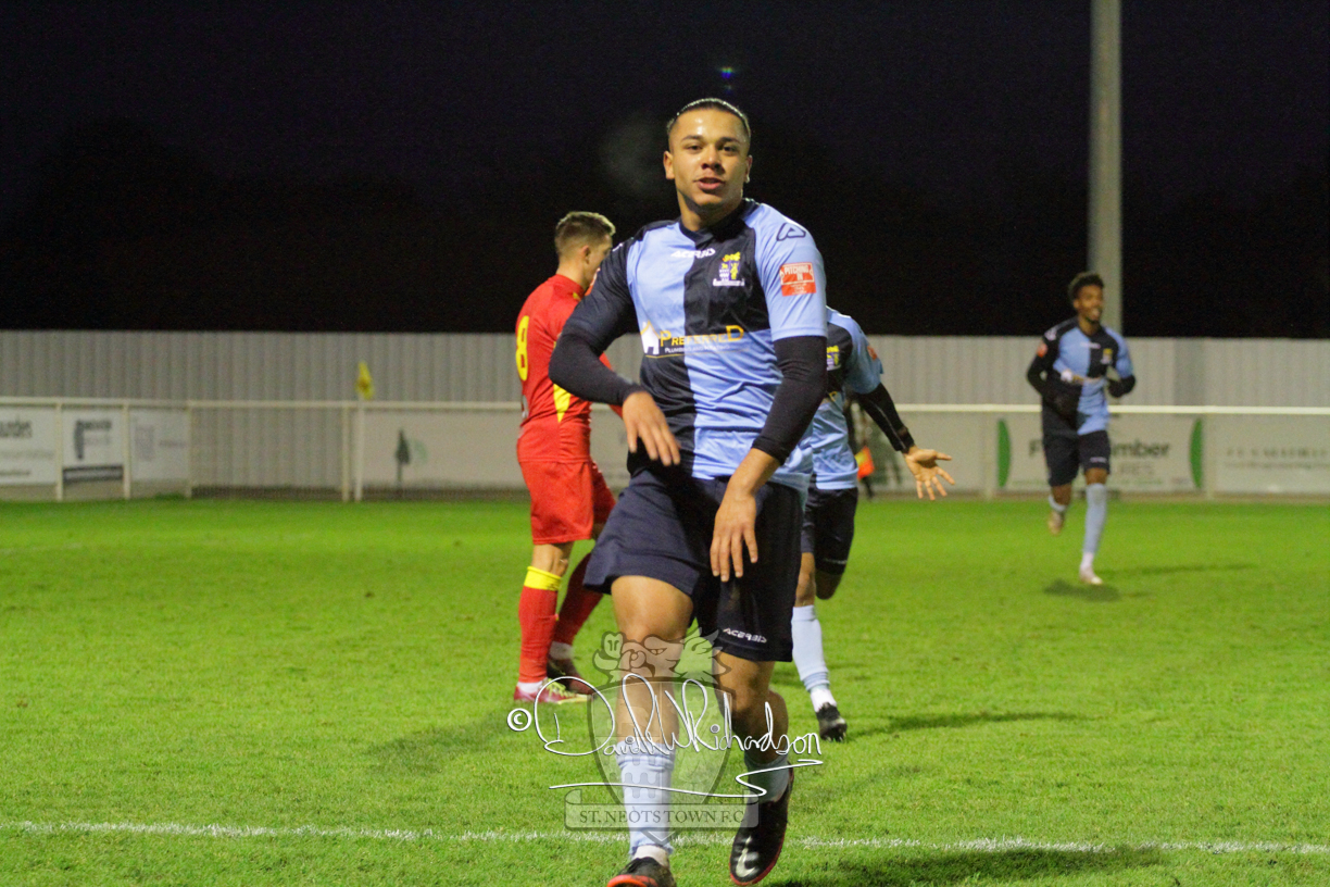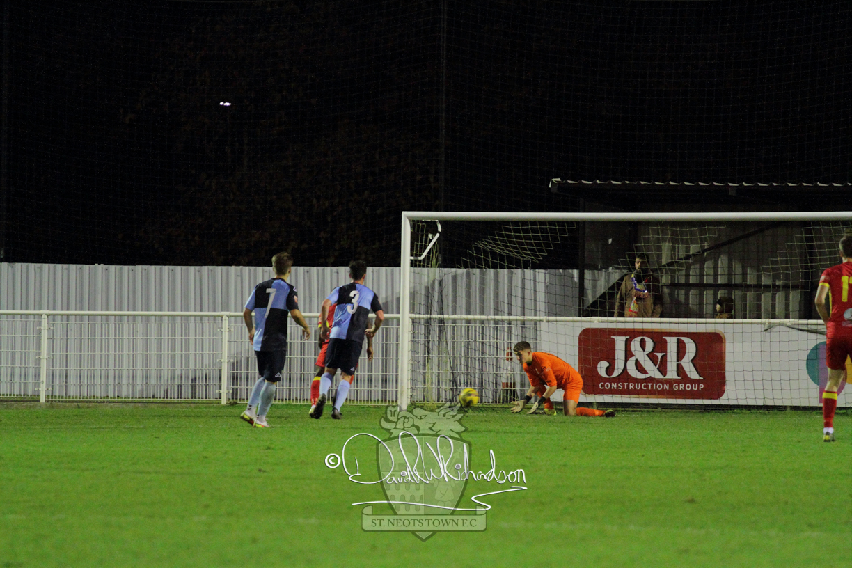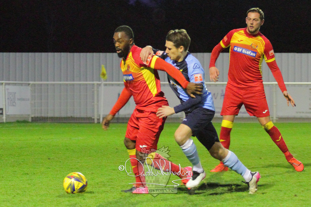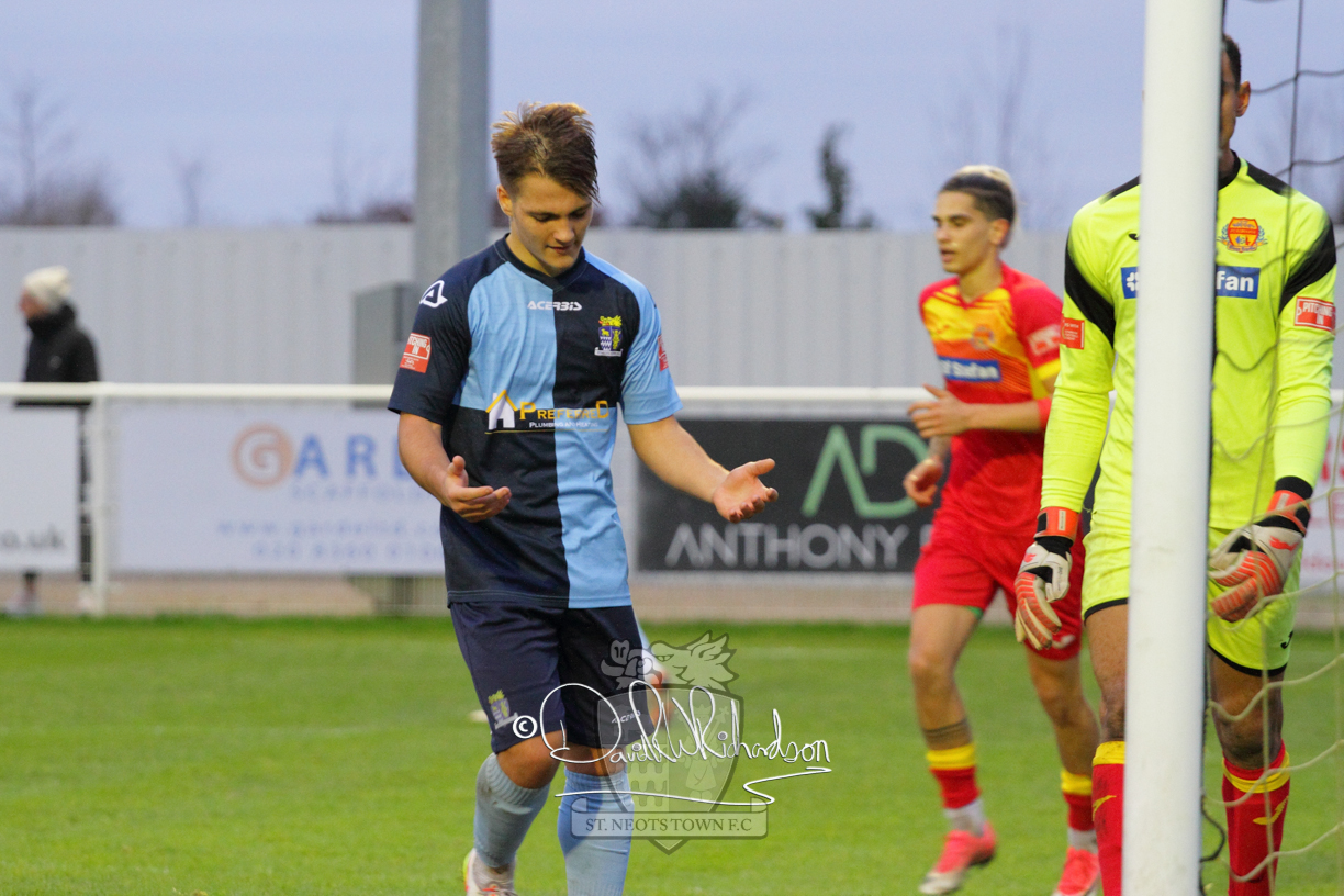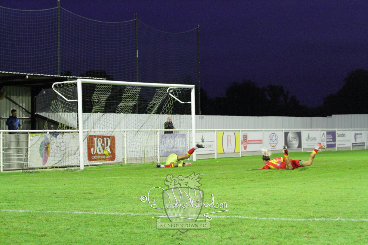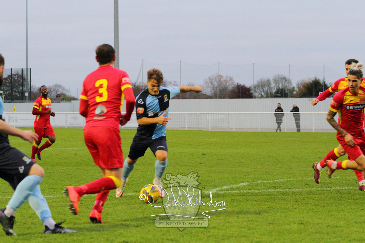 This most recent signing excited with his pace and skill and looks to be a very useful addition to the squad making an early impact after just six minutes as he rounded the home keeper to set up Myles Cowling but his shot from 25 yards sailed harmlessly over the crossbar. Four minutes later St Neots could have been behind as George Whitehall spilled a cross from Jonathan Edwards, but Charlie Johnson hacked the ball clear. Ky Marsh-Brown was then upended in the penalty area, but the referee waved play on whilst at the other end Olluwatobi Coker brought a full length save from Whitehall. His opposite number Lincon Marques then emulated him with an important save from a low Cowling effort and after 33 minutes Coker’s cross picked out the unmarked Anthony Edgar, but he miskicked with the goal at his mercy. Towards the end of the half St Neots were well in control and Ky Marsh-Brown was twice in significant action, bringing an important save from Marques before rounding off a mazy run through the home defence by shooting over the bar.