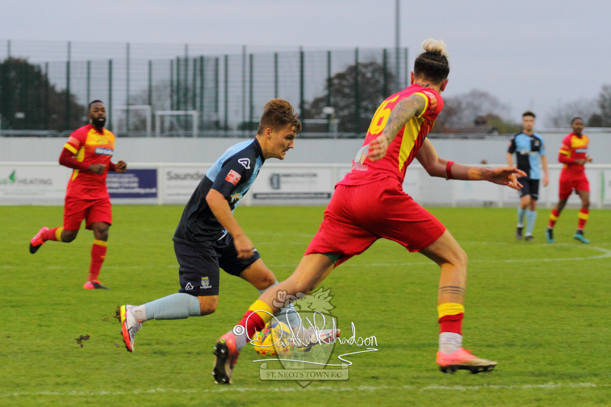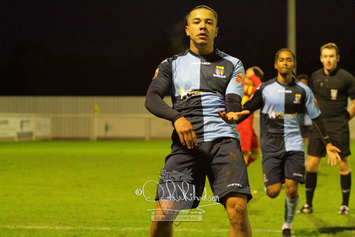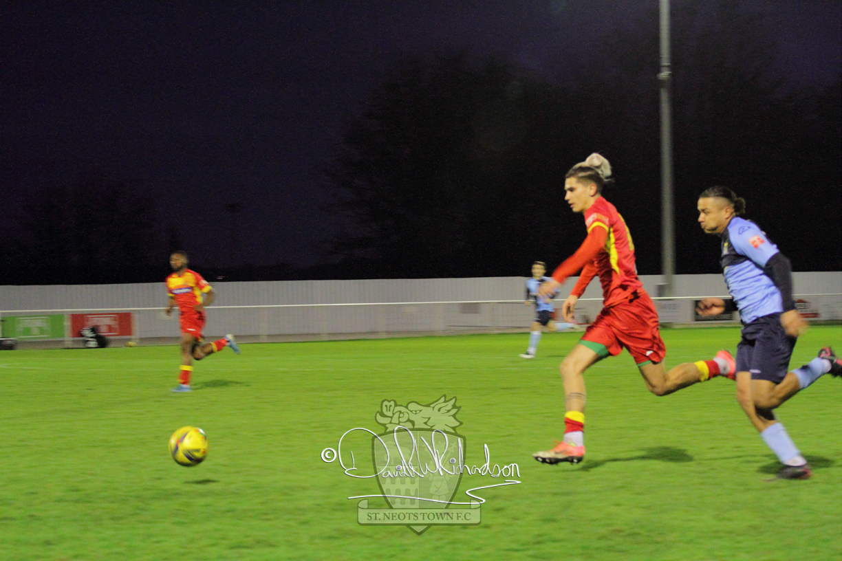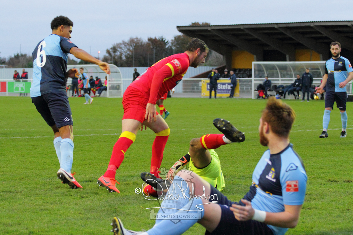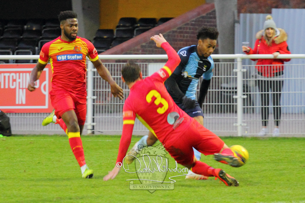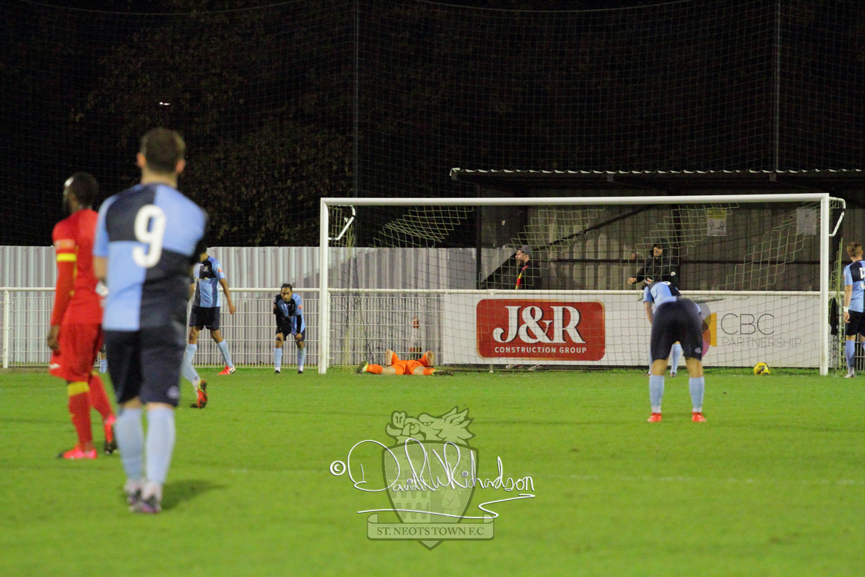 This most recent signing excited with his pace and skill and looks to be a very useful addition to the squad making an early impact after just six minutes as he rounded the home keeper to set up Myles Cowling but his shot from 25 yards sailed harmlessly over the crossbar. Four minutes later St Neots could have been behind as George Whitehall spilled a cross from Jonathan Edwards, but Charlie Johnson hacked the ball clear. Ky Marsh-Brown was then upended in the penalty area, but the referee waved play on whilst at the other end Olluwatobi Coker brought a full length save from Whitehall. His opposite number Lincon Marques then emulated him with an important save from a low Cowling effort and after 33 minutes Coker’s cross picked out the unmarked Anthony Edgar, but he miskicked with the goal at his mercy. Towards the end of the half St Neots were well in control and Ky Marsh-Brown was twice in significant action, bringing an important save from Marques before rounding off a mazy run through the home defence by shooting over the bar.