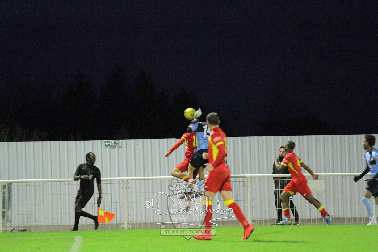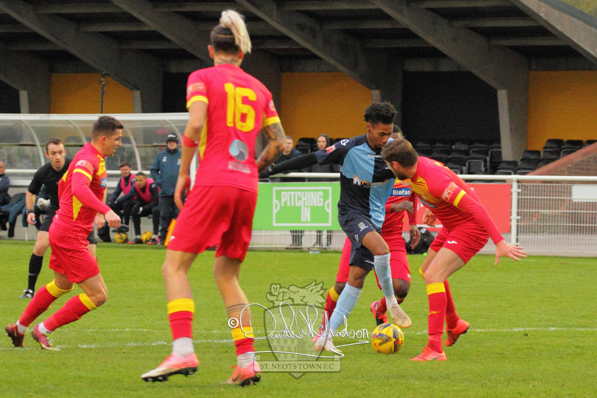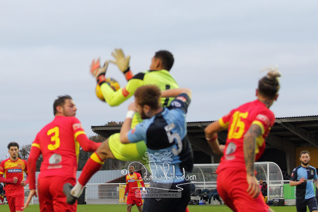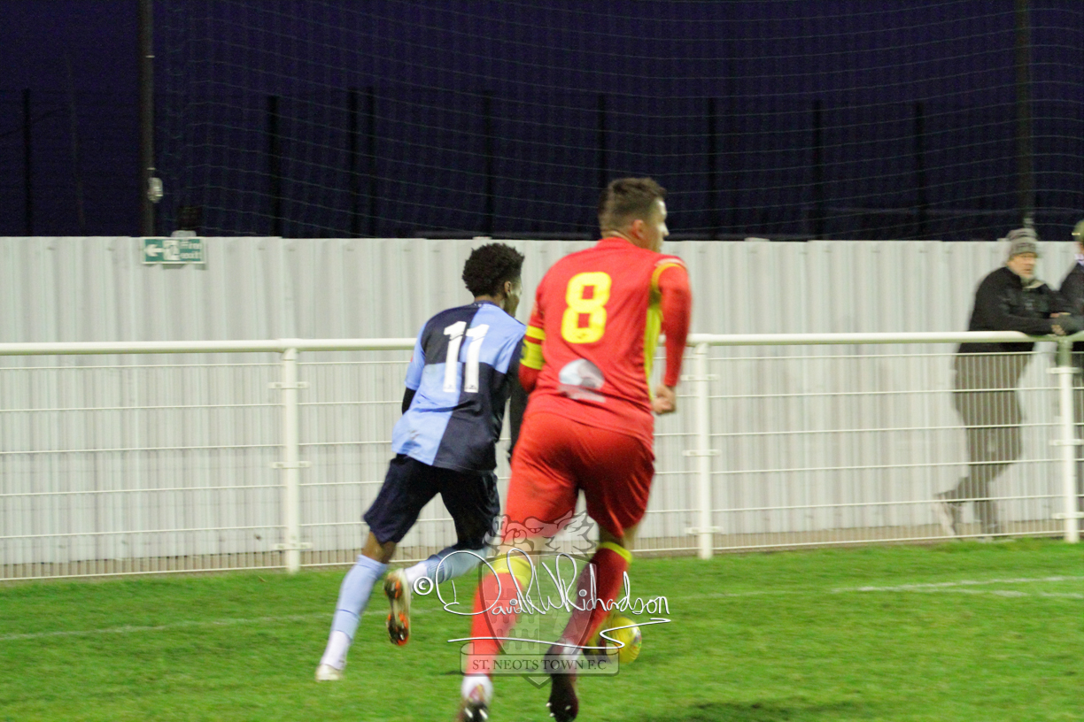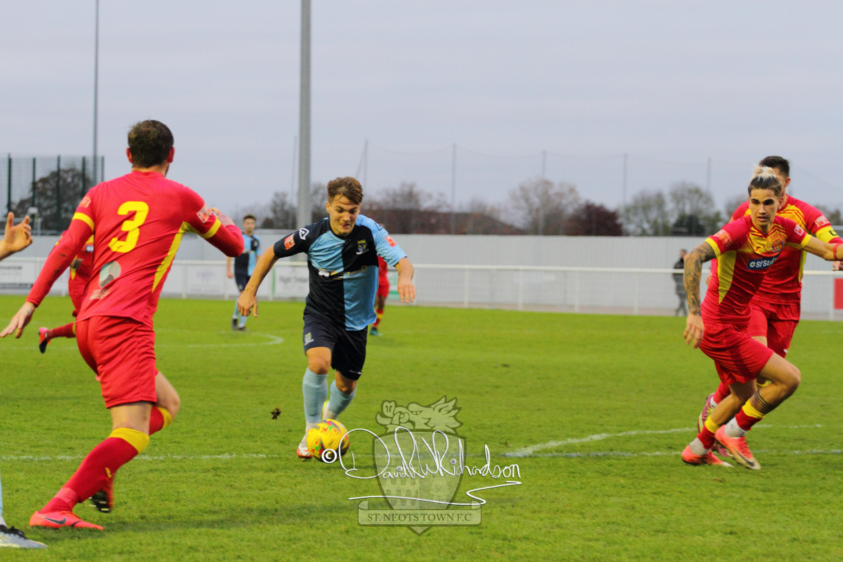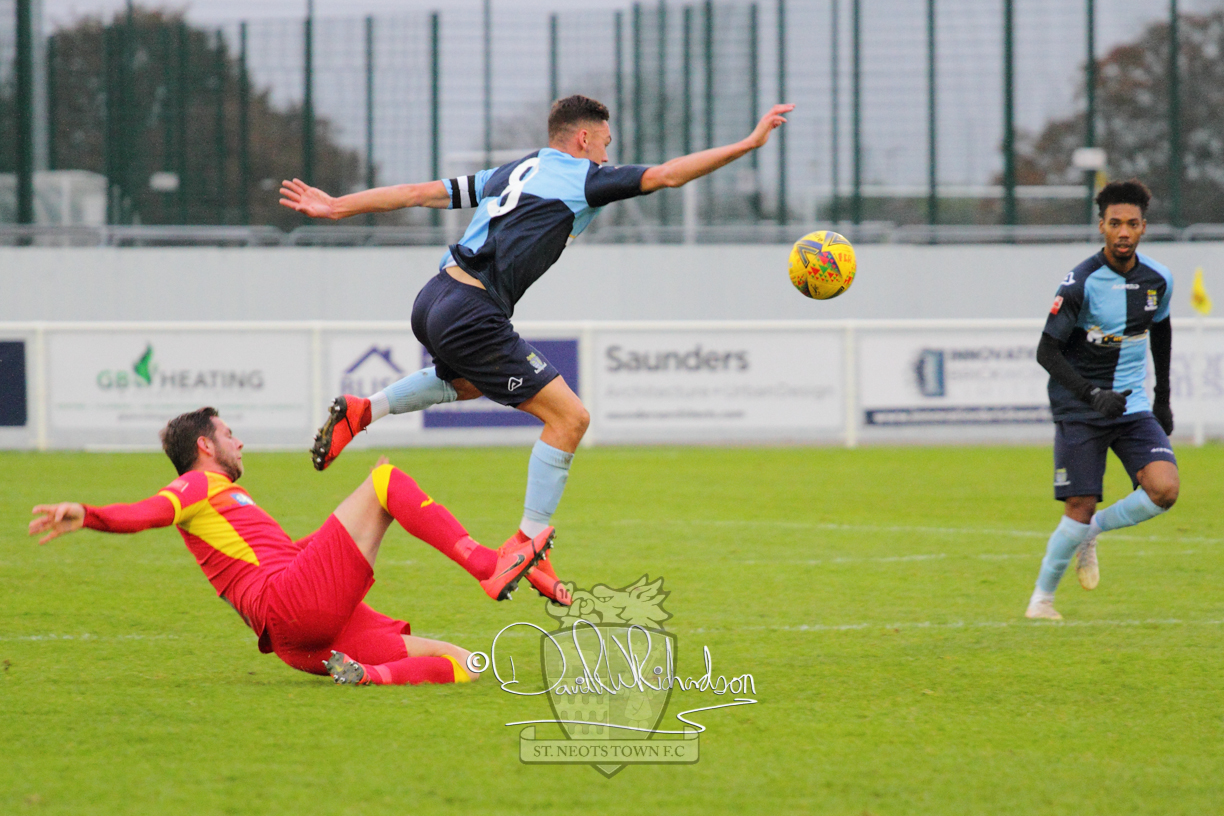 This most recent signing excited with his pace and skill and looks to be a very useful addition to the squad making an early impact after just six minutes as he rounded the home keeper to set up Myles Cowling but his shot from 25 yards sailed harmlessly over the crossbar. Four minutes later St Neots could have been behind as George Whitehall spilled a cross from Jonathan Edwards, but Charlie Johnson hacked the ball clear. Ky Marsh-Brown was then upended in the penalty area, but the referee waved play on whilst at the other end Olluwatobi Coker brought a full length save from Whitehall. His opposite number Lincon Marques then emulated him with an important save from a low Cowling effort and after 33 minutes Coker’s cross picked out the unmarked Anthony Edgar, but he miskicked with the goal at his mercy. Towards the end of the half St Neots were well in control and Ky Marsh-Brown was twice in significant action, bringing an important save from Marques before rounding off a mazy run through the home defence by shooting over the bar.