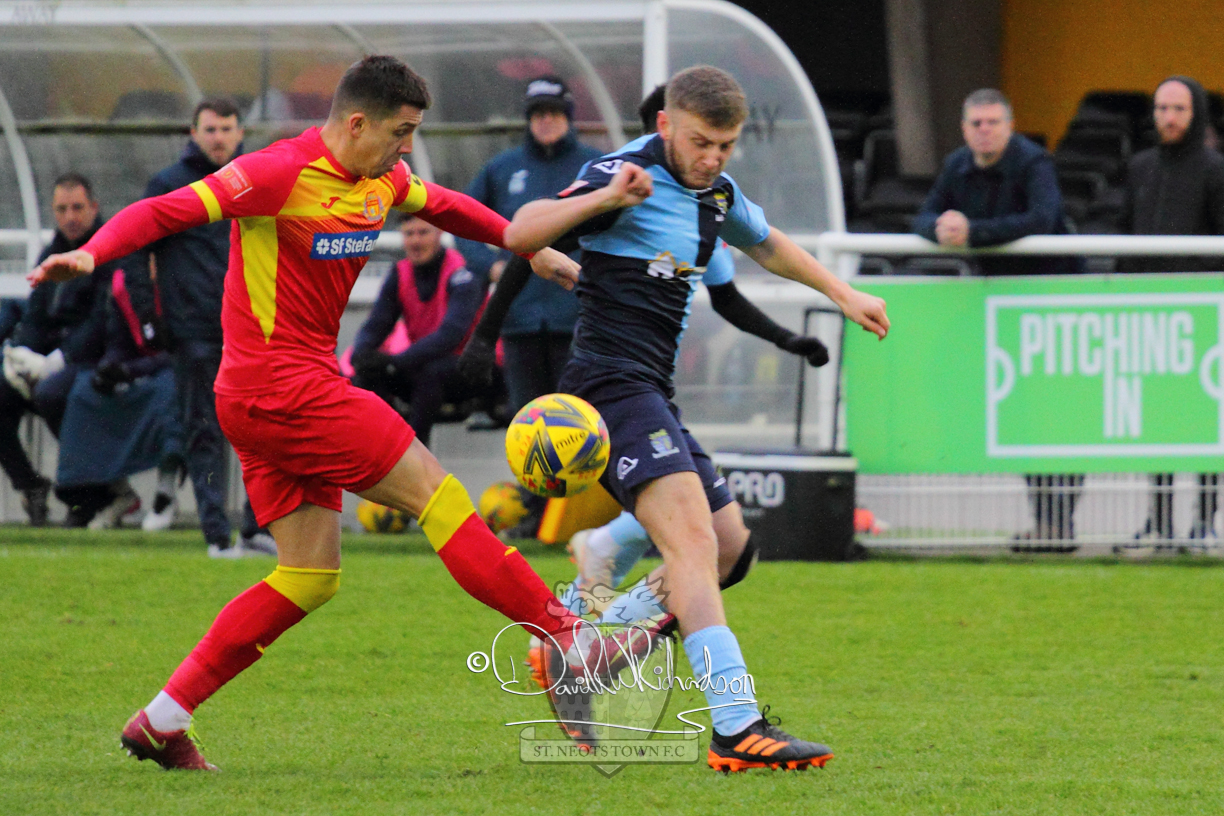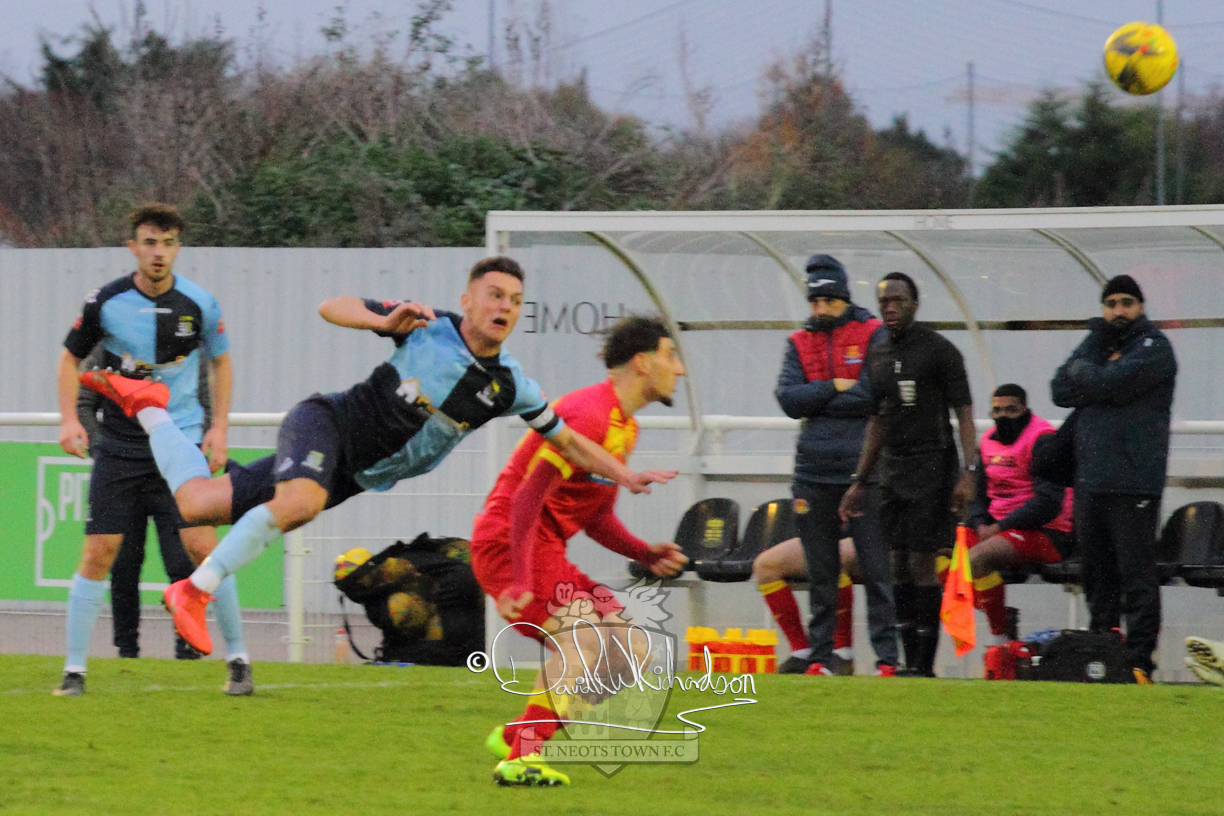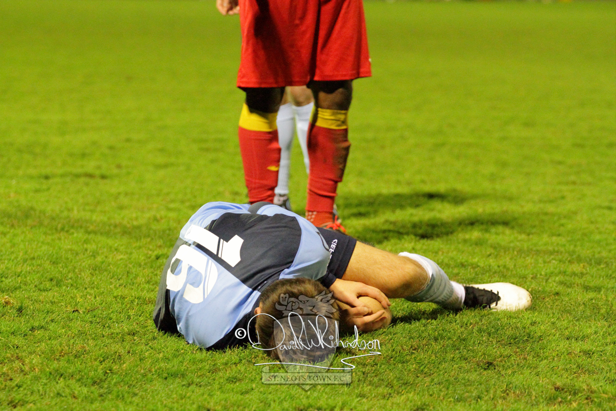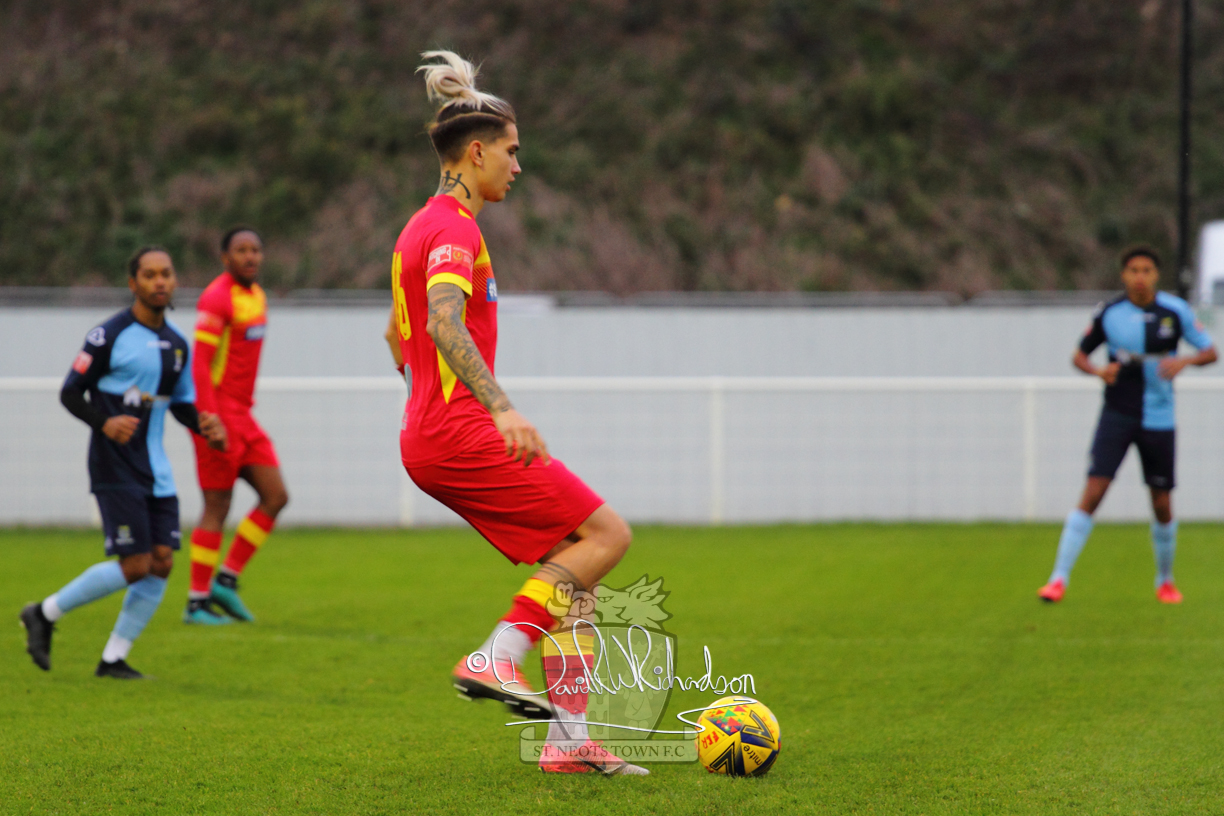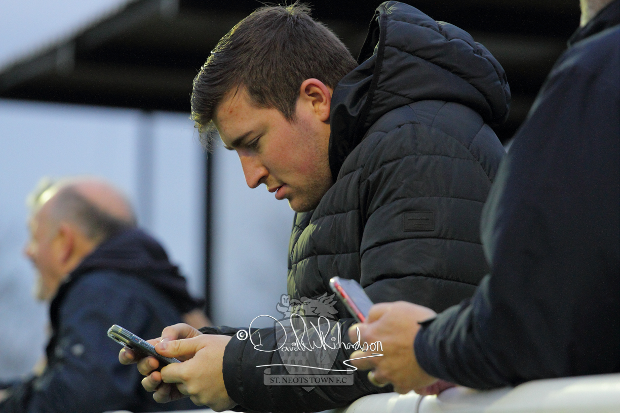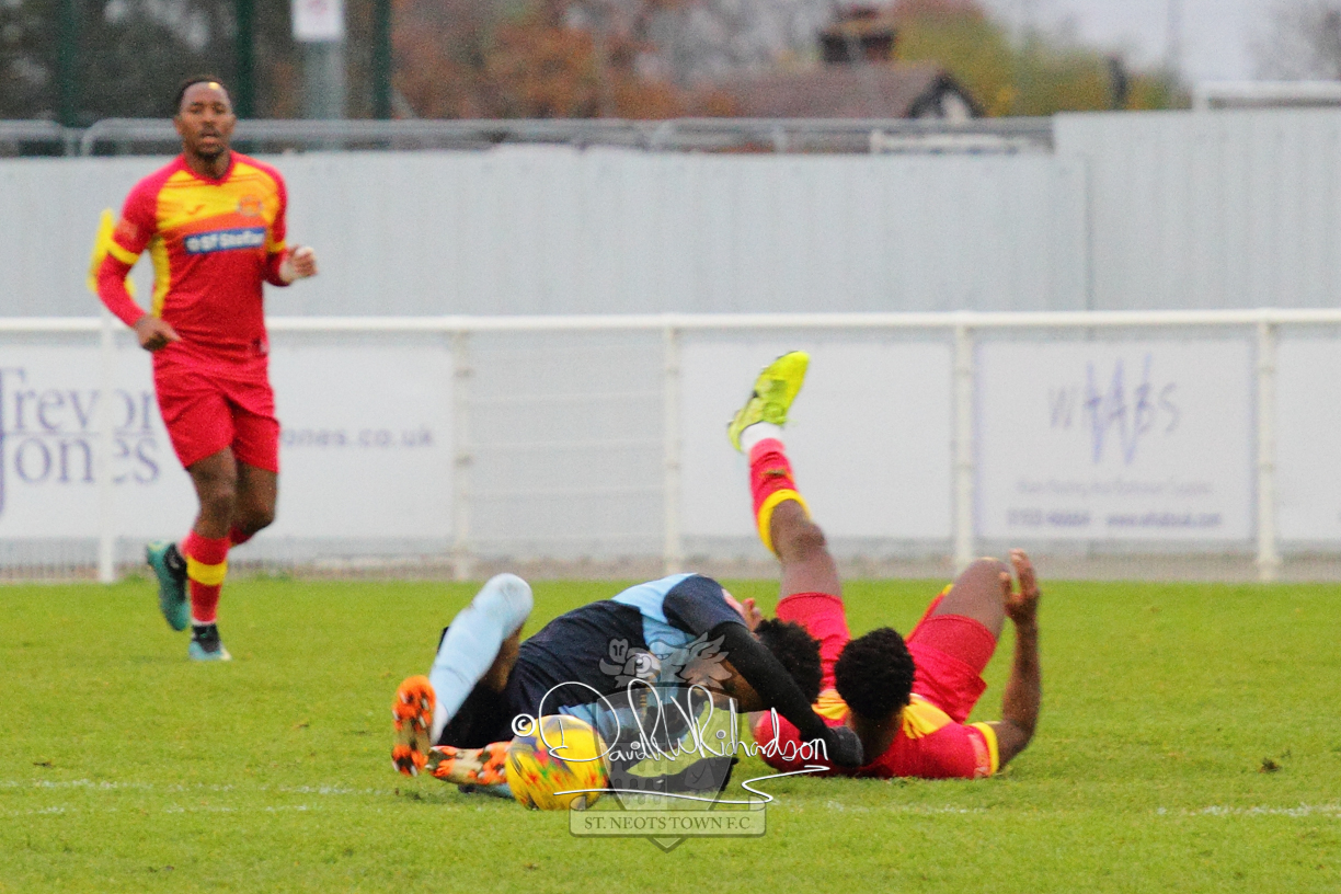 This most recent signing excited with his pace and skill and looks to be a very useful addition to the squad making an early impact after just six minutes as he rounded the home keeper to set up Myles Cowling but his shot from 25 yards sailed harmlessly over the crossbar. Four minutes later St Neots could have been behind as George Whitehall spilled a cross from Jonathan Edwards, but Charlie Johnson hacked the ball clear. Ky Marsh-Brown was then upended in the penalty area, but the referee waved play on whilst at the other end Olluwatobi Coker brought a full length save from Whitehall. His opposite number Lincon Marques then emulated him with an important save from a low Cowling effort and after 33 minutes Coker’s cross picked out the unmarked Anthony Edgar, but he miskicked with the goal at his mercy. Towards the end of the half St Neots were well in control and Ky Marsh-Brown was twice in significant action, bringing an important save from Marques before rounding off a mazy run through the home defence by shooting over the bar.