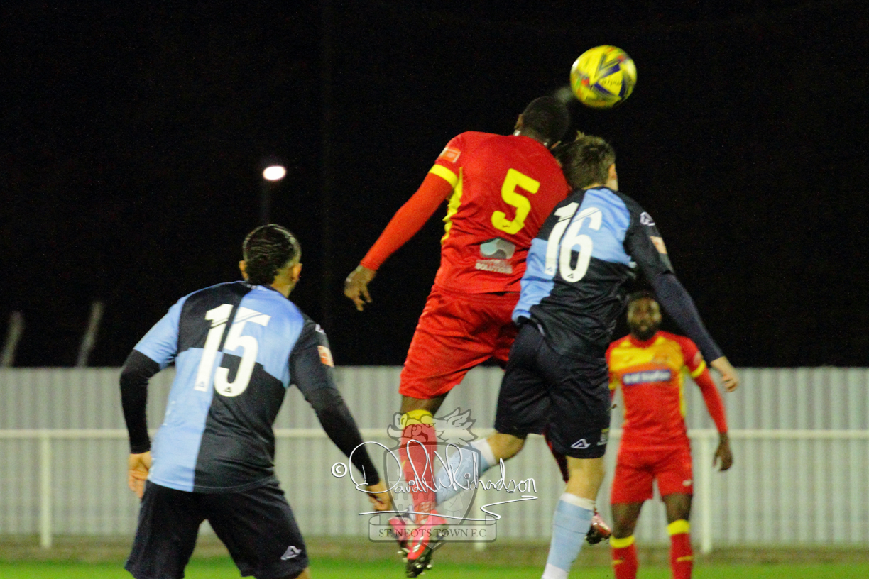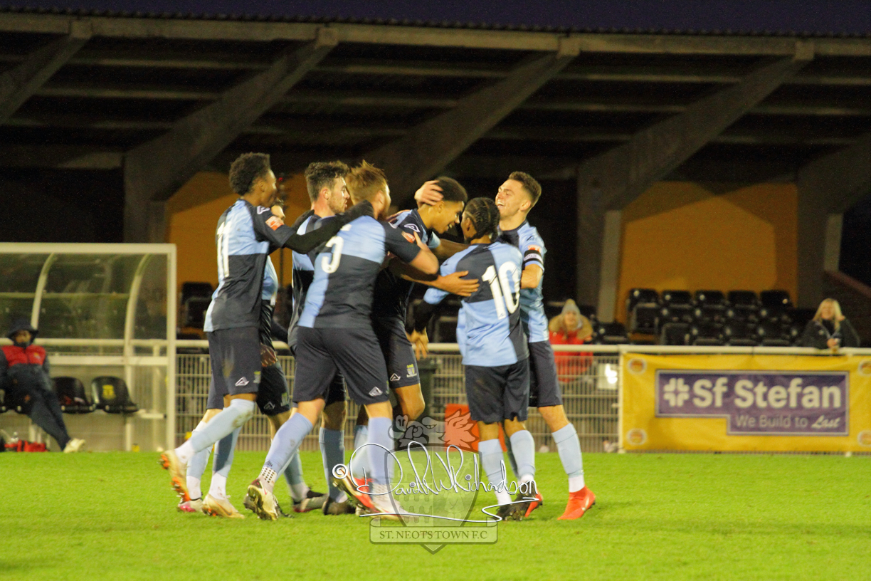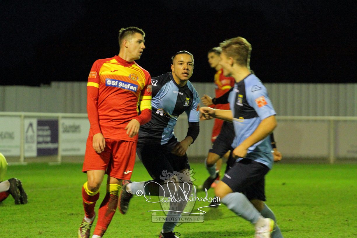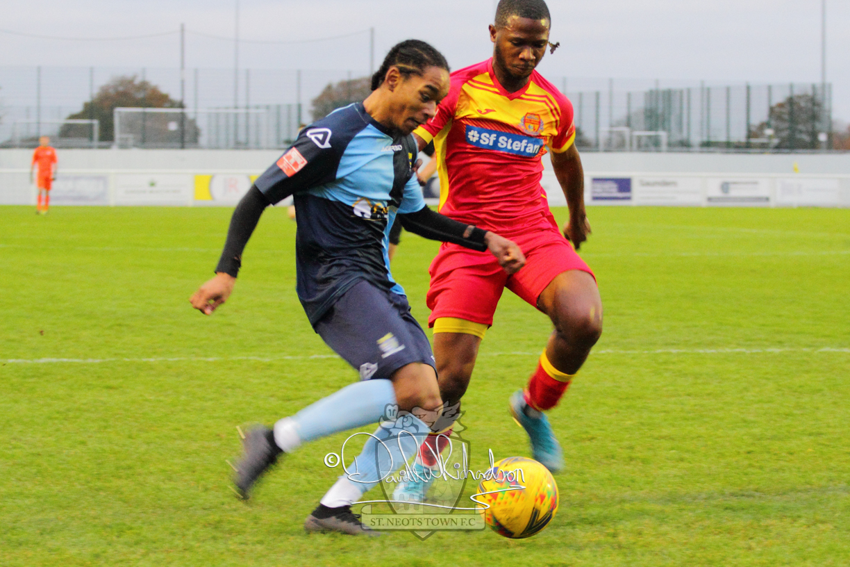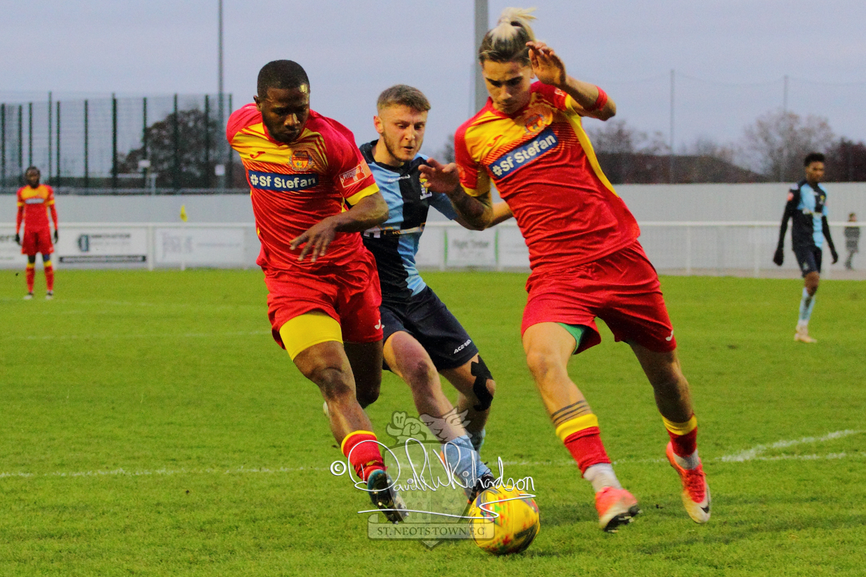 Two further bookings to the three they had picked up in the first half and two substitutions in the opening quarter of an hour of the second half served to see the home side completely lose their rhythm and St Neots should have taken advantage of their disarray. The closest to a goal for the visitors came after 64 minutes when Ky Marsh-Brown was again brought down earning the sixth caution for the home side but the free kick on the edge of the area Ky Marsh-Brown came to nothing. Just a minute later the home side carved out their first significant attack of the second half and a skilful interplay between Usman Adejini and substitute Kieran Bishop saw the former find the net beyond the dive of Whitehall. It took St Neots eight minutes to recover when Mamadou Jobe scored his first goal for St Neots following a Cowling corner, and four minutes later, substitute Neo Richard-Noel netted what was to prove the match winning goal as he wriggled through a cluster of defenders to score with a powerful, clinical low drive. FC Romania threw everything forward in search of a late equaliser but the St Neots Town defence, marshalled by the impressive Charlie Johnson, held out for a deserved victory.