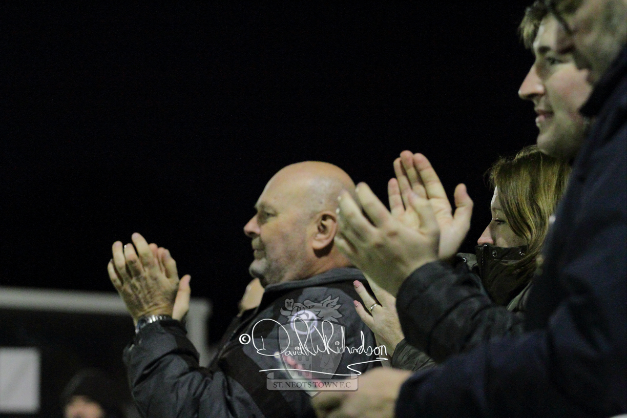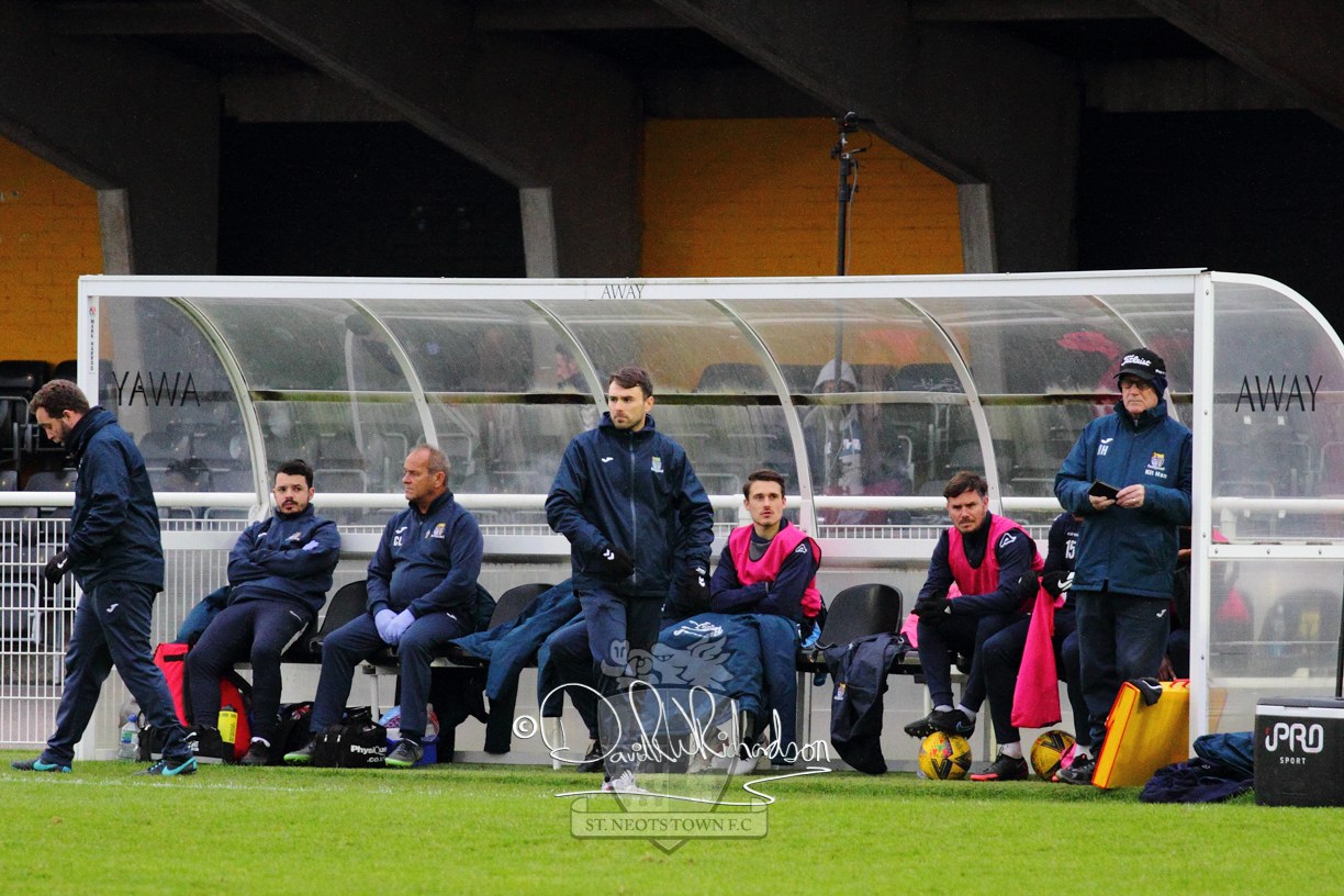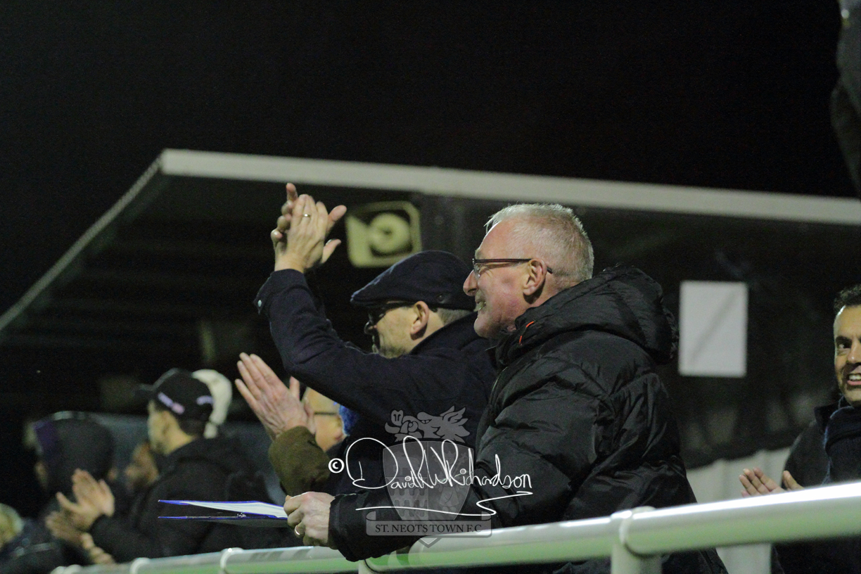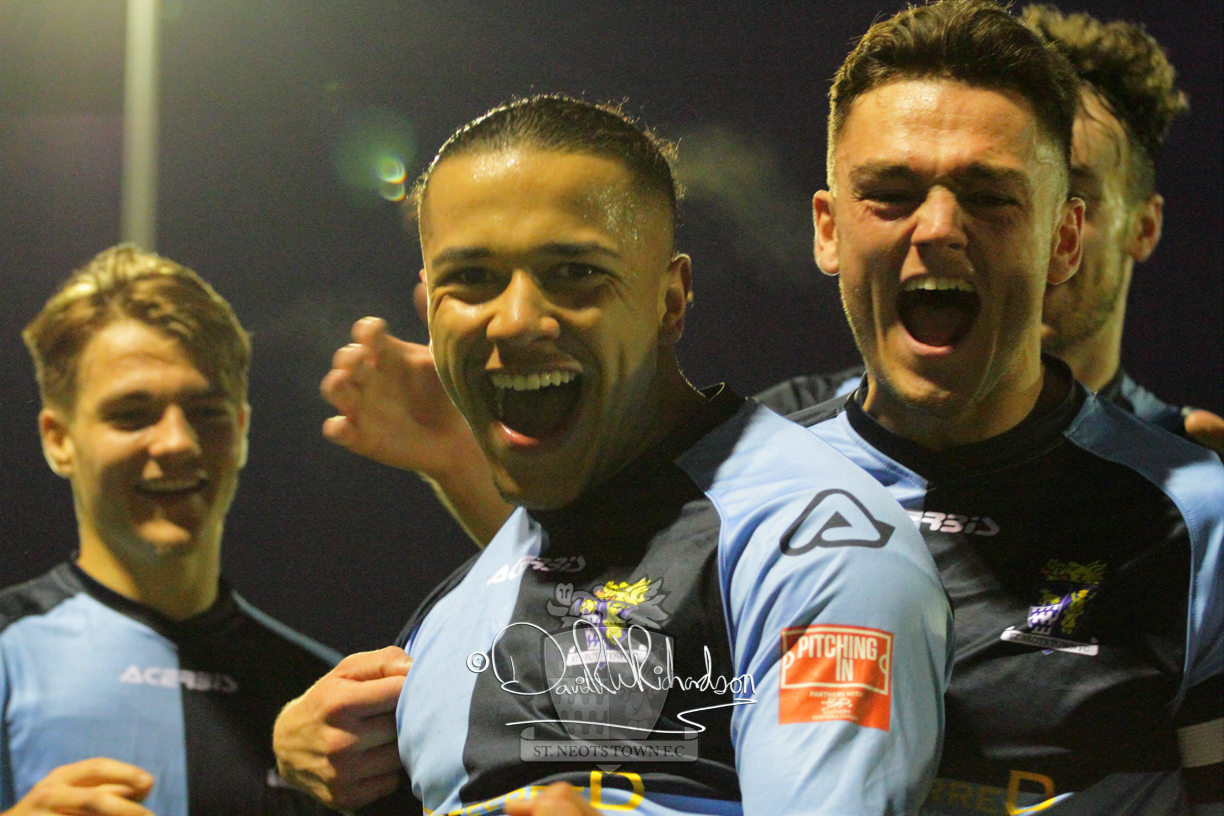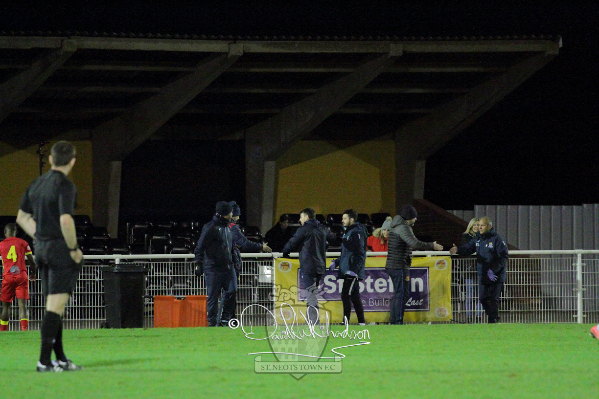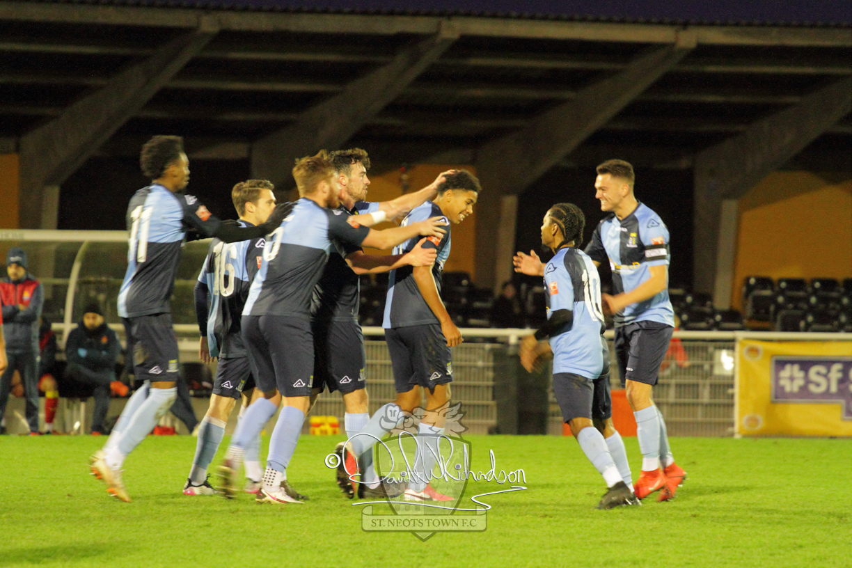 Two further bookings to the three they had picked up in the first half and two substitutions in the opening quarter of an hour of the second half served to see the home side completely lose their rhythm and St Neots should have taken advantage of their disarray. The closest to a goal for the visitors came after 64 minutes when Ky Marsh-Brown was again brought down earning the sixth caution for the home side but the free kick on the edge of the area Ky Marsh-Brown came to nothing. Just a minute later the home side carved out their first significant attack of the second half and a skilful interplay between Usman Adejini and substitute Kieran Bishop saw the former find the net beyond the dive of Whitehall. It took St Neots eight minutes to recover when Mamadou Jobe scored his first goal for St Neots following a Cowling corner, and four minutes later, substitute Neo Richard-Noel netted what was to prove the match winning goal as he wriggled through a cluster of defenders to score with a powerful, clinical low drive. FC Romania threw everything forward in search of a late equaliser but the St Neots Town defence, marshalled by the impressive Charlie Johnson, held out for a deserved victory.