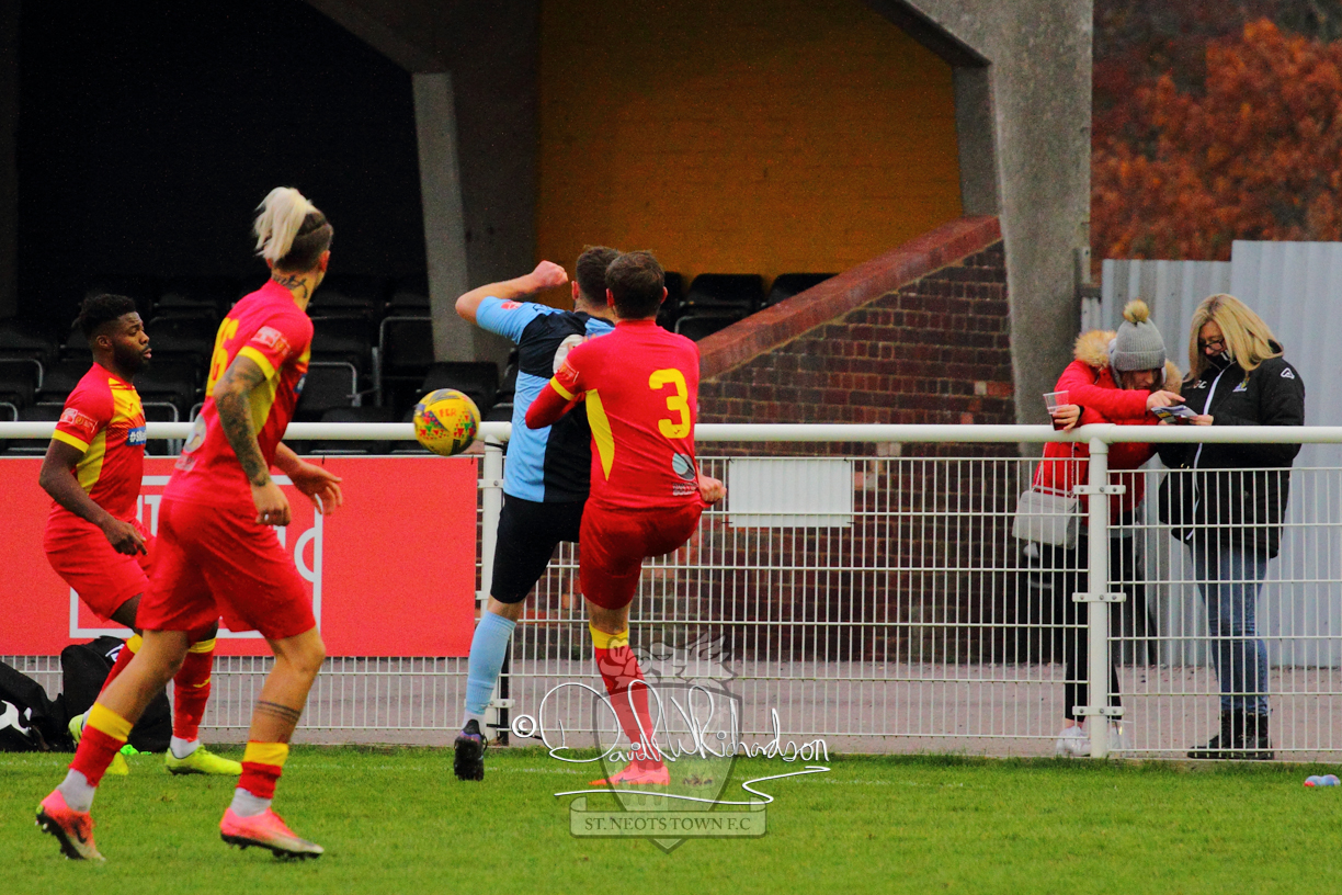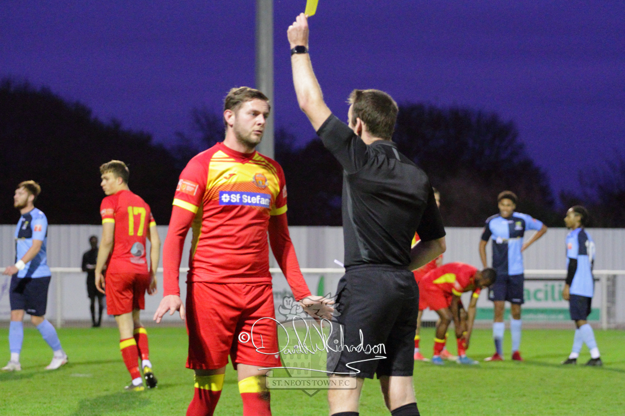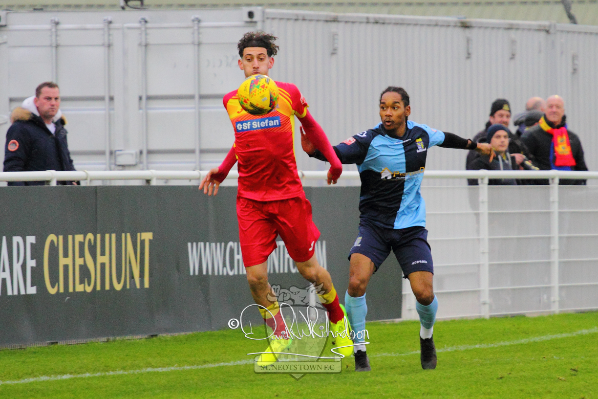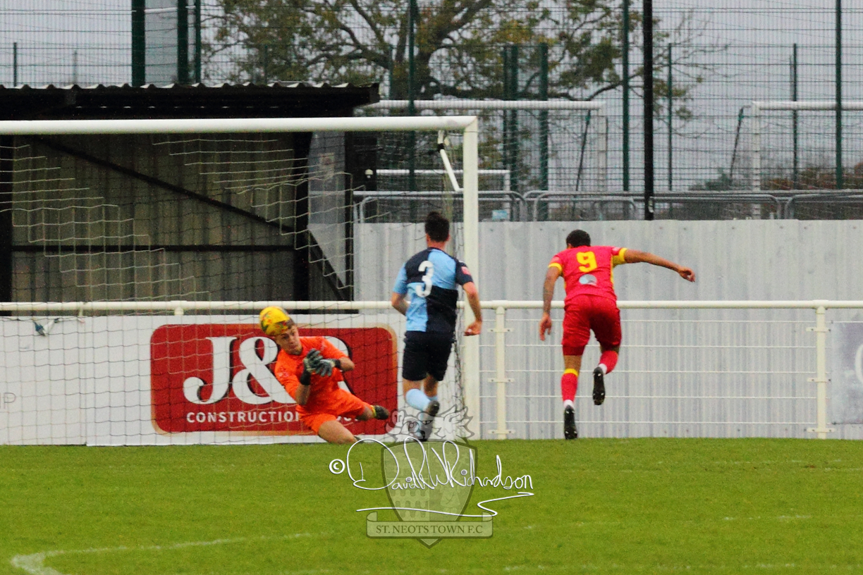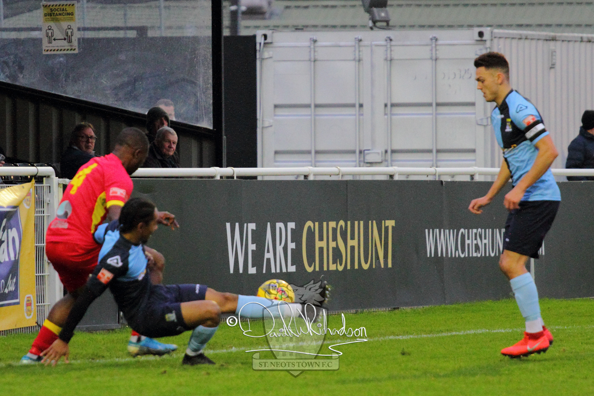 After 65 minutes St Neots were in danger of suffering a mugging at Cheshunt. Their rather physical opponents had picked up six yellow cards in stopping St Neots best attacking moves, but in the second half they then broke away through a visiting defence caught short, to score the first goal of the match.