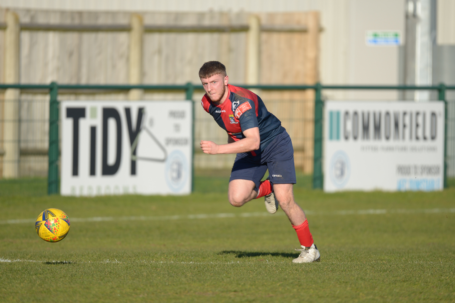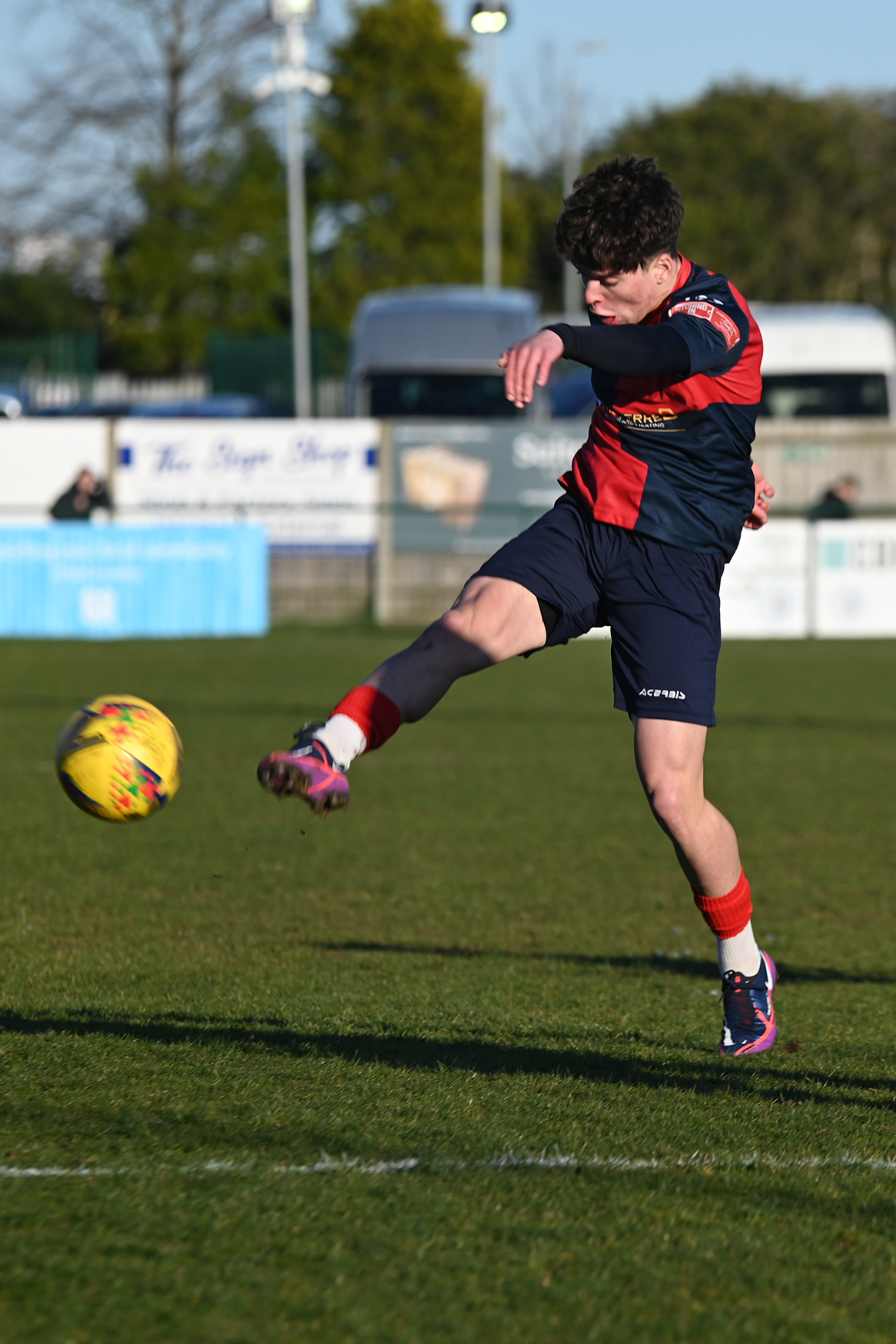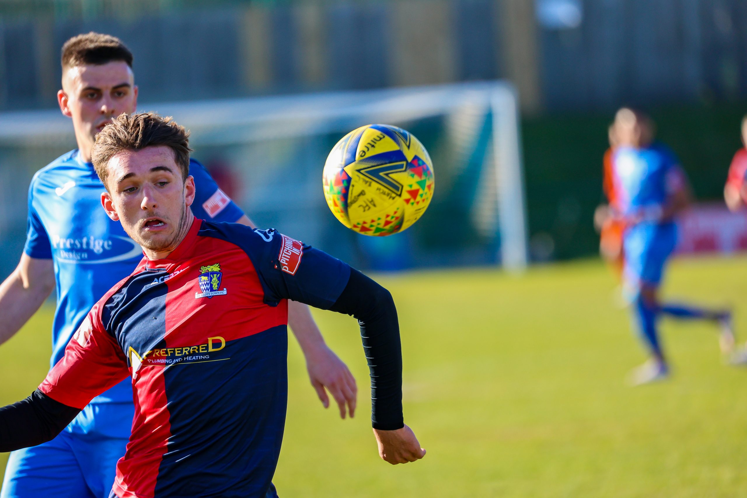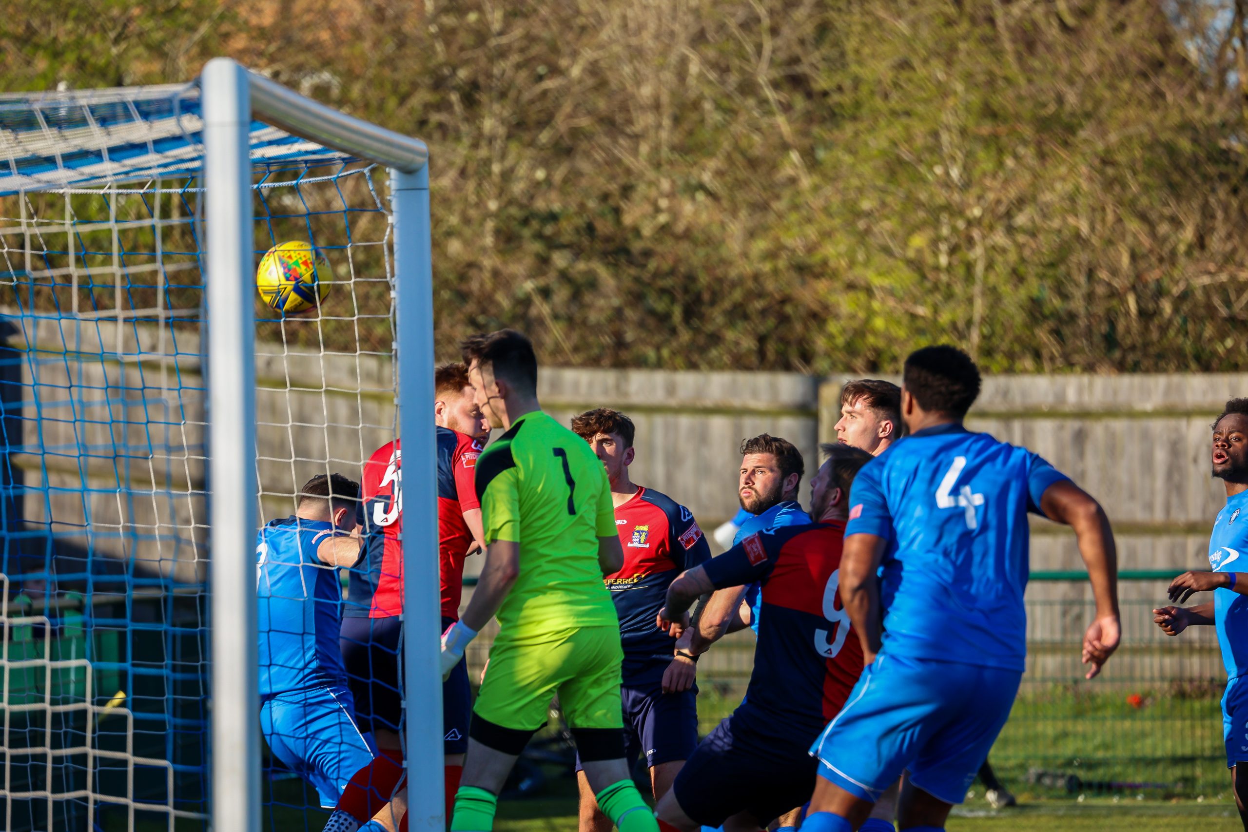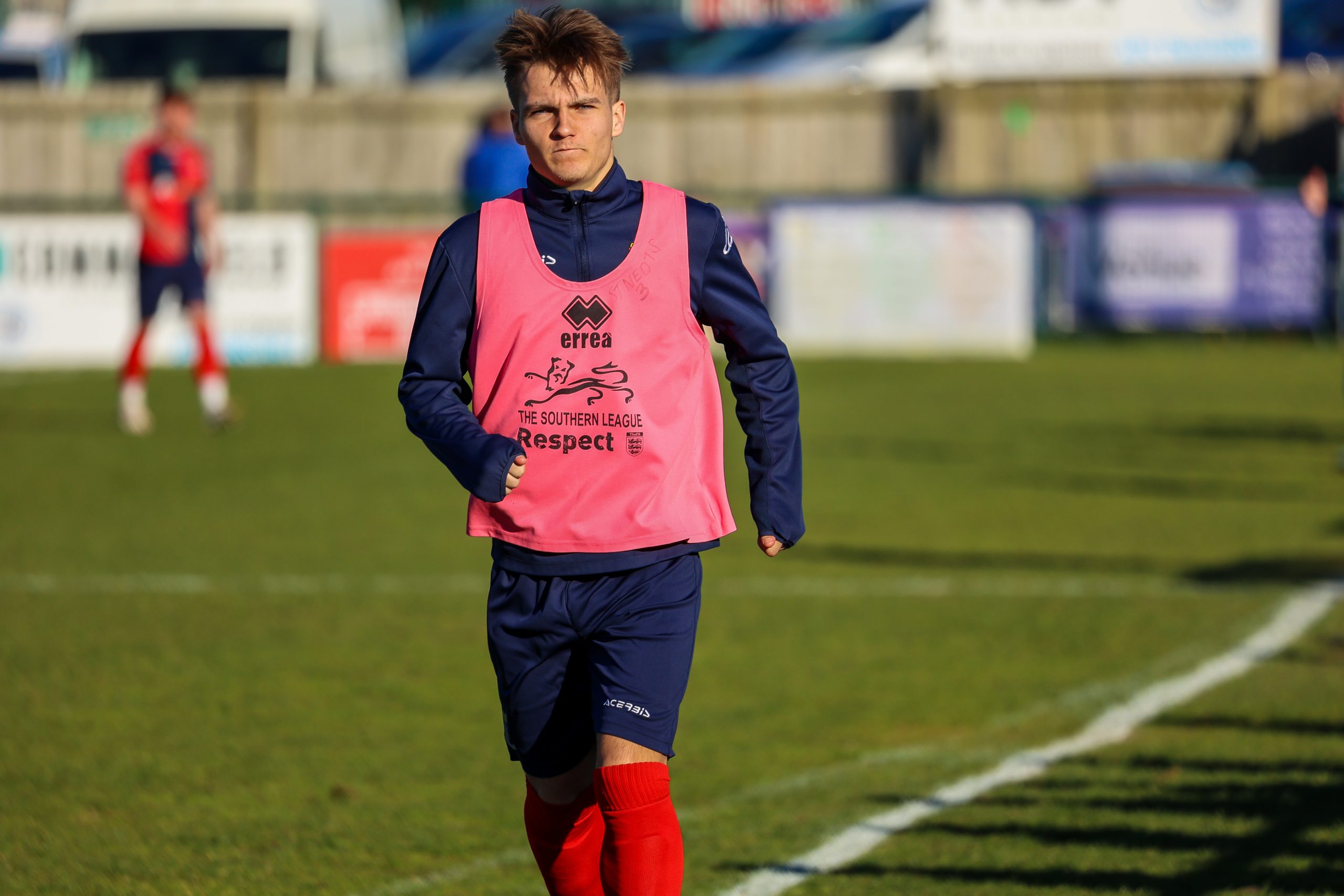 Neither side settled in the difficult conditions and it was a quarter of an hour before there was a serious effort on goal – this from Rob Mason but his effort was well saved by home keeper Jamie Head. The lively Kwai Marsh-Brown stole the ball from a dithering defender but saw his effort deflected for a corner but from a Brett Longden cross unmarked home striker Bernard Christie should have done better than strike the ball wide of goal. Louis Chadwick saved well from Kieran Hamilton and making towards goal Charley Barker was upended, earning Newman Carney a yellow card. Then, after 36 minutes a cross from the left struck a defender’s arm at close range and a harsh penalty was awarded, tucked away by Bernard Christie. St Neots protested but then responded positively as a Lee Watkins shot rebounded from a post for Joe Rider to claim the equalising goal five minutes before the break. A brave save by Chadwick at the feet of Christie ensured parity as the half time whistle blew.