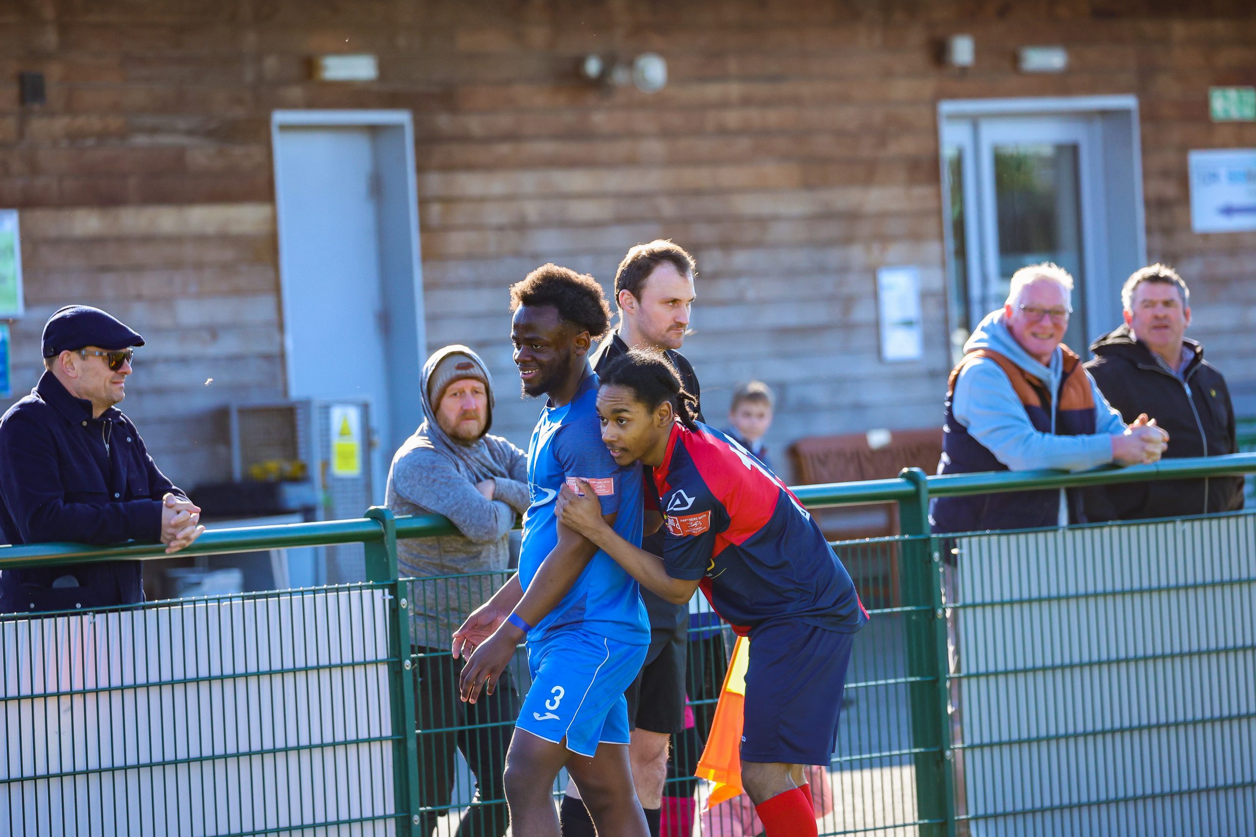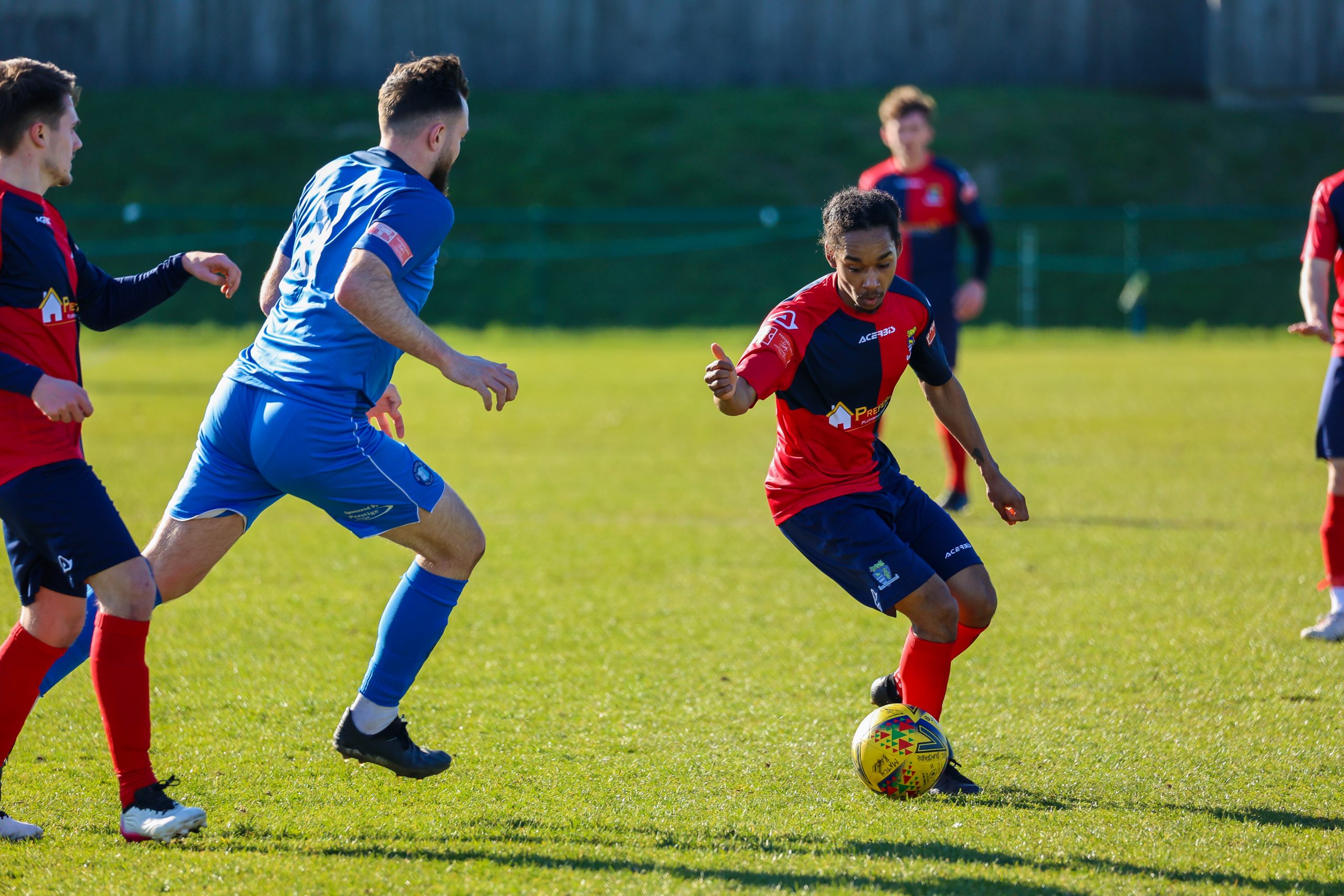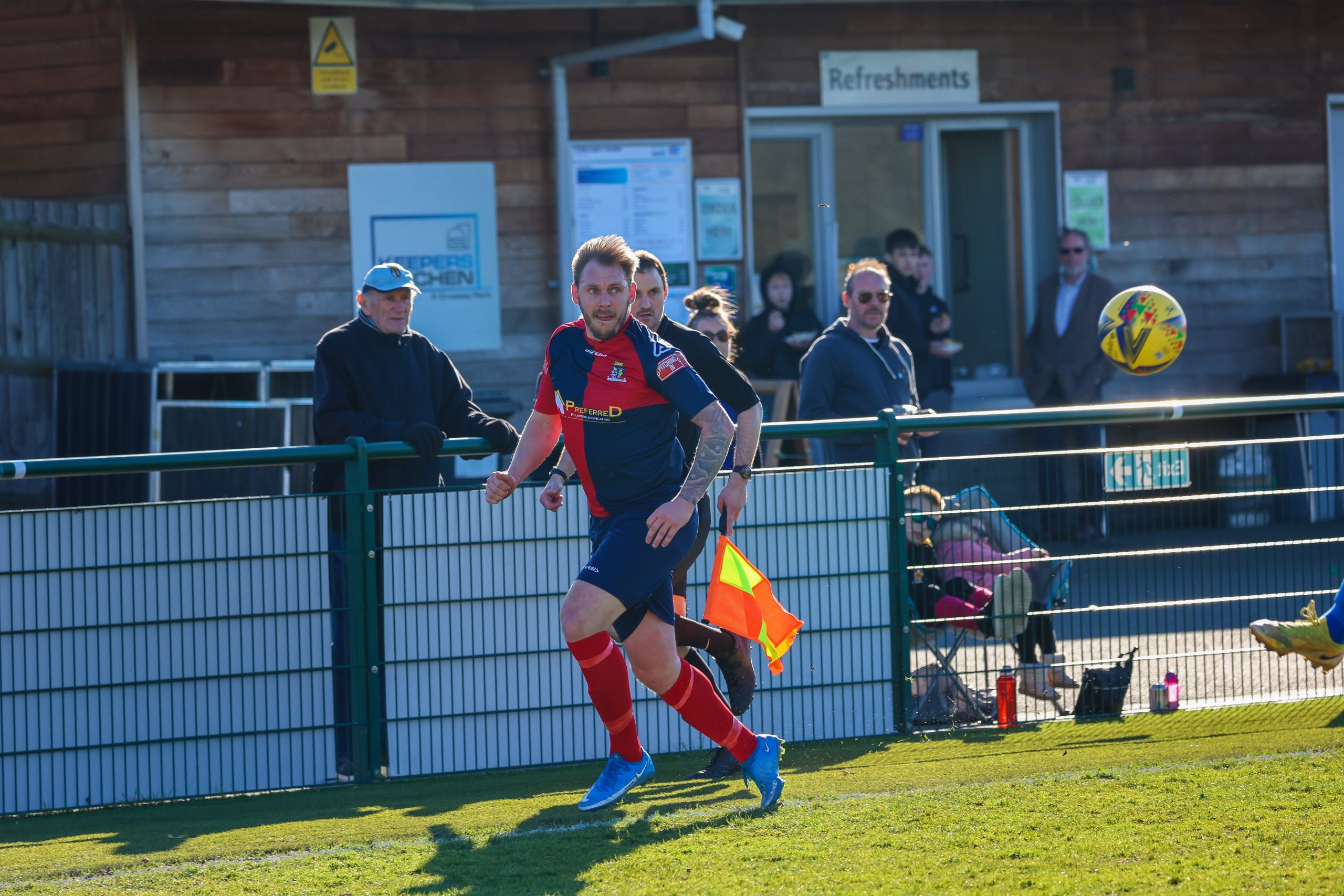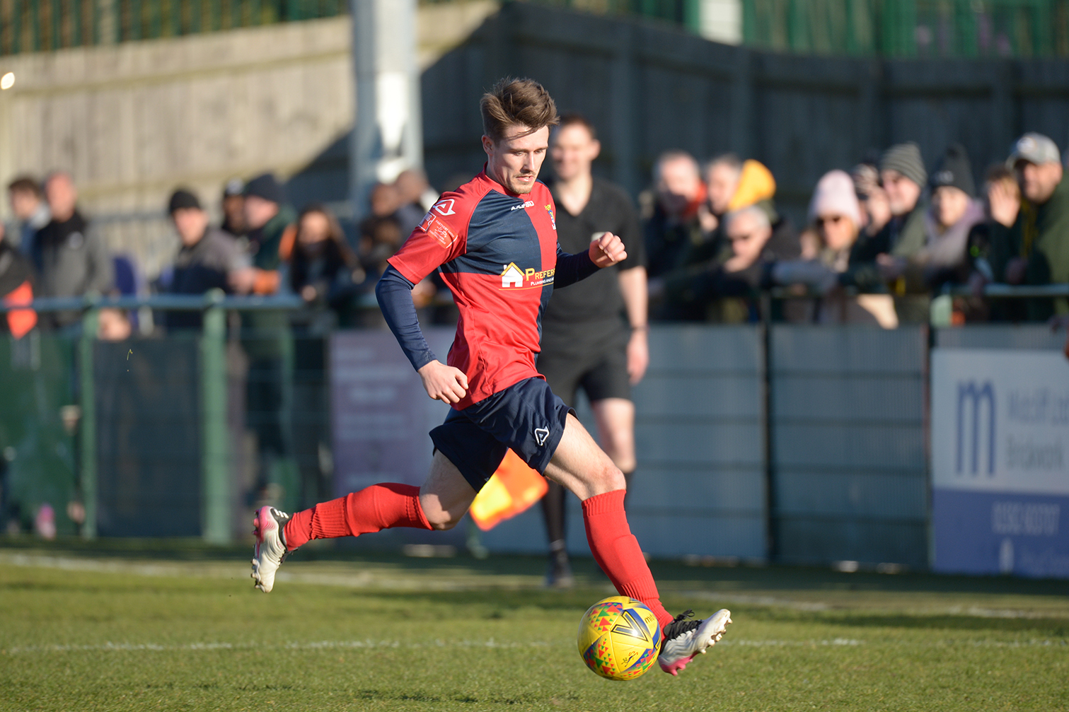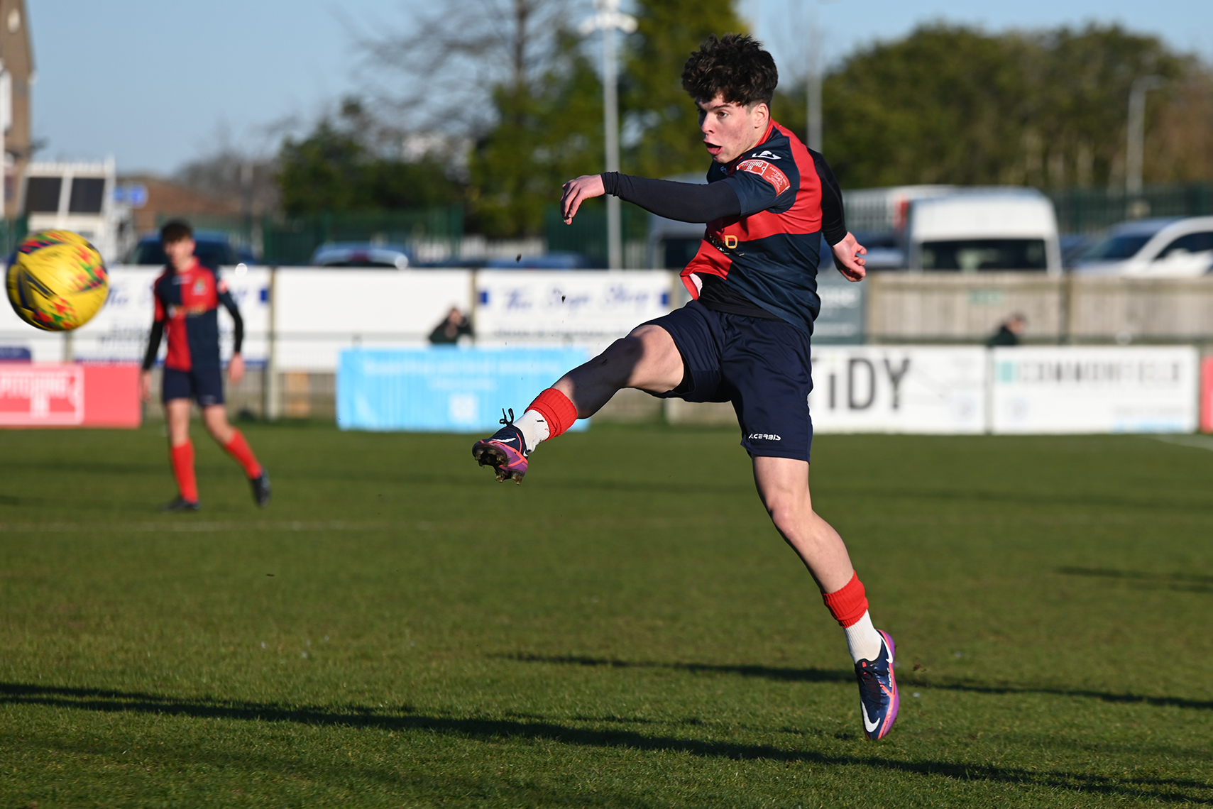 Neither side settled in the difficult conditions and it was a quarter of an hour before there was a serious effort on goal – this from Rob Mason but his effort was well saved by home keeper Jamie Head. The lively Kwai Marsh-Brown stole the ball from a dithering defender but saw his effort deflected for a corner but from a Brett Longden cross unmarked home striker Bernard Christie should have done better than strike the ball wide of goal. Louis Chadwick saved well from Kieran Hamilton and making towards goal Charley Barker was upended, earning Newman Carney a yellow card. Then, after 36 minutes a cross from the left struck a defender’s arm at close range and a harsh penalty was awarded, tucked away by Bernard Christie. St Neots protested but then responded positively as a Lee Watkins shot rebounded from a post for Joe Rider to claim the equalising goal five minutes before the break. A brave save by Chadwick at the feet of Christie ensured parity as the half time whistle blew.