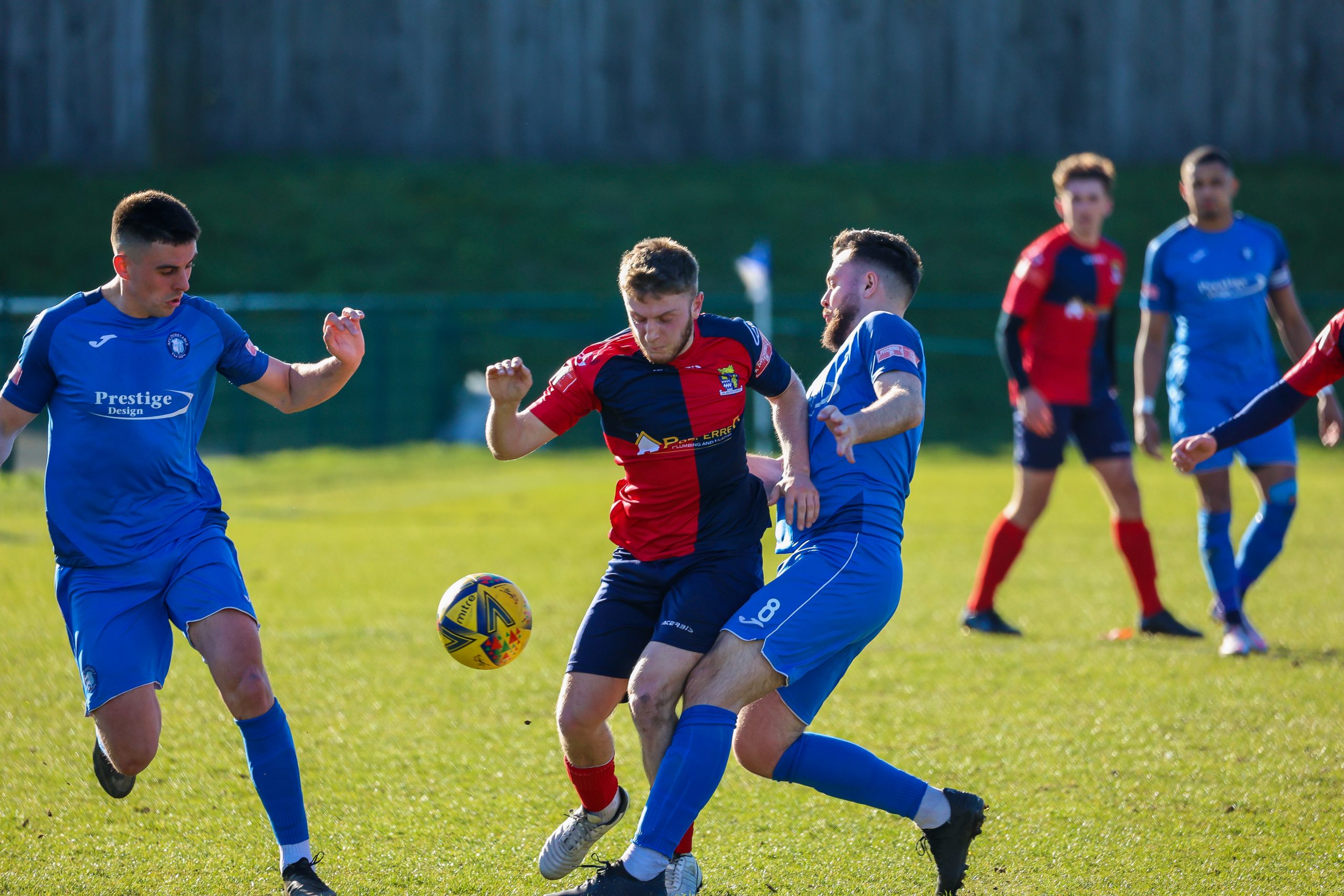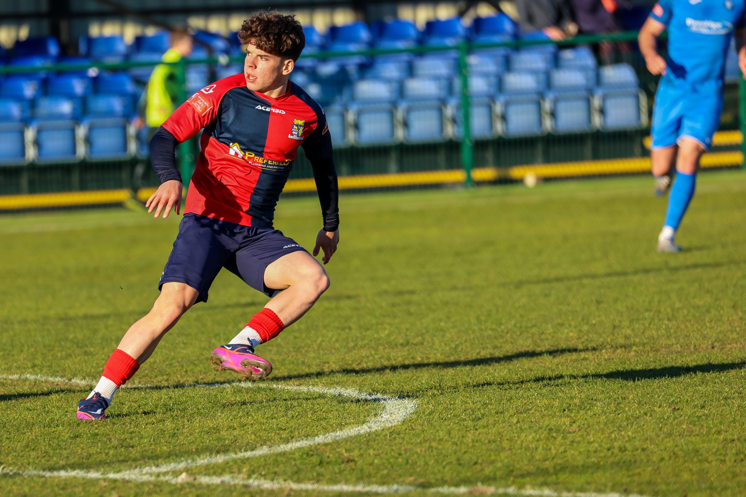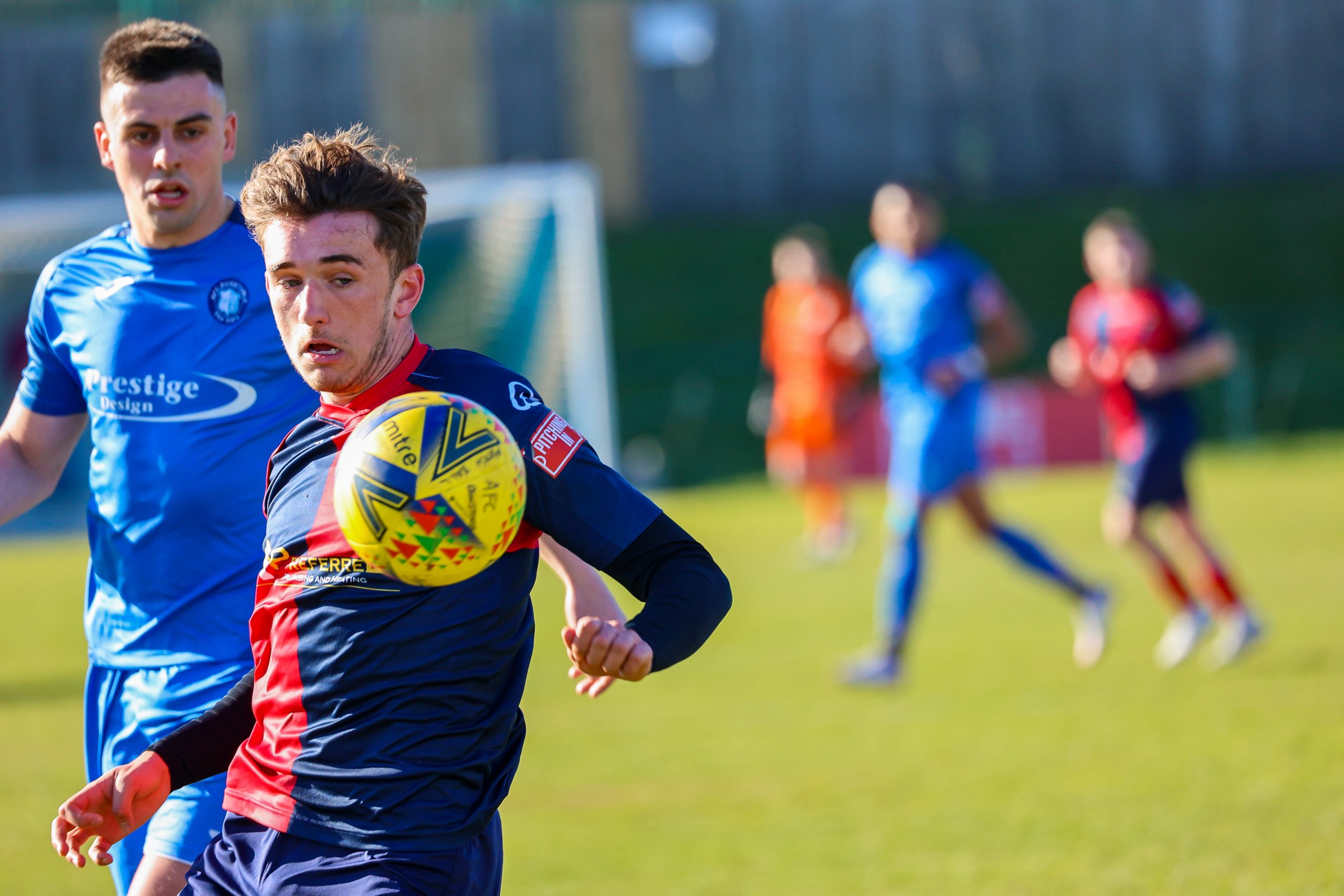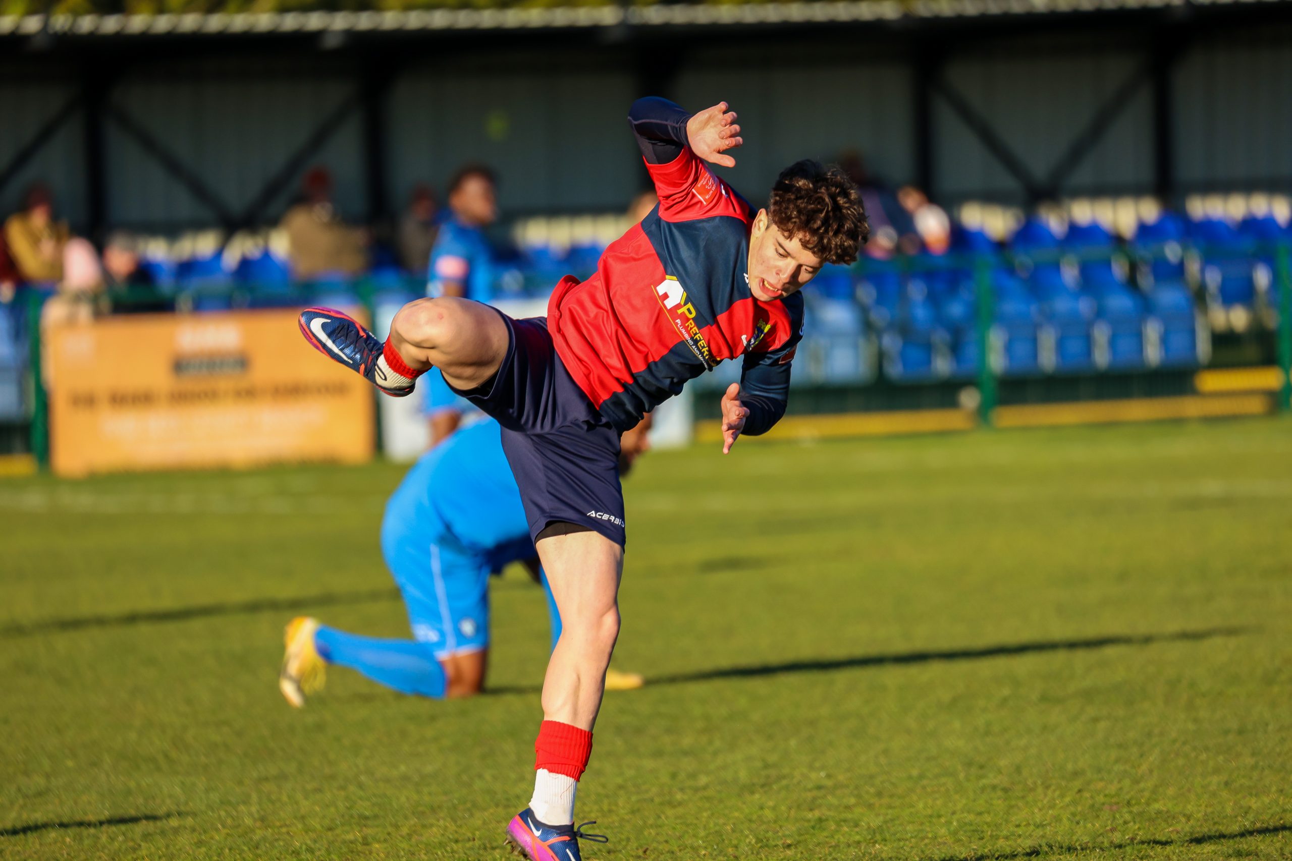 Neither side settled in the difficult conditions and it was a quarter of an hour before there was a serious effort on goal – this from Rob Mason but his effort was well saved by home keeper Jamie Head. The lively Kwai Marsh-Brown stole the ball from a dithering defender but saw his effort deflected for a corner but from a Brett Longden cross unmarked home striker Bernard Christie should have done better than strike the ball wide of goal. Louis Chadwick saved well from Kieran Hamilton and making towards goal Charley Barker was upended, earning Newman Carney a yellow card. Then, after 36 minutes a cross from the left struck a defender’s arm at close range and a harsh penalty was awarded, tucked away by Bernard Christie. St Neots protested but then responded positively as a Lee Watkins shot rebounded from a post for Joe Rider to claim the equalising goal five minutes before the break. A brave save by Chadwick at the feet of Christie ensured parity as the half time whistle blew.