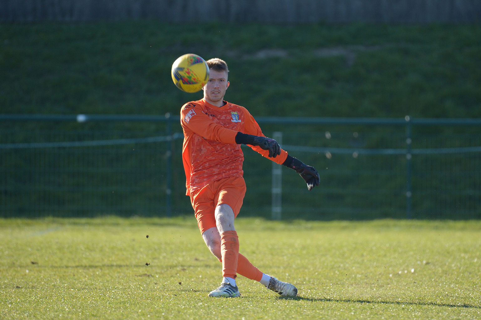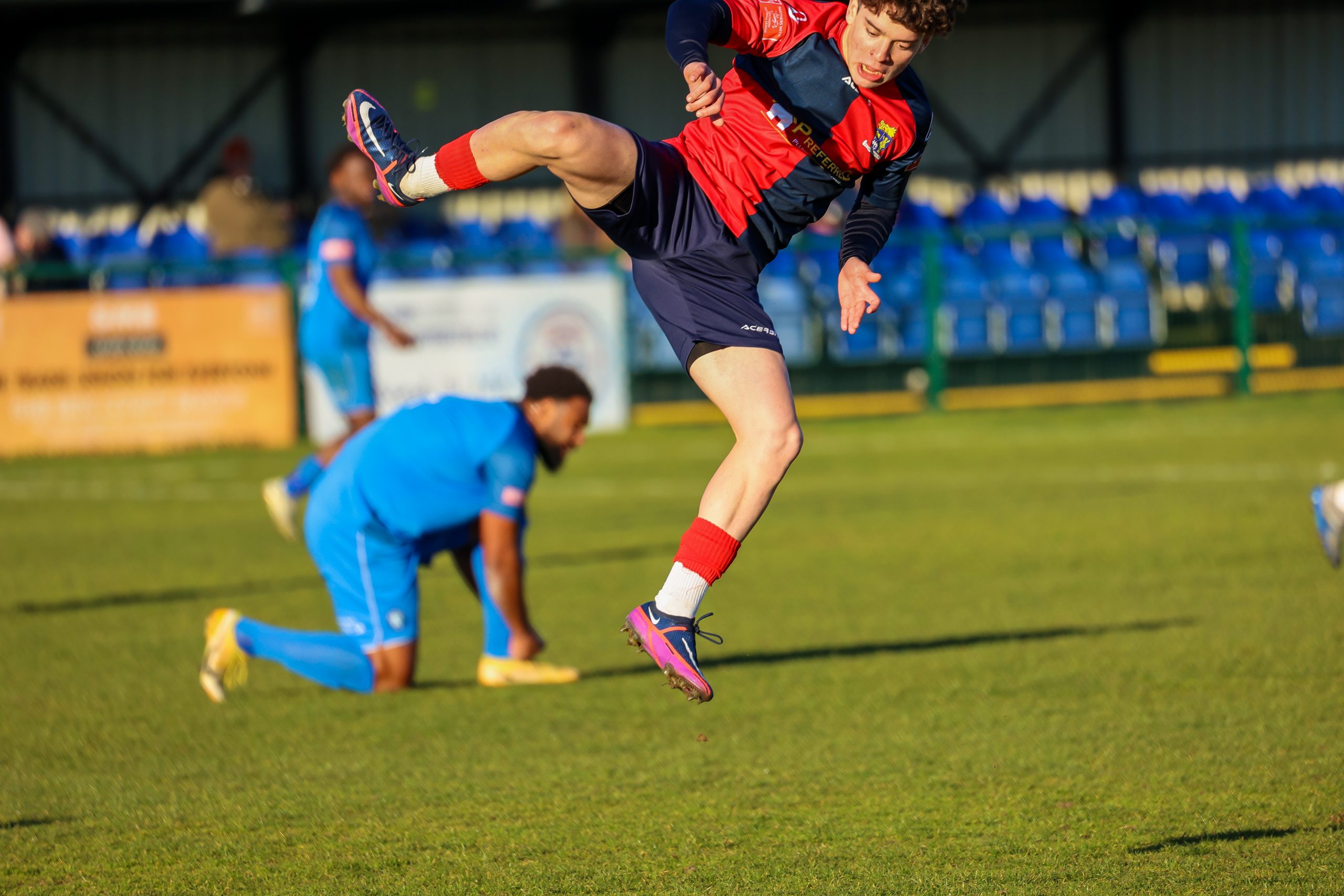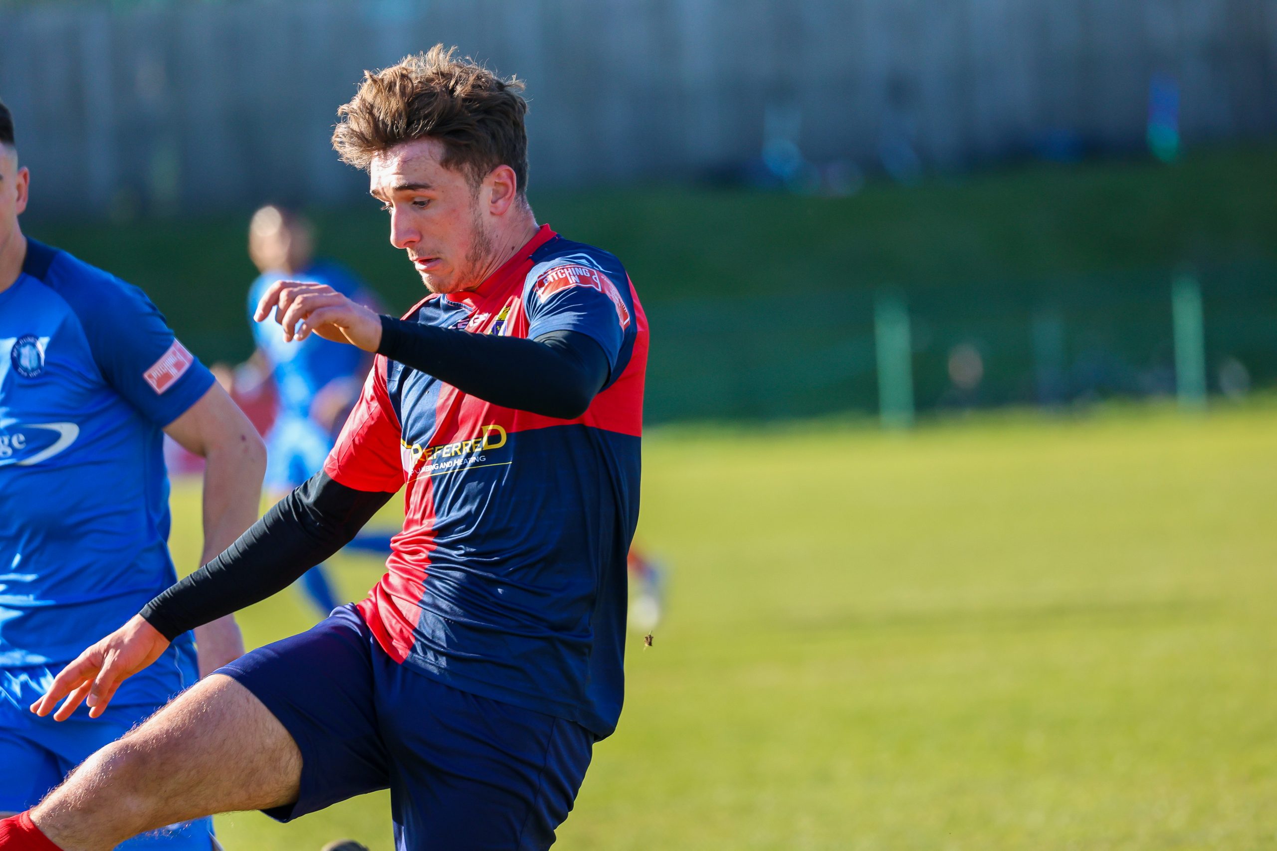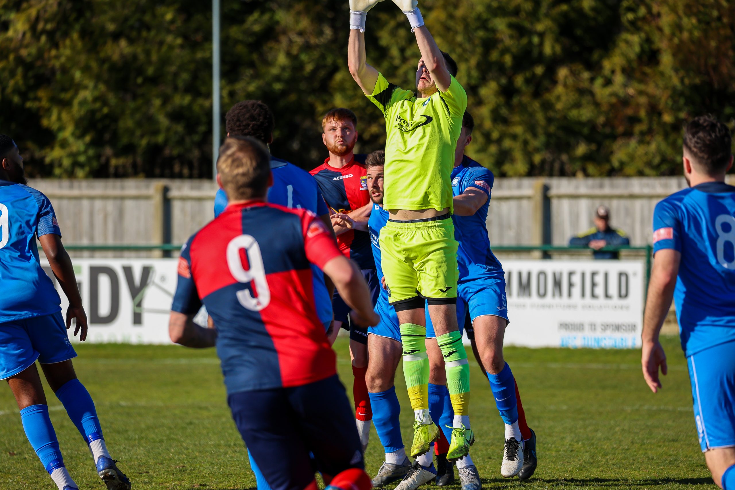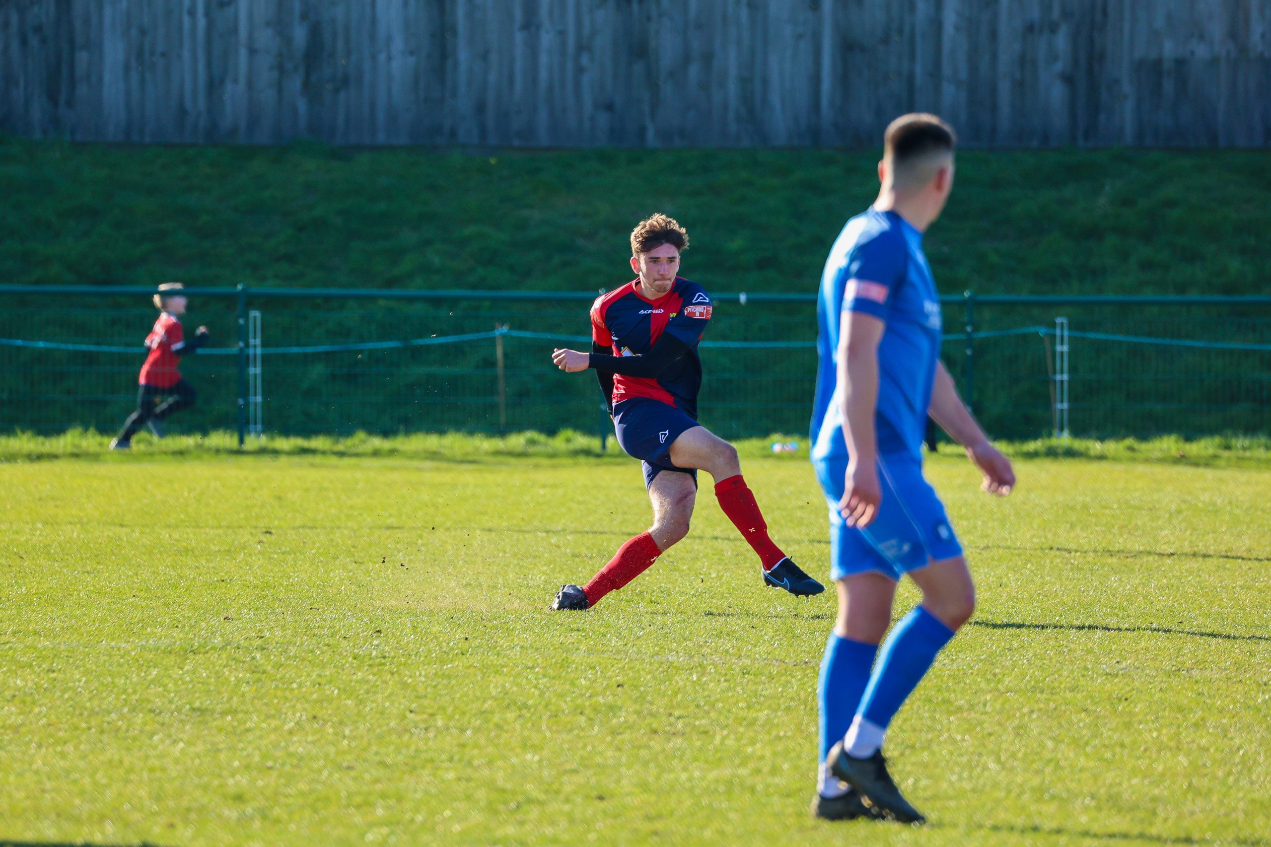 Neither side settled in the difficult conditions and it was a quarter of an hour before there was a serious effort on goal – this from Rob Mason but his effort was well saved by home keeper Jamie Head. The lively Kwai Marsh-Brown stole the ball from a dithering defender but saw his effort deflected for a corner but from a Brett Longden cross unmarked home striker Bernard Christie should have done better than strike the ball wide of goal. Louis Chadwick saved well from Kieran Hamilton and making towards goal Charley Barker was upended, earning Newman Carney a yellow card. Then, after 36 minutes a cross from the left struck a defender’s arm at close range and a harsh penalty was awarded, tucked away by Bernard Christie. St Neots protested but then responded positively as a Lee Watkins shot rebounded from a post for Joe Rider to claim the equalising goal five minutes before the break. A brave save by Chadwick at the feet of Christie ensured parity as the half time whistle blew.