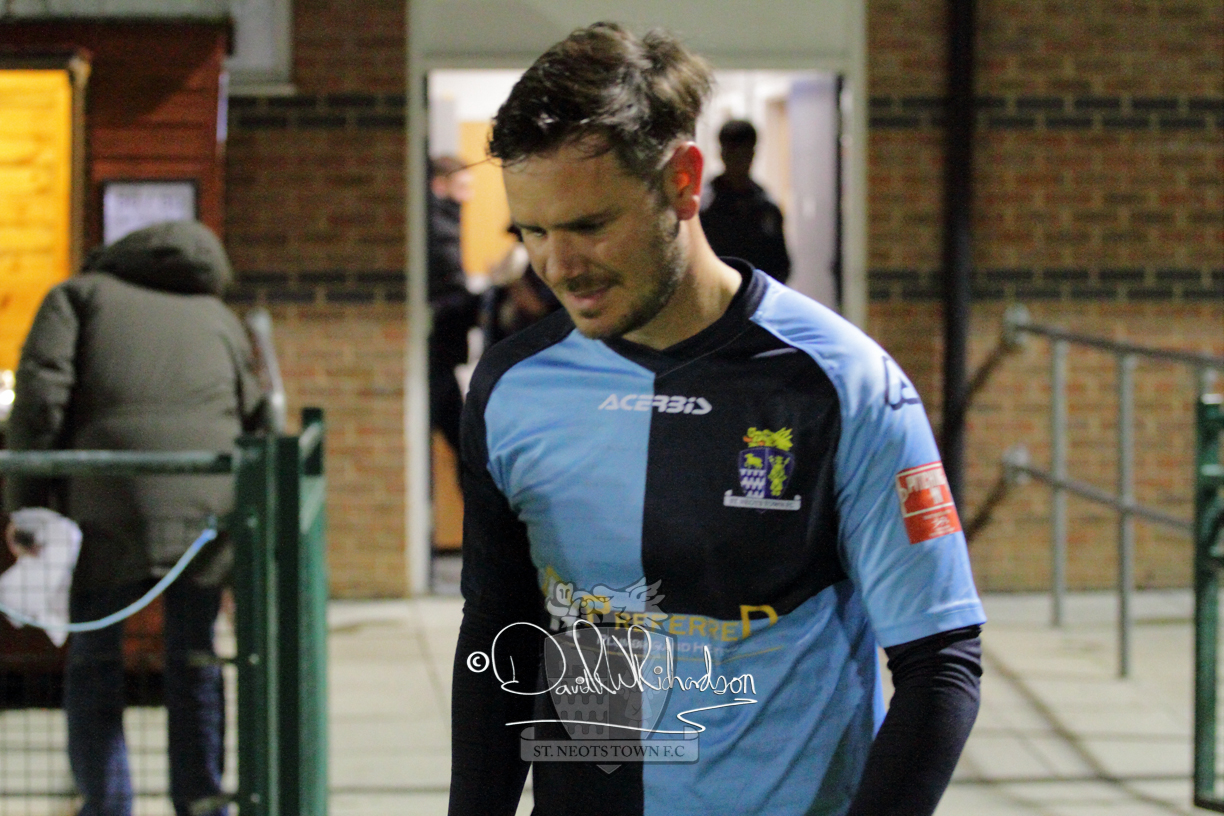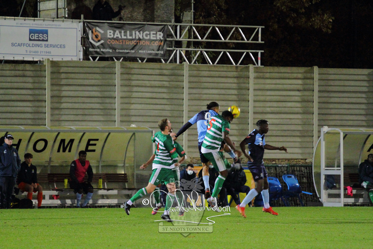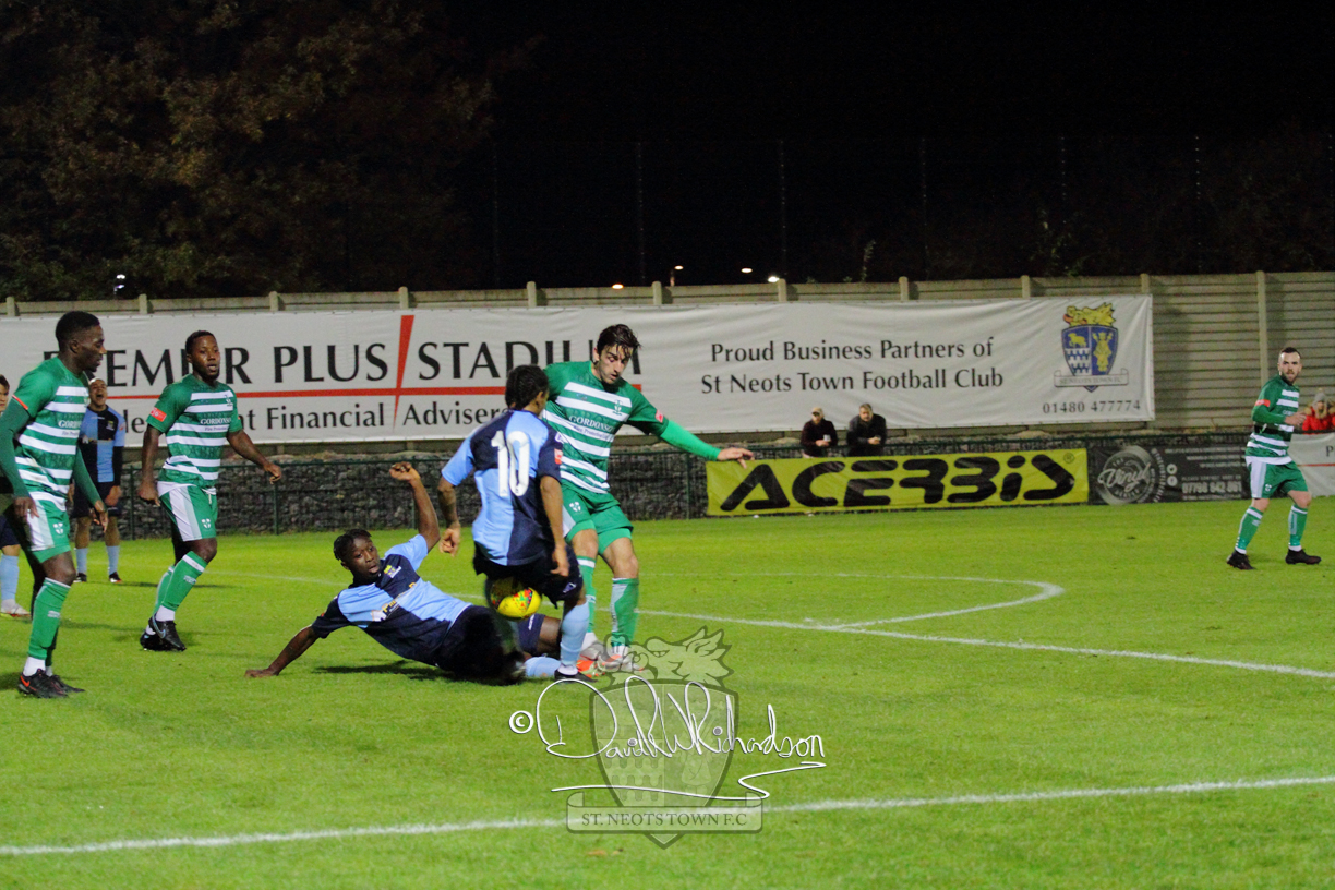After the break the visitors sent on substitute Jack Daveney and he pepped up their attacking play. St Neots then almost committed football suicide when a stray back pass put Clark through on goal, but his effort was woefully wide of target. In the next fifteen minutes, St Neots regained the initiative and the visitors picked up three bookings as they strove to stem St Neots attacks but the best effort the home side could muster was a Charley Barker free kick that was wide. It was accuracy in finishing that was costing St Neots dear as Richard-Noel shot off target from a searching cross by Cowling and then the same St Neots played tried his luck from distance but saw his effort flash wide of goal. In the last ten minutes visiting goalkeeper Jones was the busiest man of the field. Richard-Noel broke clear of the defence but the keeper saved well, and he then dived full length to turn away a net-bound shot from Marsh-Brown. On the break Ibitayo Oyebola was upended by Lee Watkins earning the St Neots skipper a fifth yellow card of the season and a suspension and the match ended with Jones making two more outstanding saves to deny Cowling what would have been a match winning goal.