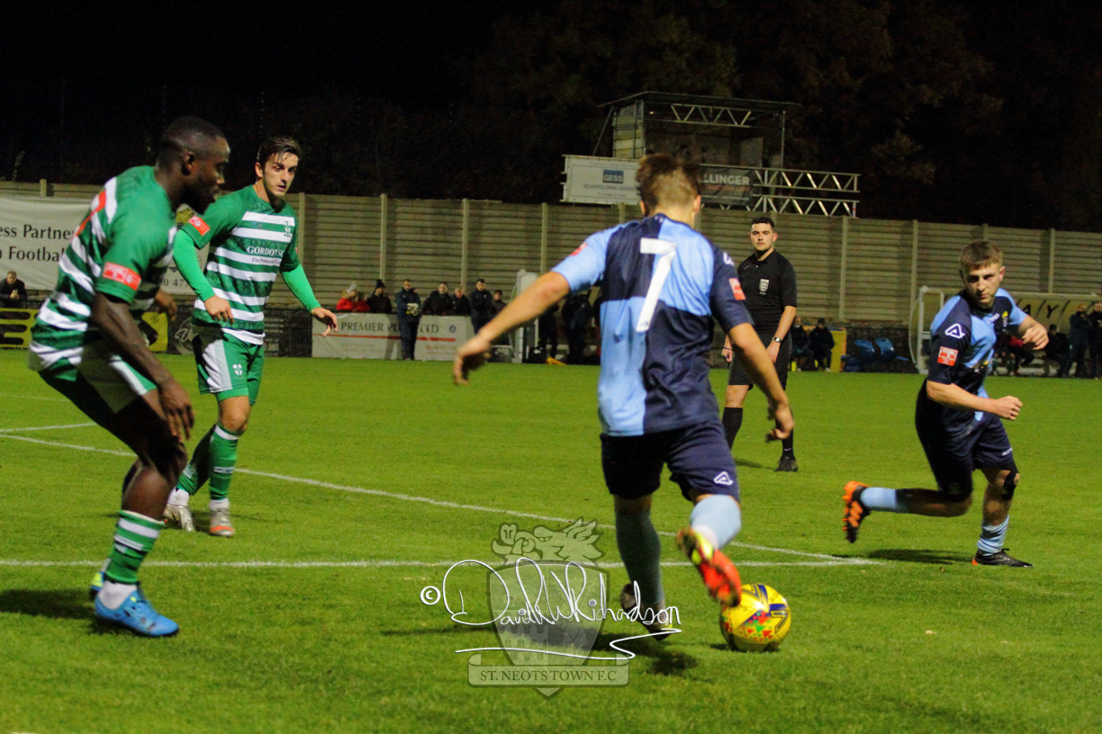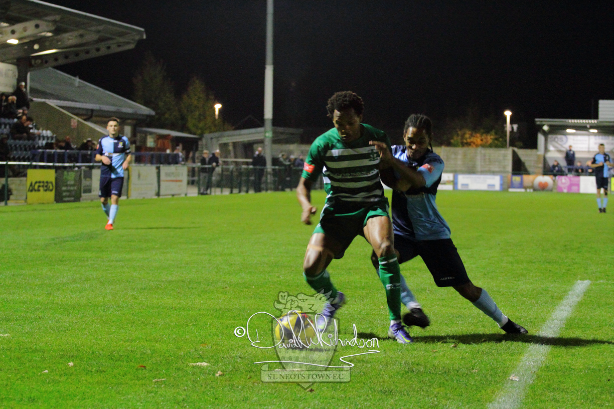 From the start St Neots bossed proceedings but it was to be more than half an hour before the home keeper was called up to make a save. As early as the sixth minute skipper Lee Watkins beat the visiting goalkeeper with a snapshot only to see his effort rebound from a post and then Neo Richard-Noel squandered a glorious chance firing over the bar after good work by Myles Cowling. Although the visiting side seemed happy to concede free kicks to halt St Neots’ attacks it was a home player – Wynford Marfo – who was booked as he committed his sides’ first free kick after ten minutes. An injury to defender Charlie Johnson after 23 minutes further hindered St Neots and his replacement was Julinho Gomes forcing a team reshuffle. Cowling saw visiting keeper Ashlee Jones make a good save but after 34 minutes the visitors mounted their first significant attack and George Whitehall had to be alert to save from Robert Clark and the same player then went past two defenders to shoot wide. Just before the break Kwai Marsh-Brown saw an effort rebound from the bar so the sides failed to break the deadlock before half time.