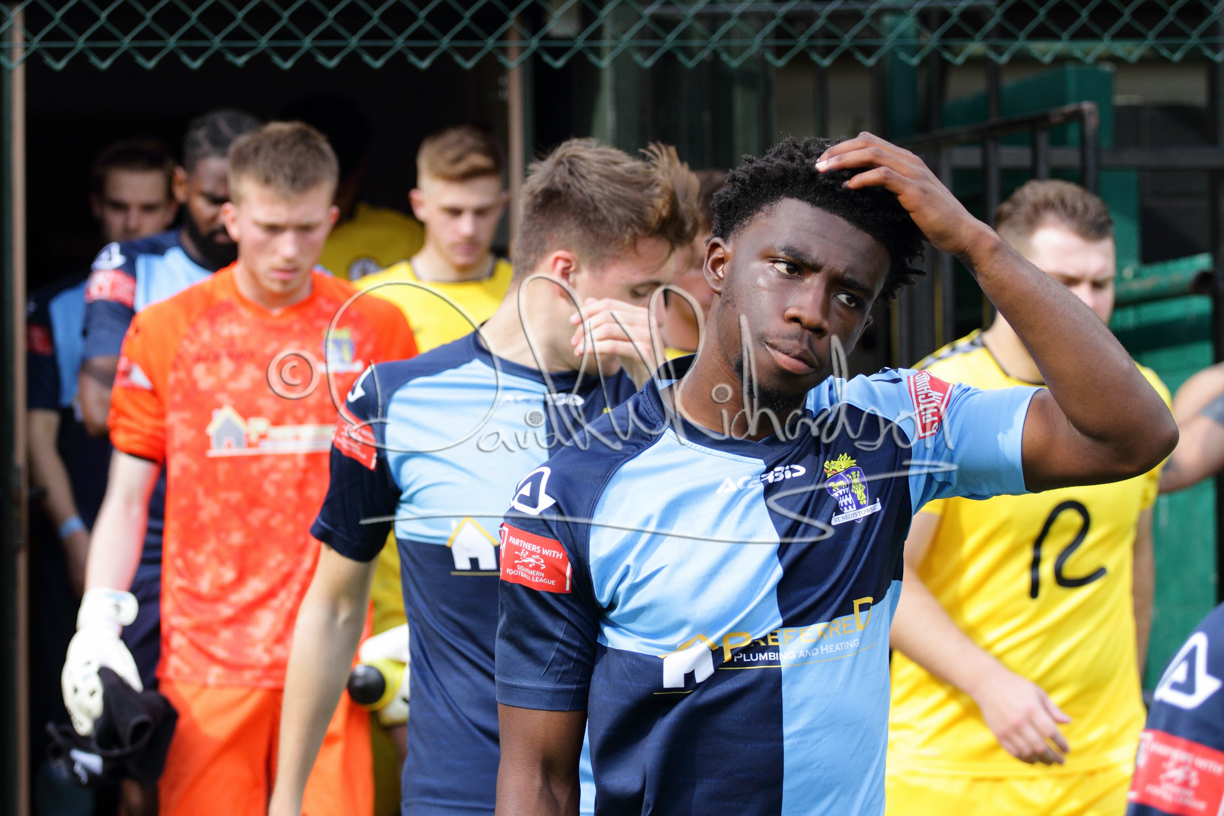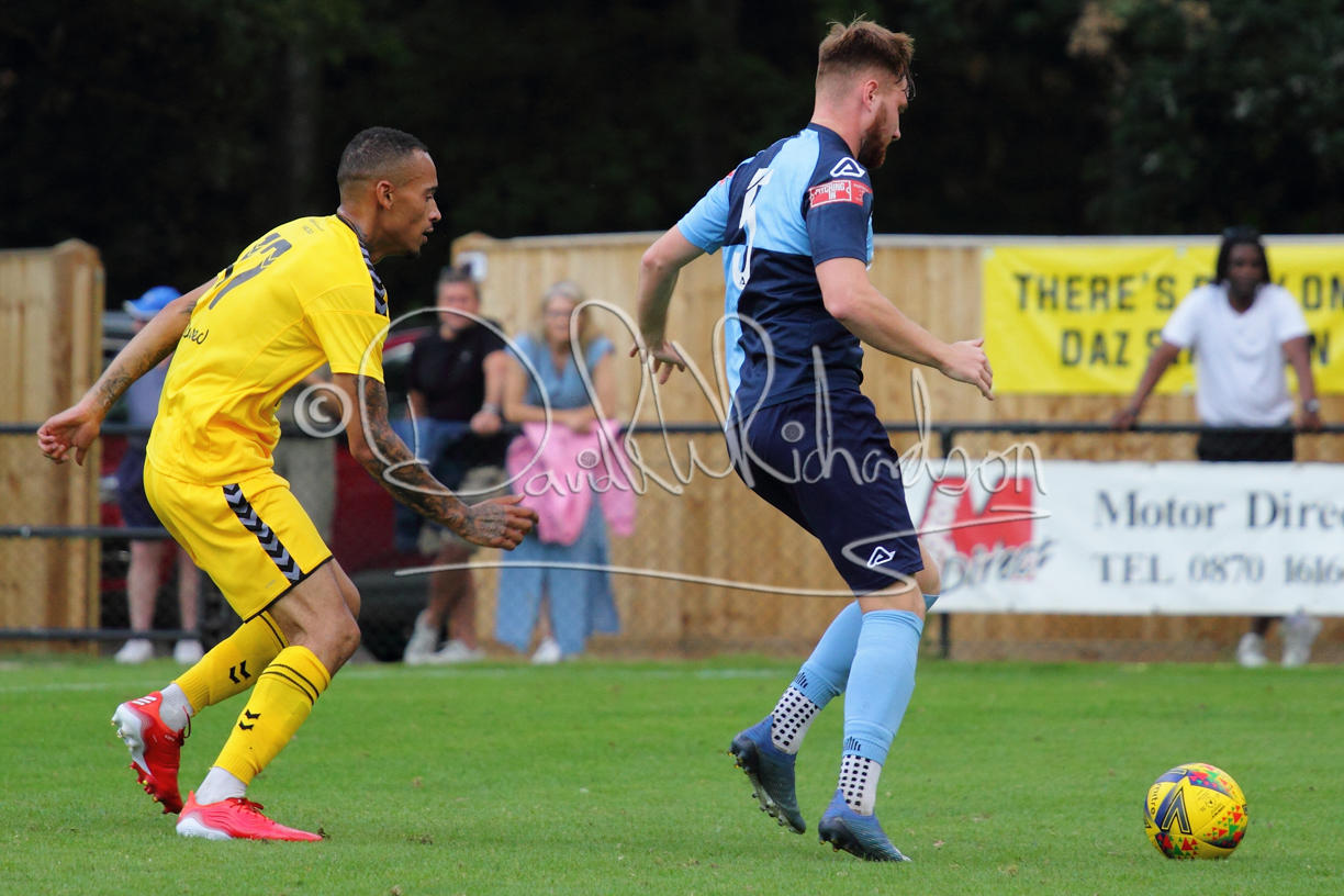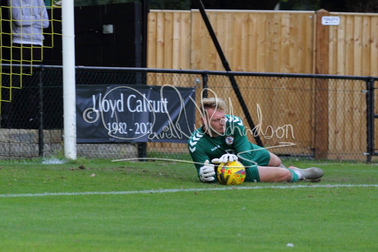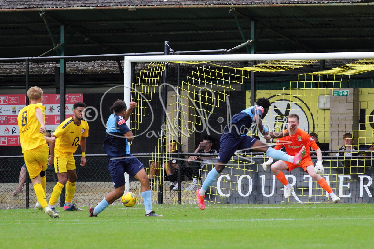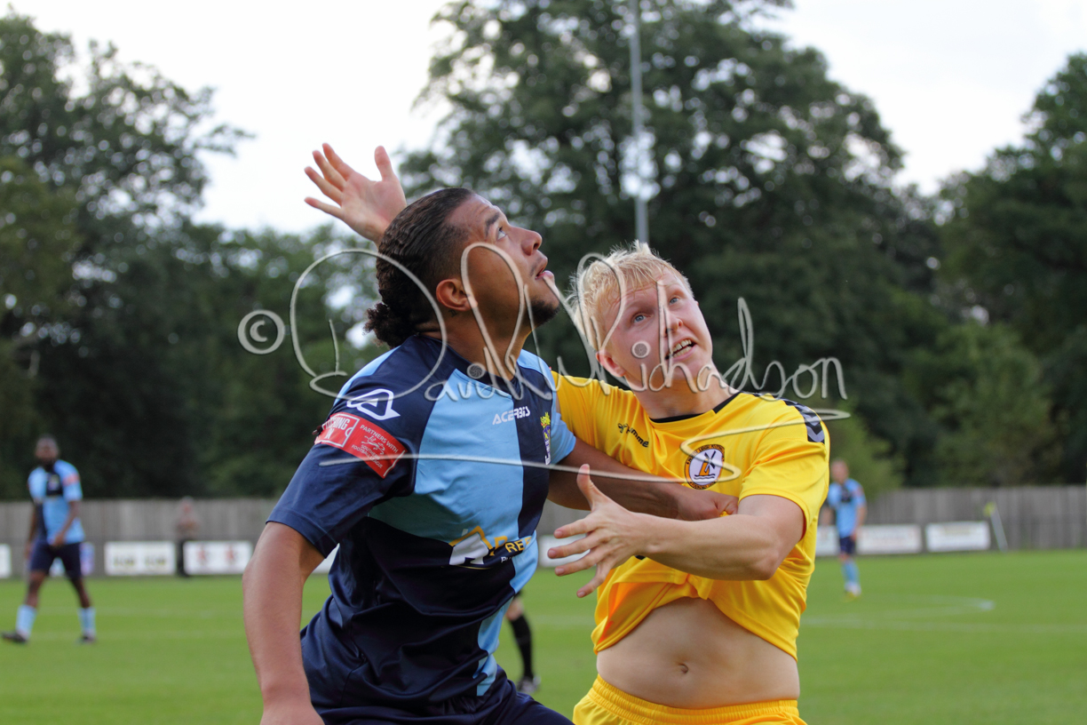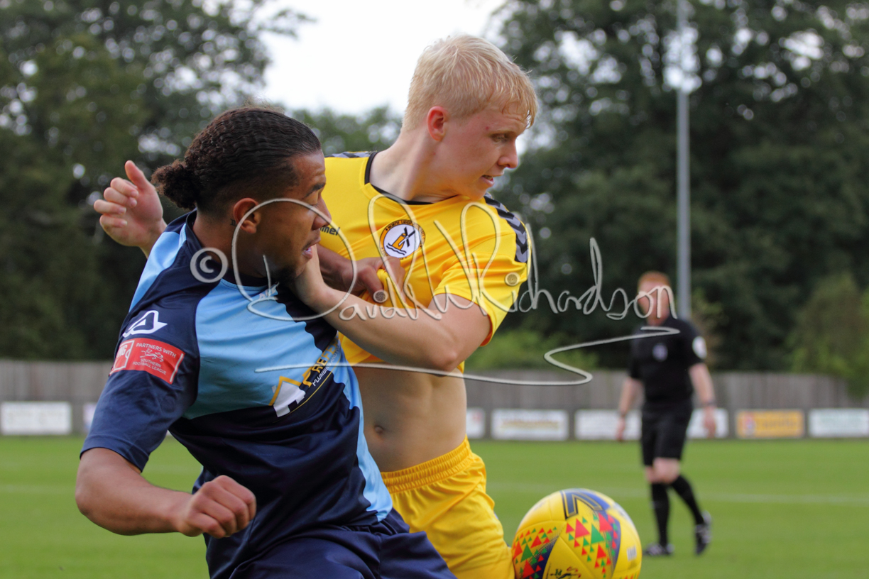 Although the action was stop/start with the over fussy official booking four players in the first 26 minutes – two from each side – with only one of those cautions looking warranted, when Ben Heal was brough down by Roger James. The action that was worthy of mention was Neo Richard-Noel weaving his way past two defenders, but Adam North saved well, and a second effort by the same visiting player also saved. As early as the 19th minute Erin Amu suffered an injury which saw Joe Sutton back in action and the home side only twice seriously threatened the St Neots goal late in the half when following a free kick, a close range shot from Lance Williams was bravely blocked by Chadwick and a second effort – the best chance of the first half – coming from a Roger James cross that found the head of Williams, but to St Neots’ relief he headed wide when scoring looked easier.