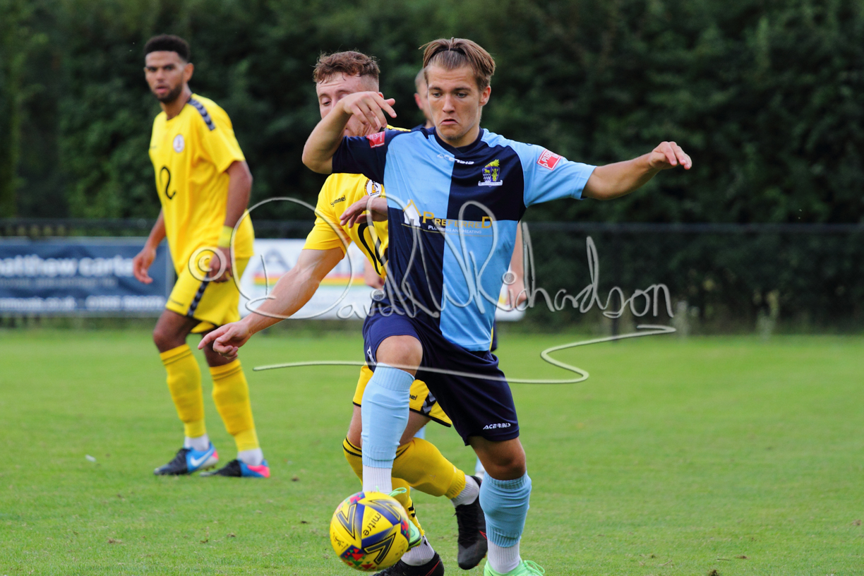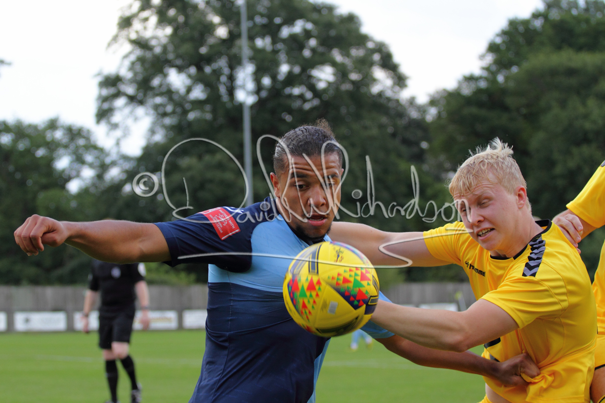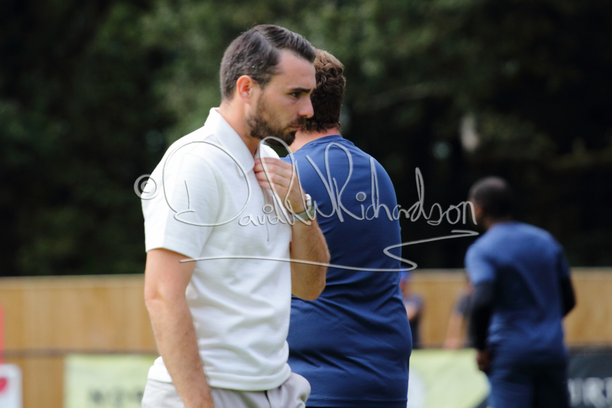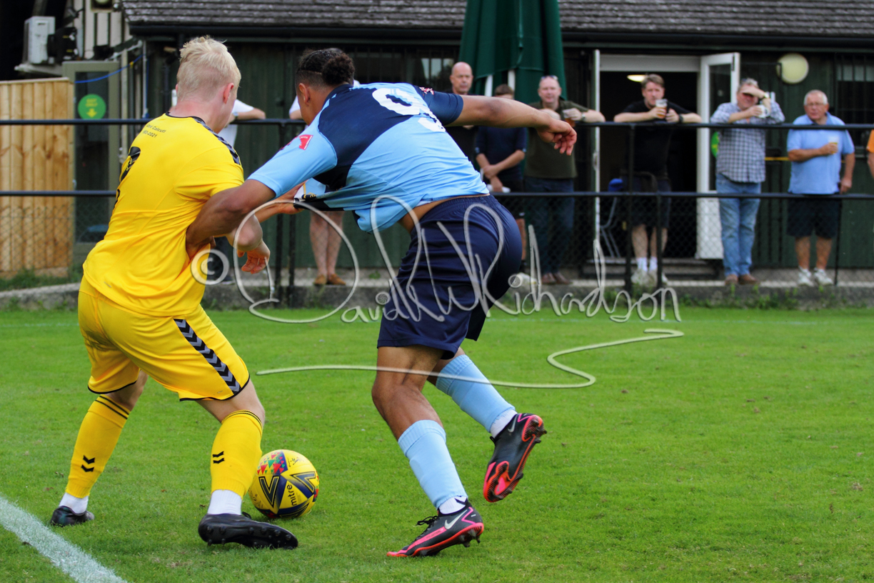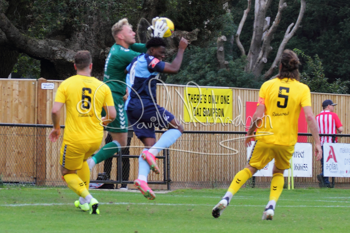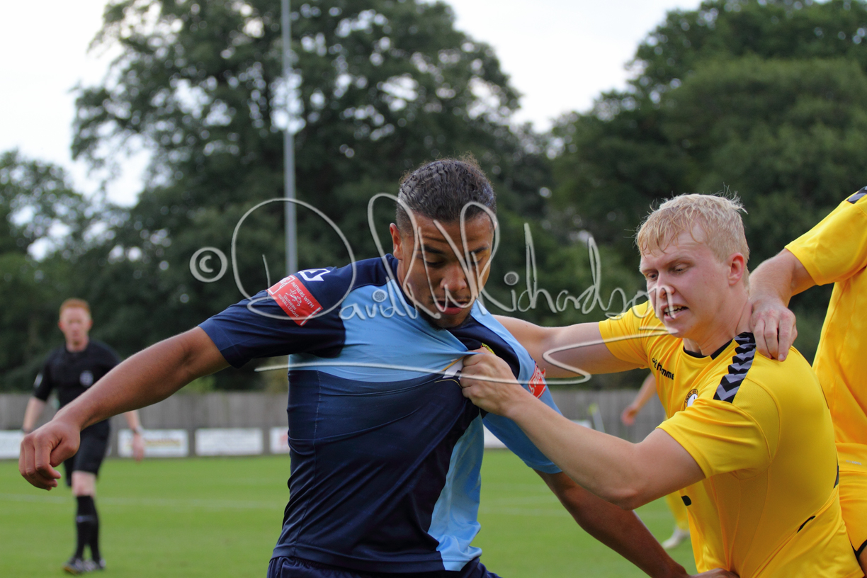 Although the action was stop/start with the over fussy official booking four players in the first 26 minutes – two from each side – with only one of those cautions looking warranted, when Ben Heal was brough down by Roger James. The action that was worthy of mention was Neo Richard-Noel weaving his way past two defenders, but Adam North saved well, and a second effort by the same visiting player also saved. As early as the 19th minute Erin Amu suffered an injury which saw Joe Sutton back in action and the home side only twice seriously threatened the St Neots goal late in the half when following a free kick, a close range shot from Lance Williams was bravely blocked by Chadwick and a second effort – the best chance of the first half – coming from a Roger James cross that found the head of Williams, but to St Neots’ relief he headed wide when scoring looked easier.