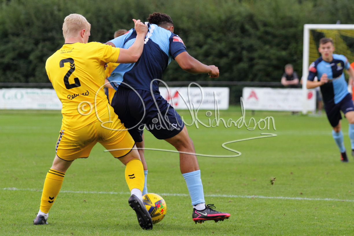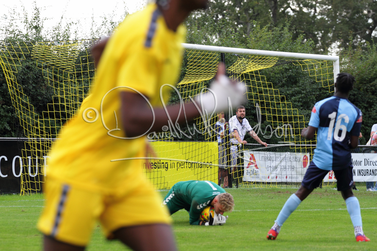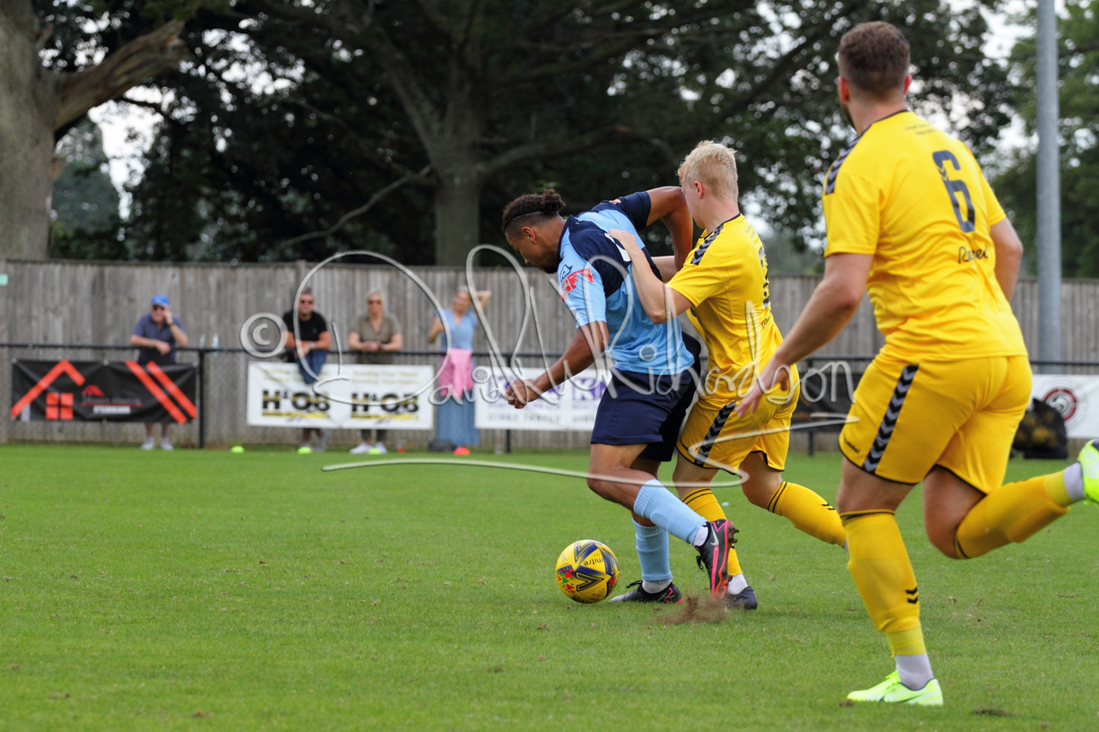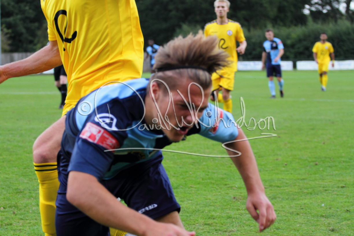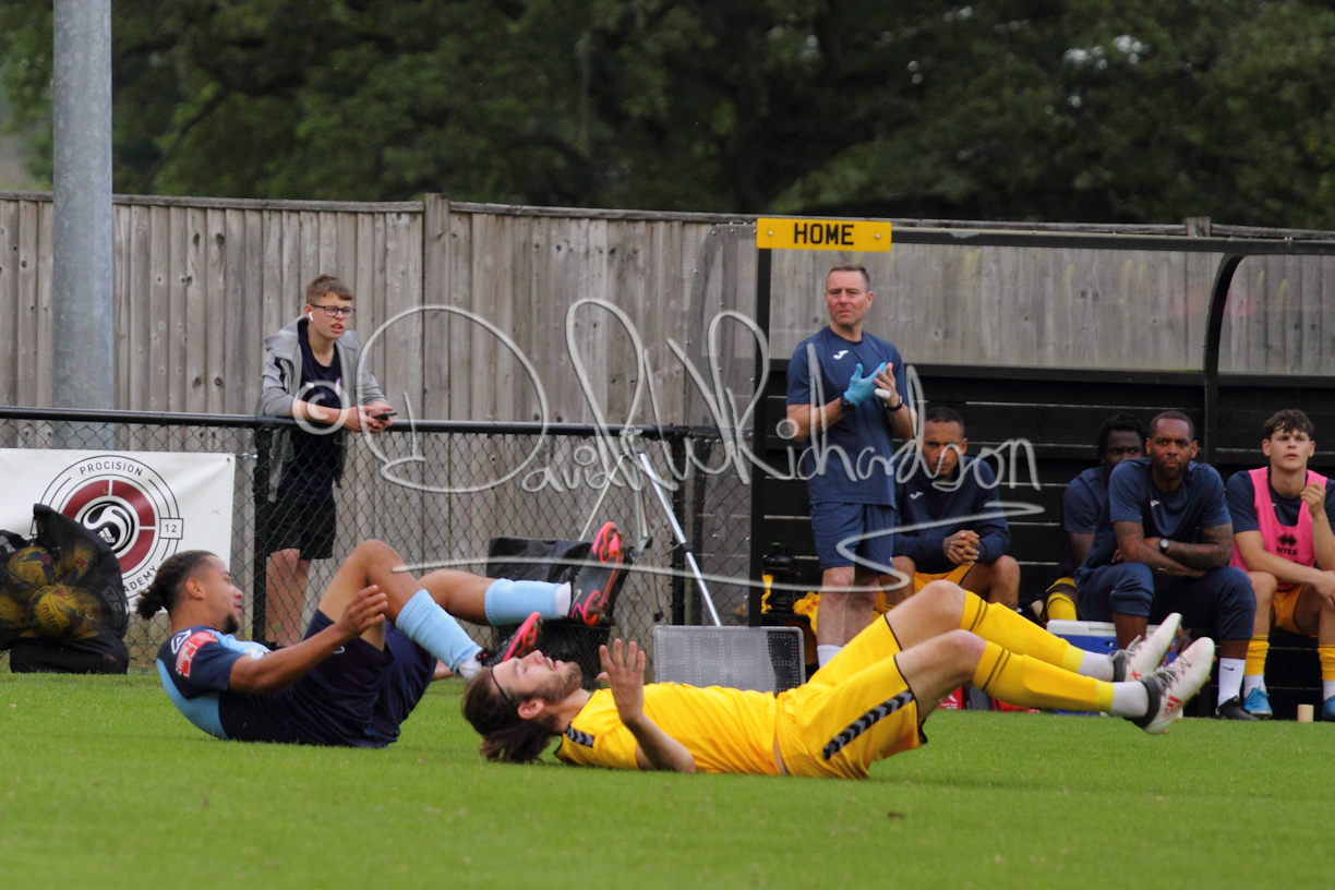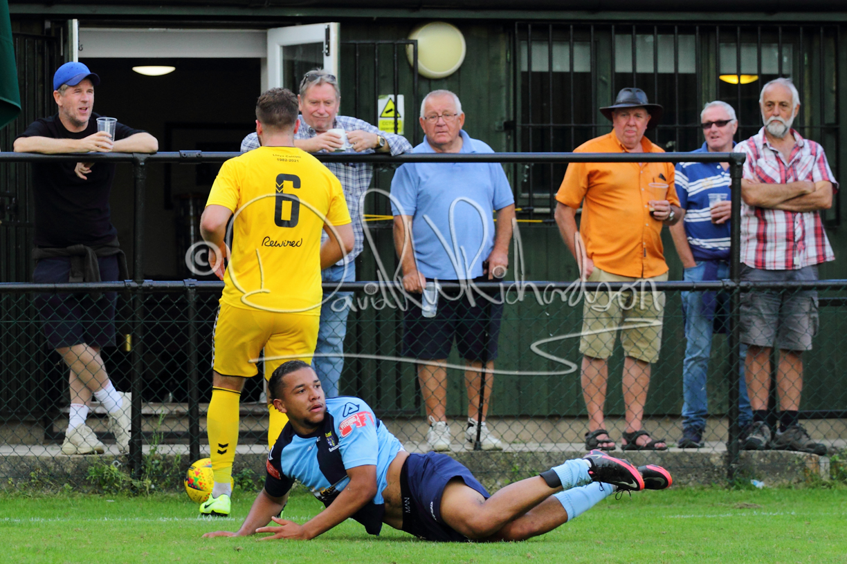 Although the action was stop/start with the over fussy official booking four players in the first 26 minutes – two from each side – with only one of those cautions looking warranted, when Ben Heal was brough down by Roger James. The action that was worthy of mention was Neo Richard-Noel weaving his way past two defenders, but Adam North saved well, and a second effort by the same visiting player also saved. As early as the 19th minute Erin Amu suffered an injury which saw Joe Sutton back in action and the home side only twice seriously threatened the St Neots goal late in the half when following a free kick, a close range shot from Lance Williams was bravely blocked by Chadwick and a second effort – the best chance of the first half – coming from a Roger James cross that found the head of Williams, but to St Neots’ relief he headed wide when scoring looked easier.