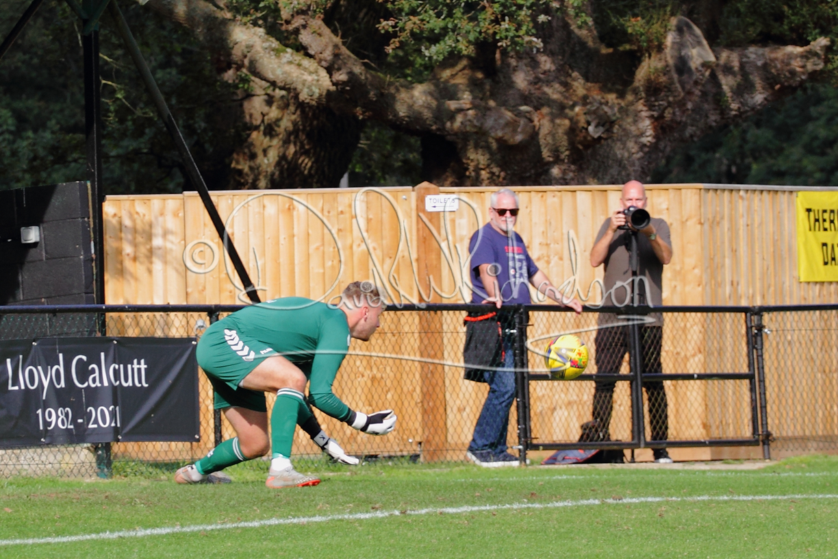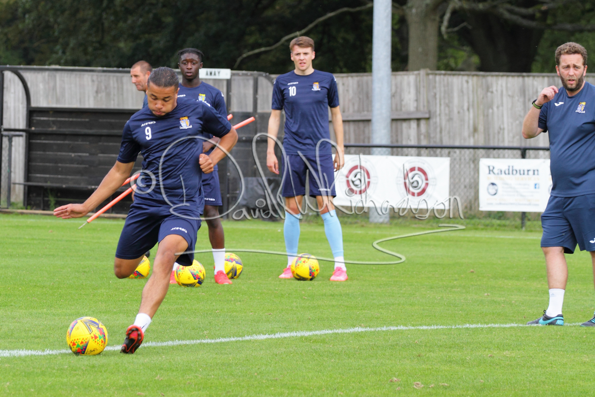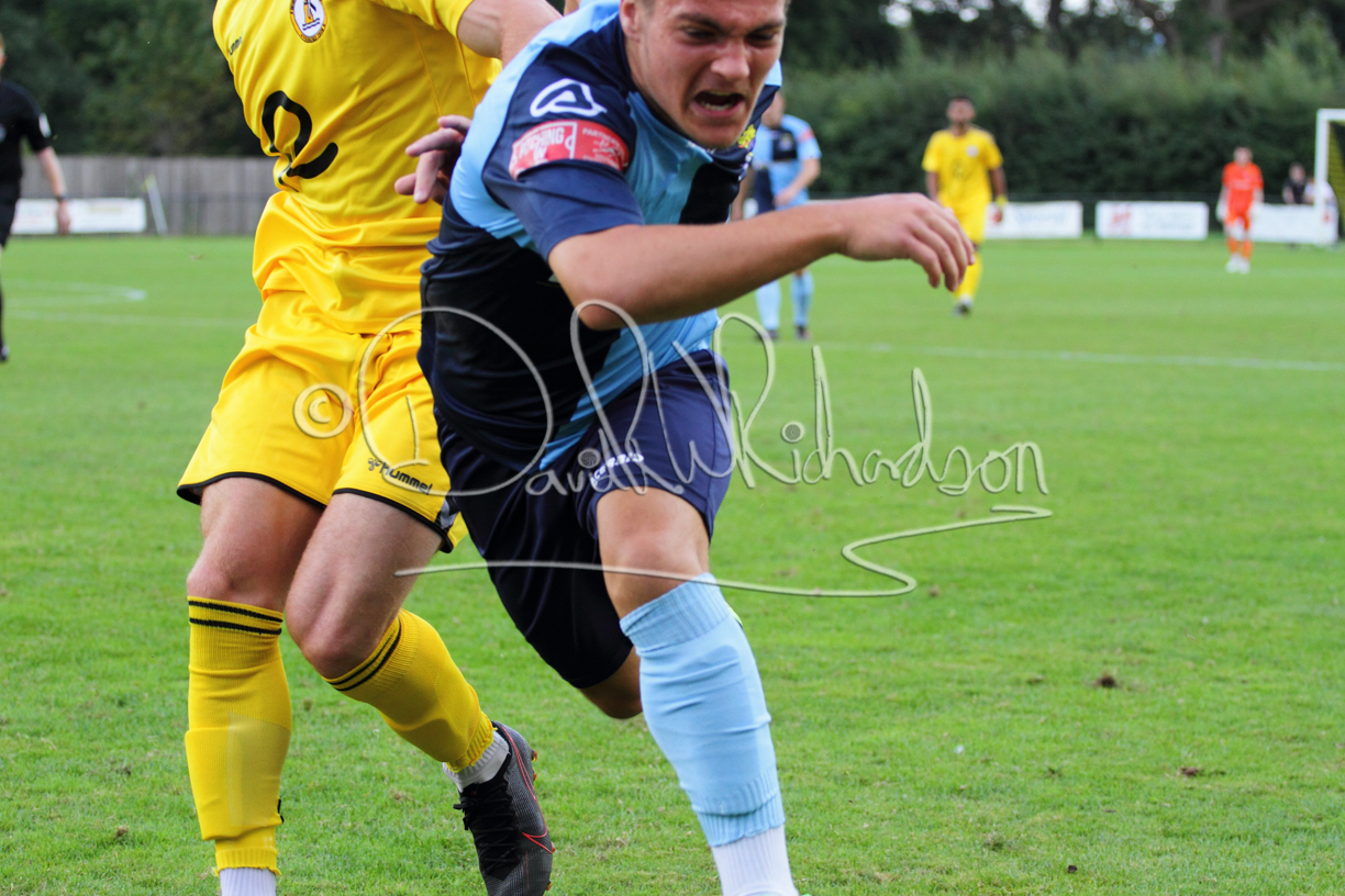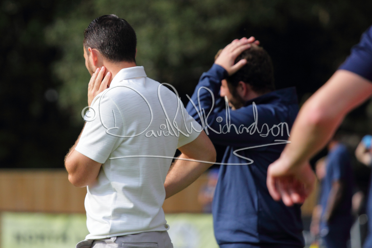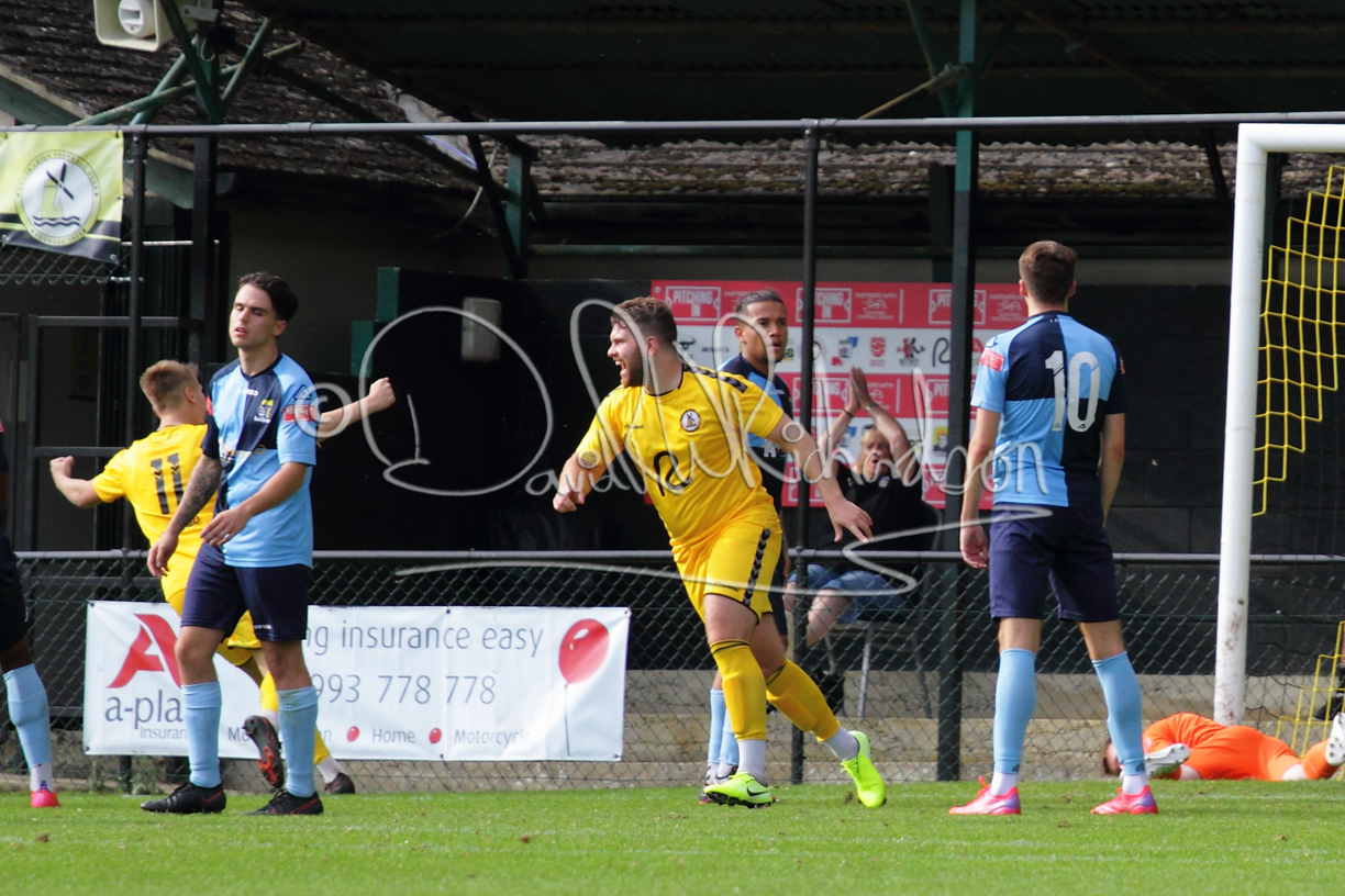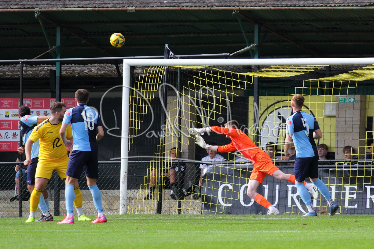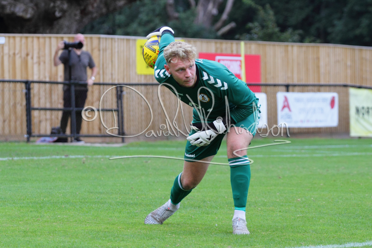 Although the action was stop/start with the over fussy official booking four players in the first 26 minutes – two from each side – with only one of those cautions looking warranted, when Ben Heal was brough down by Roger James. The action that was worthy of mention was Neo Richard-Noel weaving his way past two defenders, but Adam North saved well, and a second effort by the same visiting player also saved. As early as the 19th minute Erin Amu suffered an injury which saw Joe Sutton back in action and the home side only twice seriously threatened the St Neots goal late in the half when following a free kick, a close range shot from Lance Williams was bravely blocked by Chadwick and a second effort – the best chance of the first half – coming from a Roger James cross that found the head of Williams, but to St Neots’ relief he headed wide when scoring looked easier.