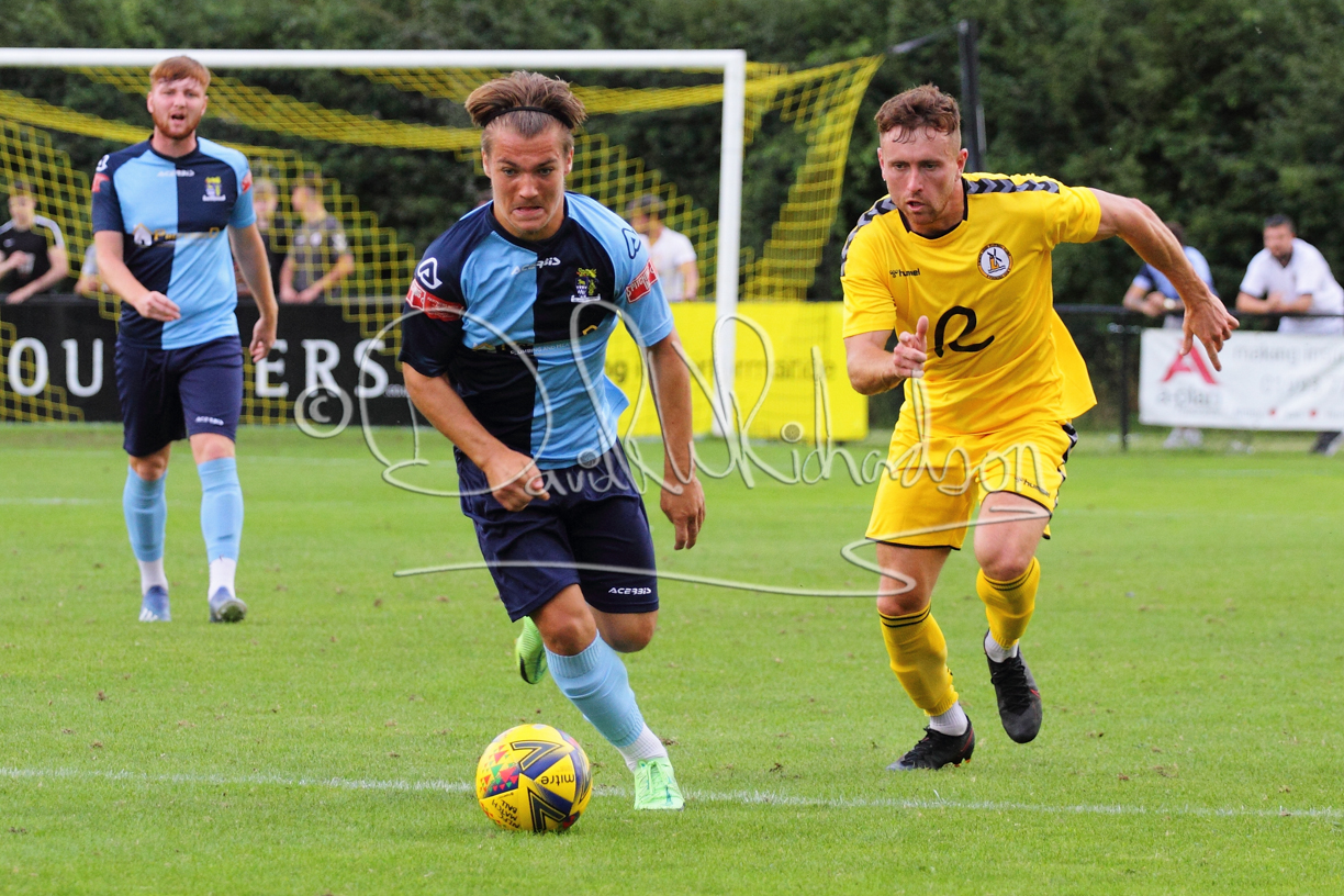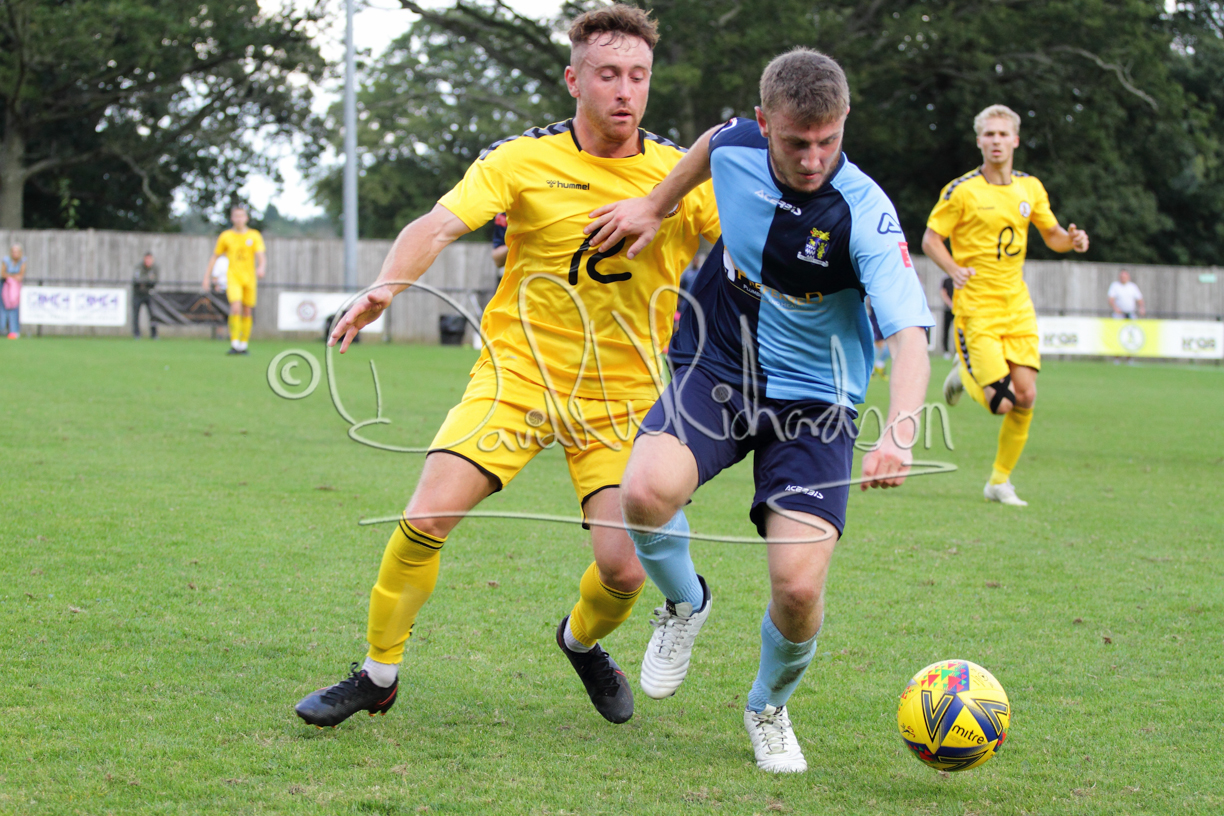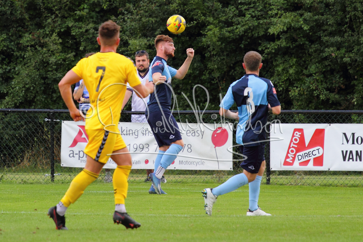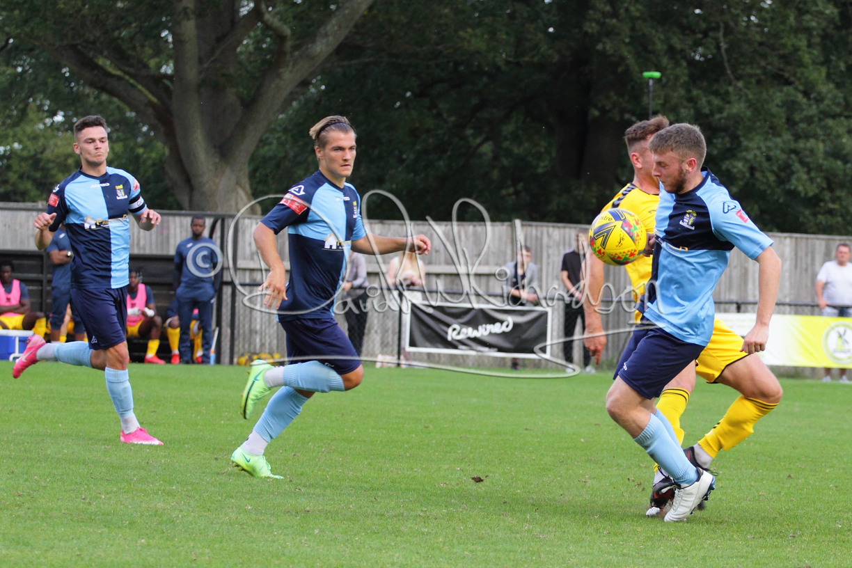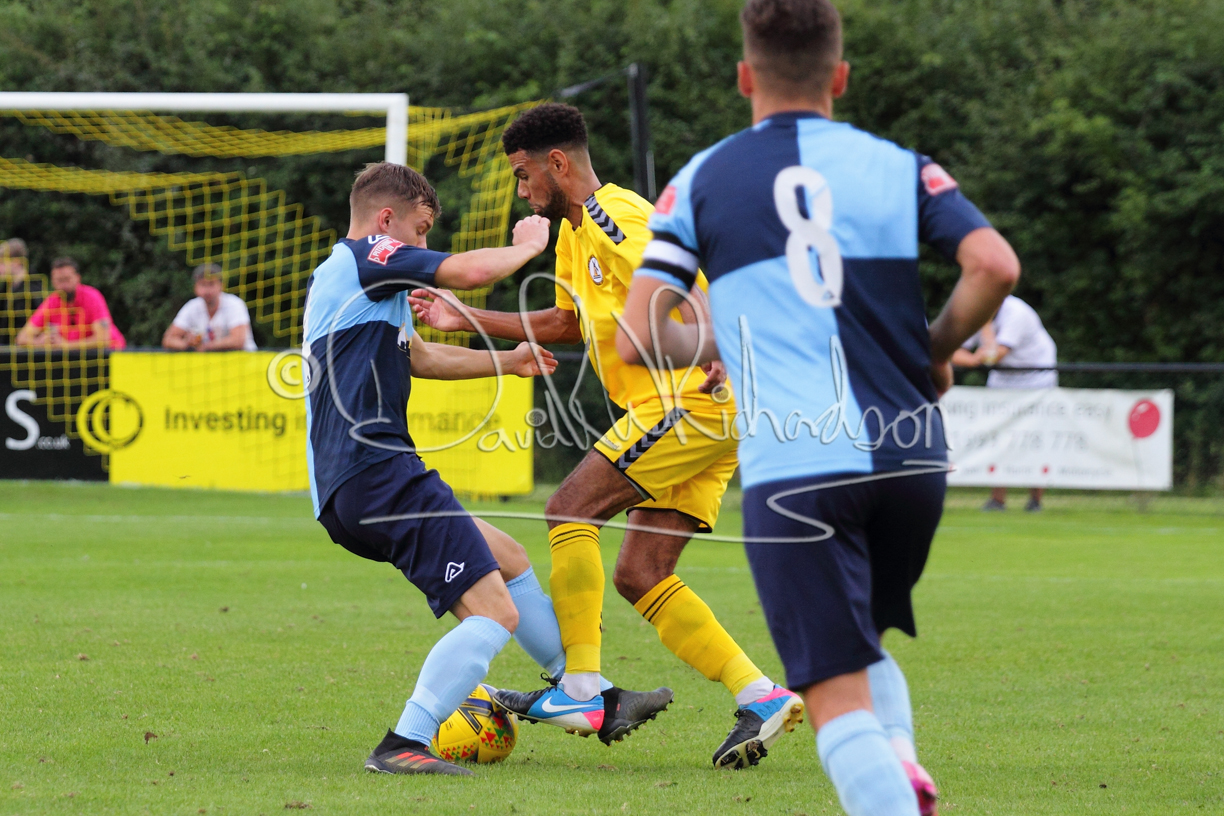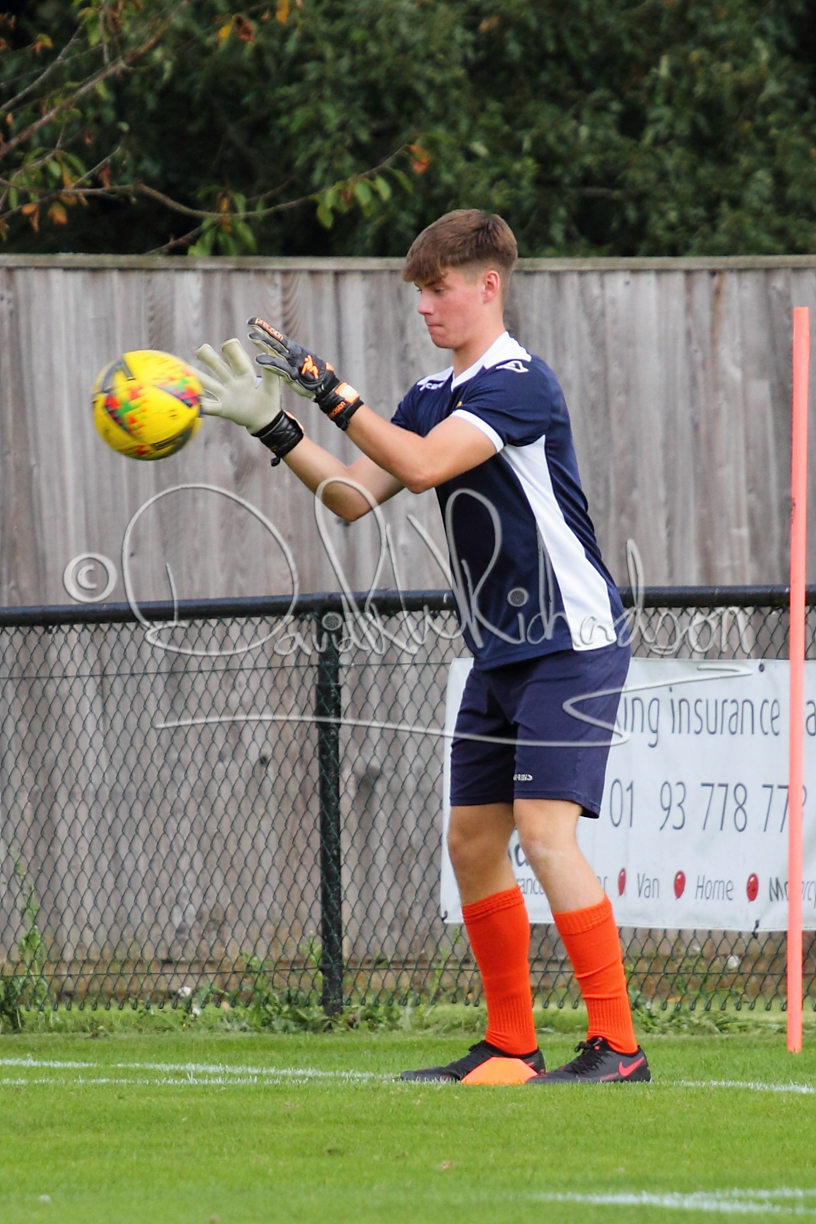 Although the action was stop/start with the over fussy official booking four players in the first 26 minutes – two from each side – with only one of those cautions looking warranted, when Ben Heal was brough down by Roger James. The action that was worthy of mention was Neo Richard-Noel weaving his way past two defenders, but Adam North saved well, and a second effort by the same visiting player also saved. As early as the 19th minute Erin Amu suffered an injury which saw Joe Sutton back in action and the home side only twice seriously threatened the St Neots goal late in the half when following a free kick, a close range shot from Lance Williams was bravely blocked by Chadwick and a second effort – the best chance of the first half – coming from a Roger James cross that found the head of Williams, but to St Neots’ relief he headed wide when scoring looked easier.