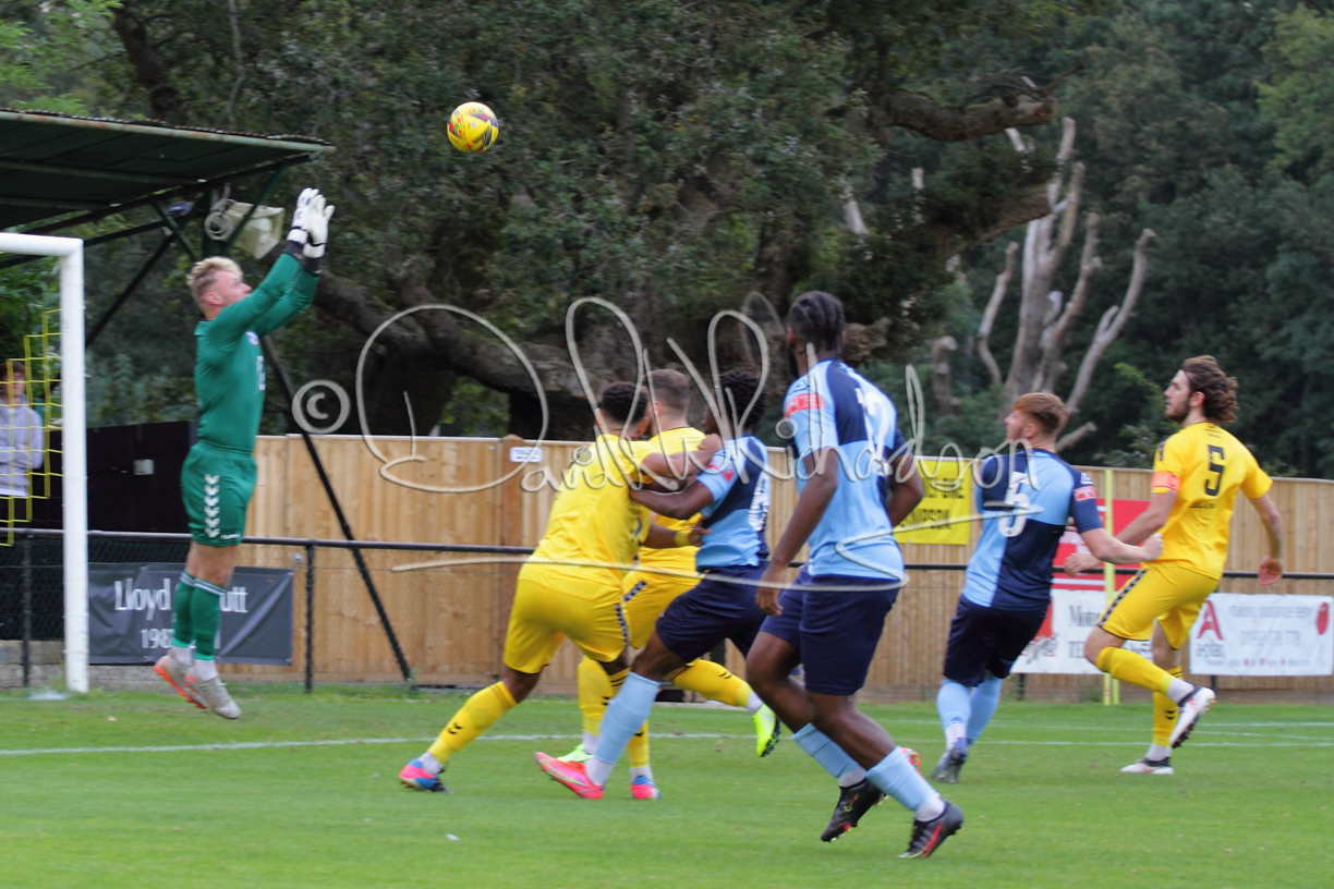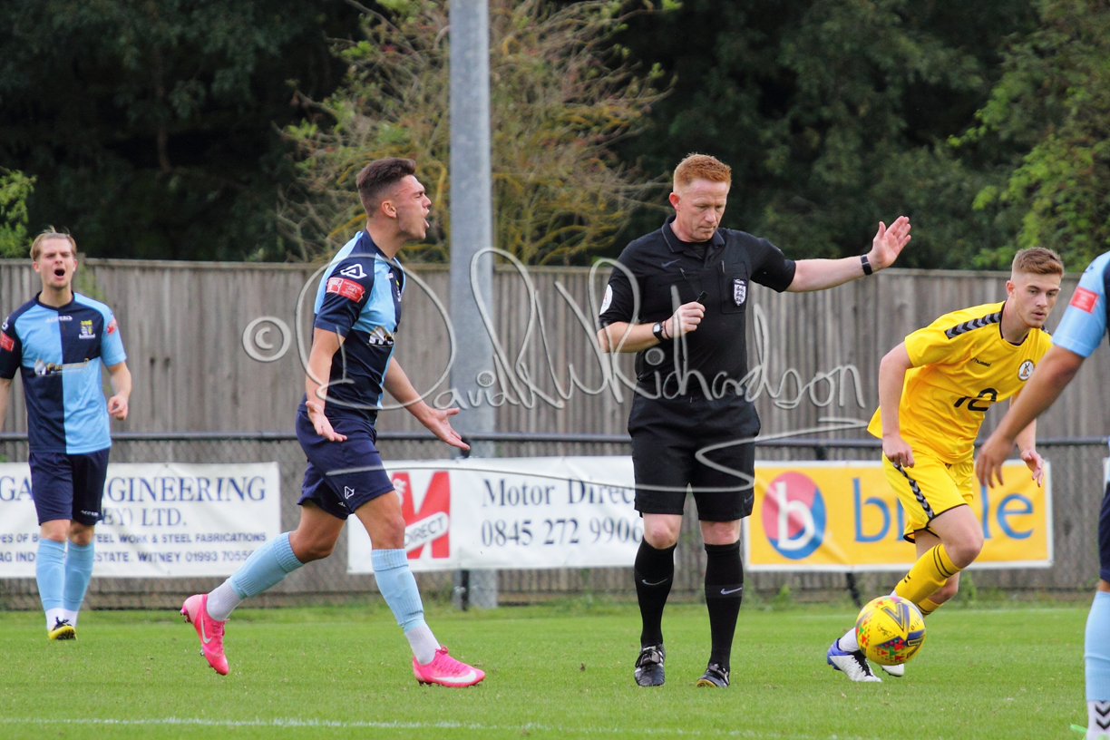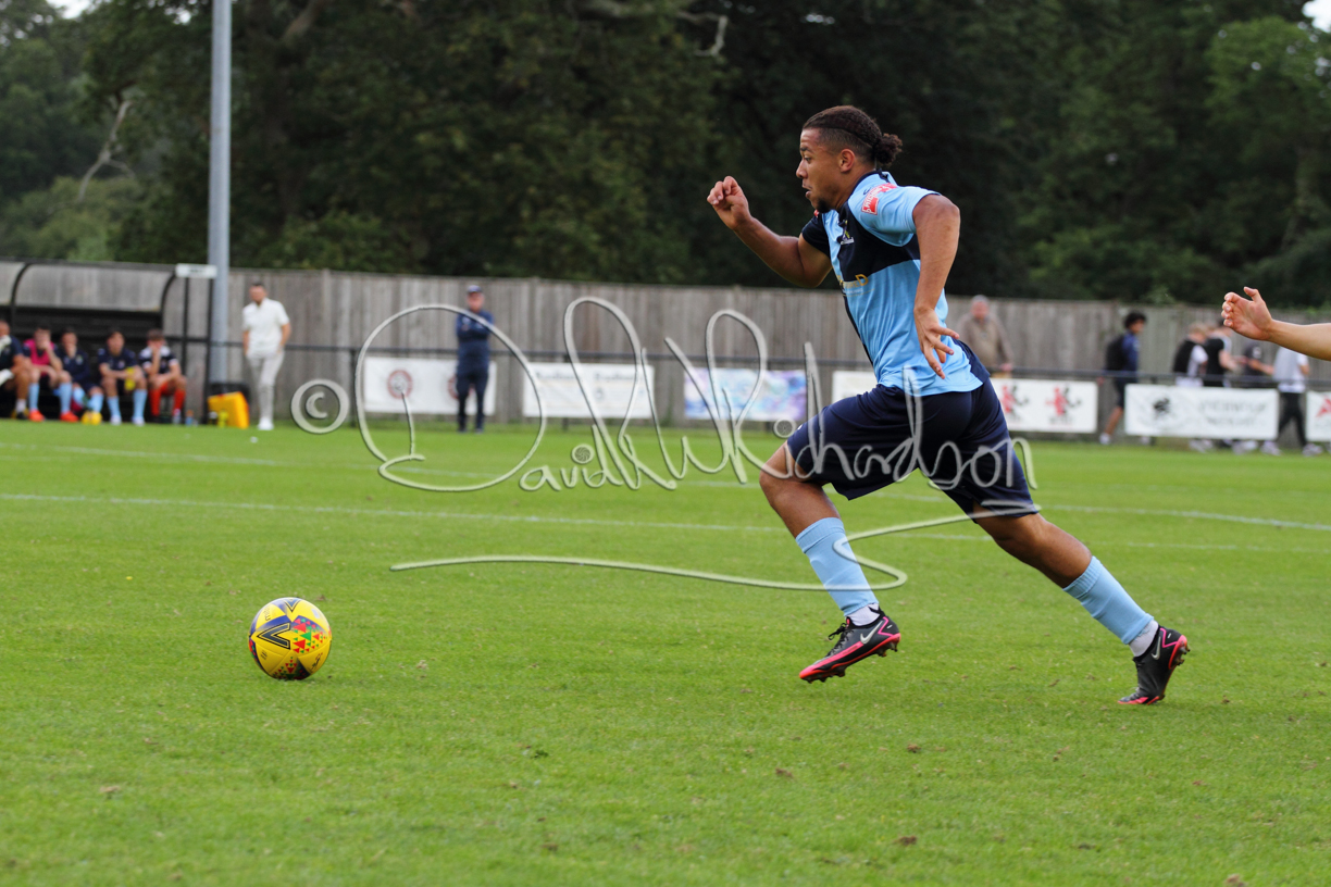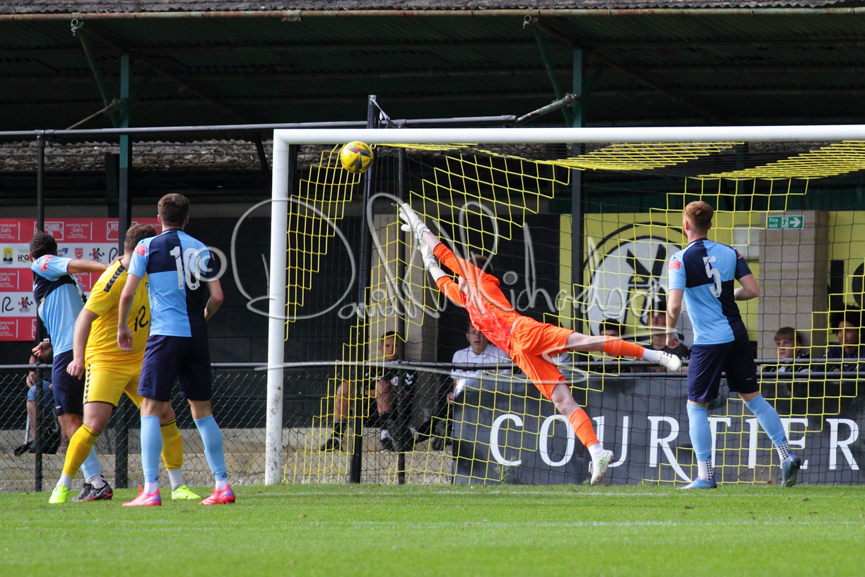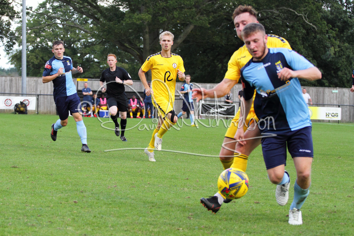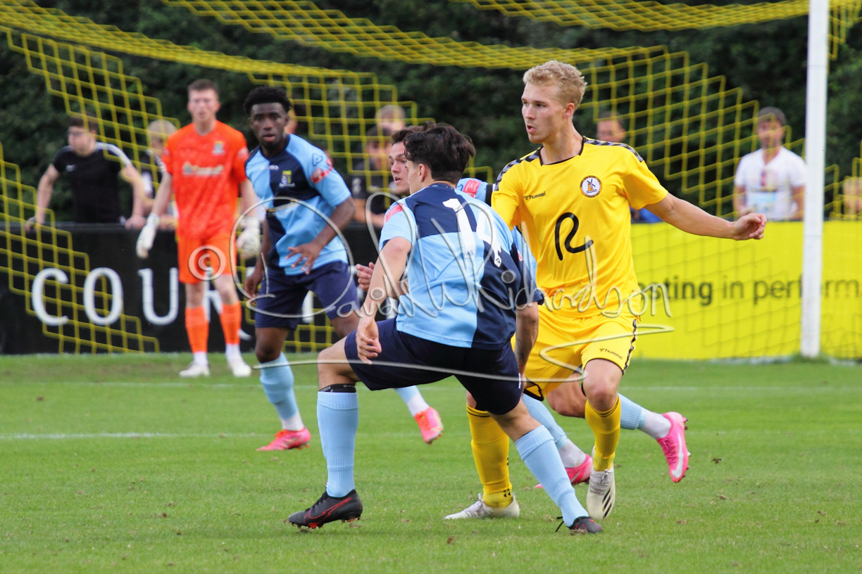 Although the action was stop/start with the over fussy official booking four players in the first 26 minutes – two from each side – with only one of those cautions looking warranted, when Ben Heal was brough down by Roger James. The action that was worthy of mention was Neo Richard-Noel weaving his way past two defenders, but Adam North saved well, and a second effort by the same visiting player also saved. As early as the 19th minute Erin Amu suffered an injury which saw Joe Sutton back in action and the home side only twice seriously threatened the St Neots goal late in the half when following a free kick, a close range shot from Lance Williams was bravely blocked by Chadwick and a second effort – the best chance of the first half – coming from a Roger James cross that found the head of Williams, but to St Neots’ relief he headed wide when scoring looked easier.