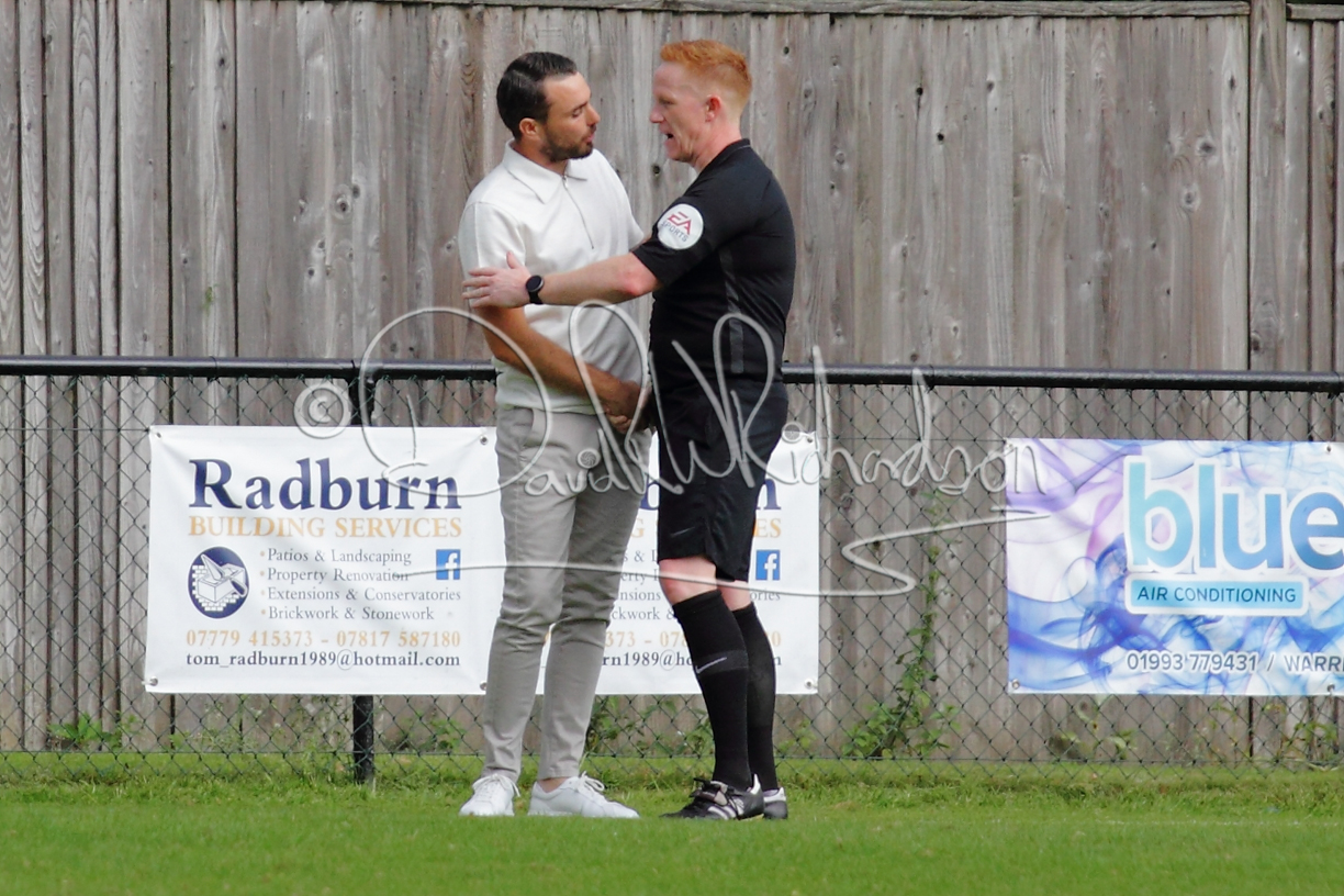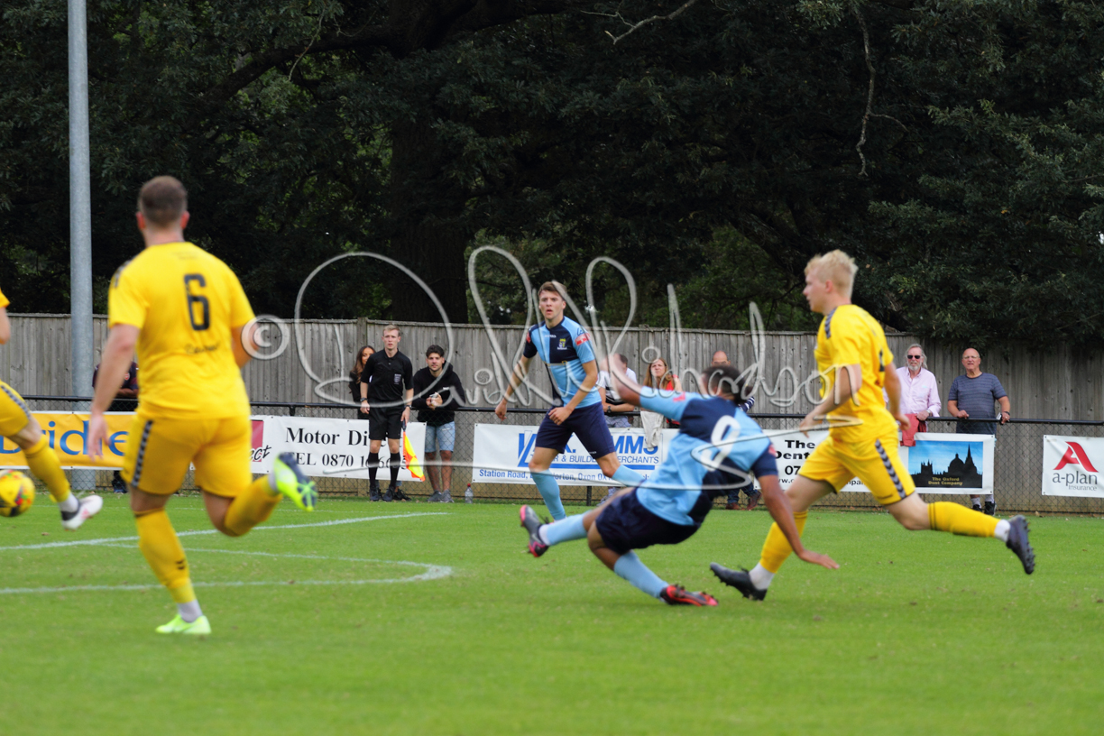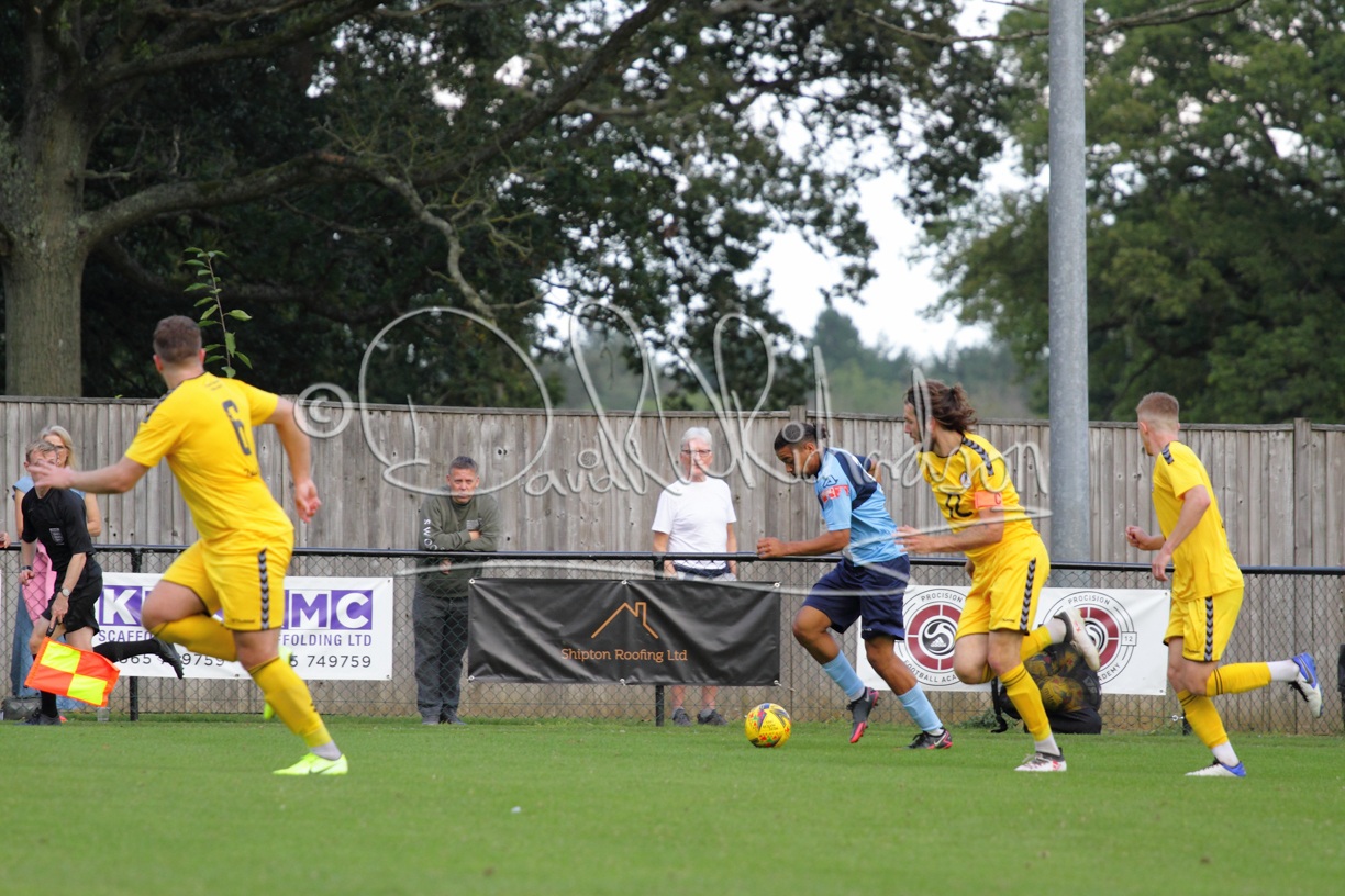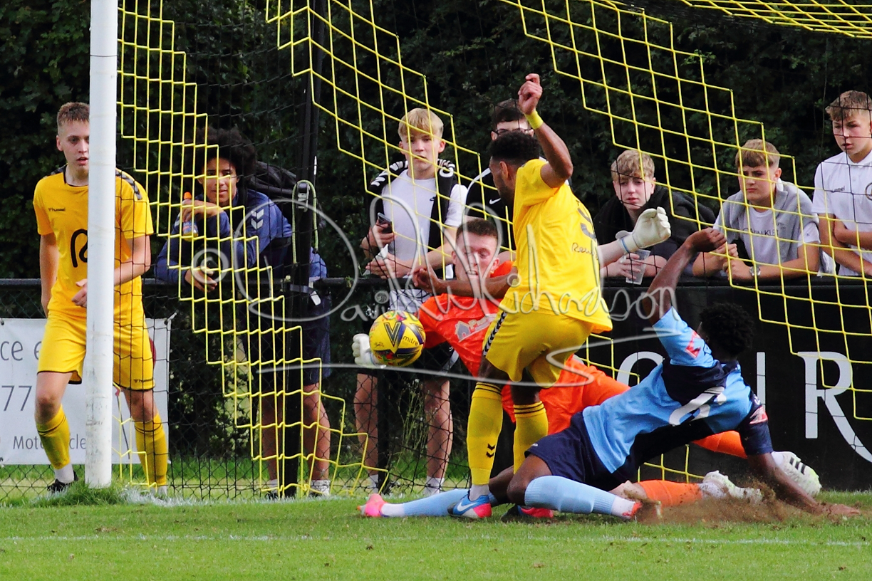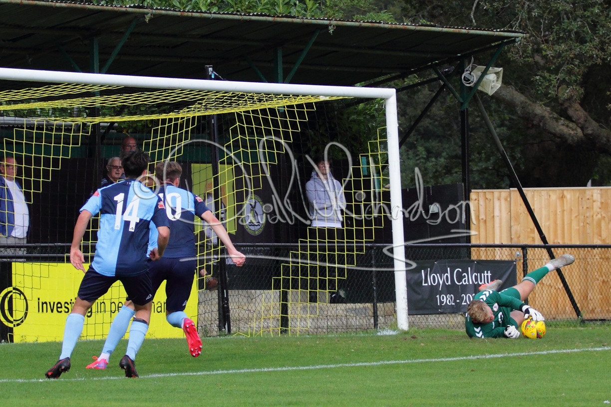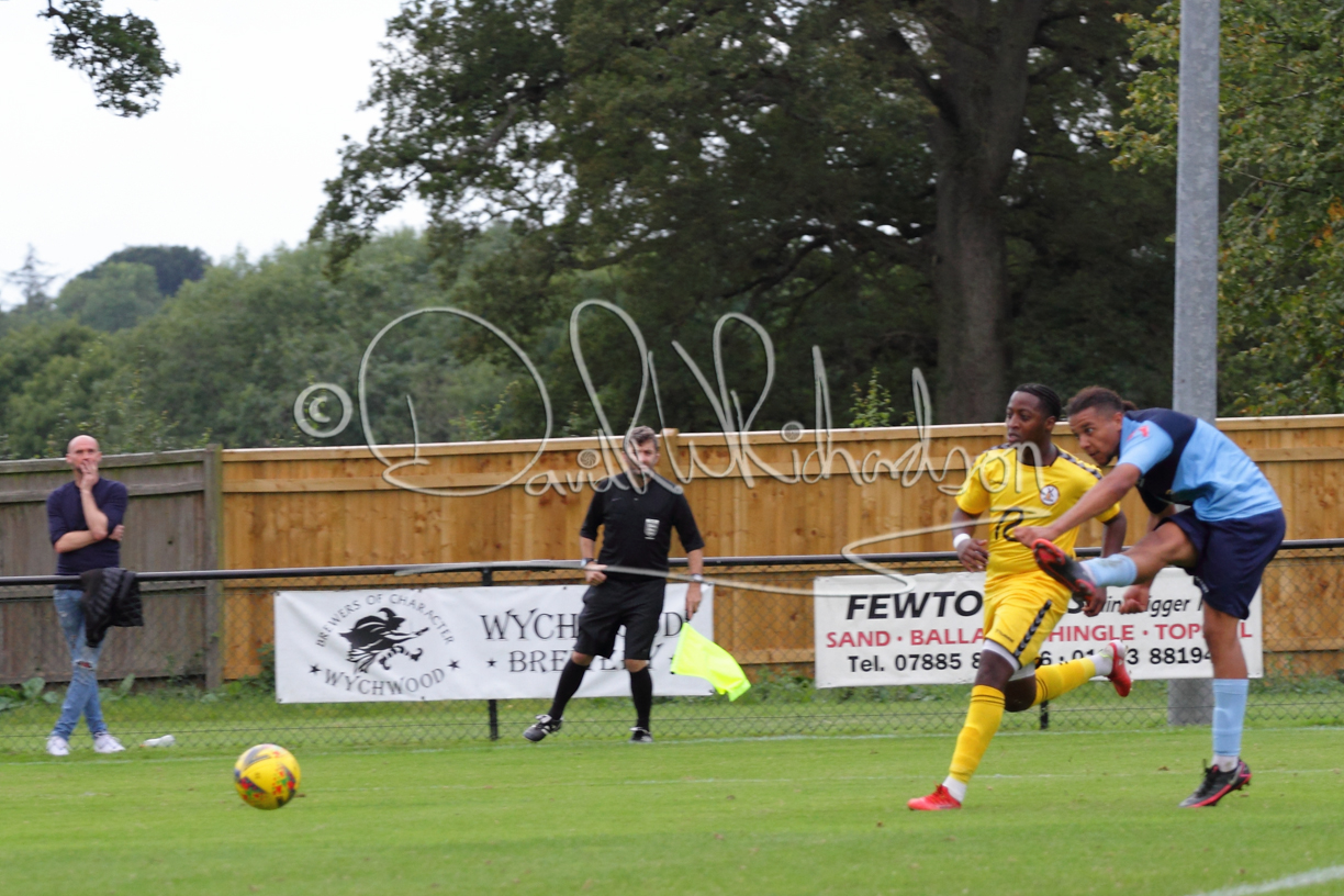Although the action was stop/start with the over fussy official booking four players in the first 26 minutes – two from each side – with only one of those cautions looking warranted, when Ben Heal was brough down by Roger James. The action that was worthy of mention was Neo Richard-Noel weaving his way past two defenders, but Adam North saved well, and a second effort by the same visiting player also saved. As early as the 19th minute Erin Amu suffered an injury which saw Joe Sutton back in action and the home side only twice seriously threatened the St Neots goal late in the half when following a free kick, a close range shot from Lance Williams was bravely blocked by Chadwick and a second effort – the best chance of the first half – coming from a Roger James cross that found the head of Williams, but to St Neots’ relief he headed wide when scoring looked easier.