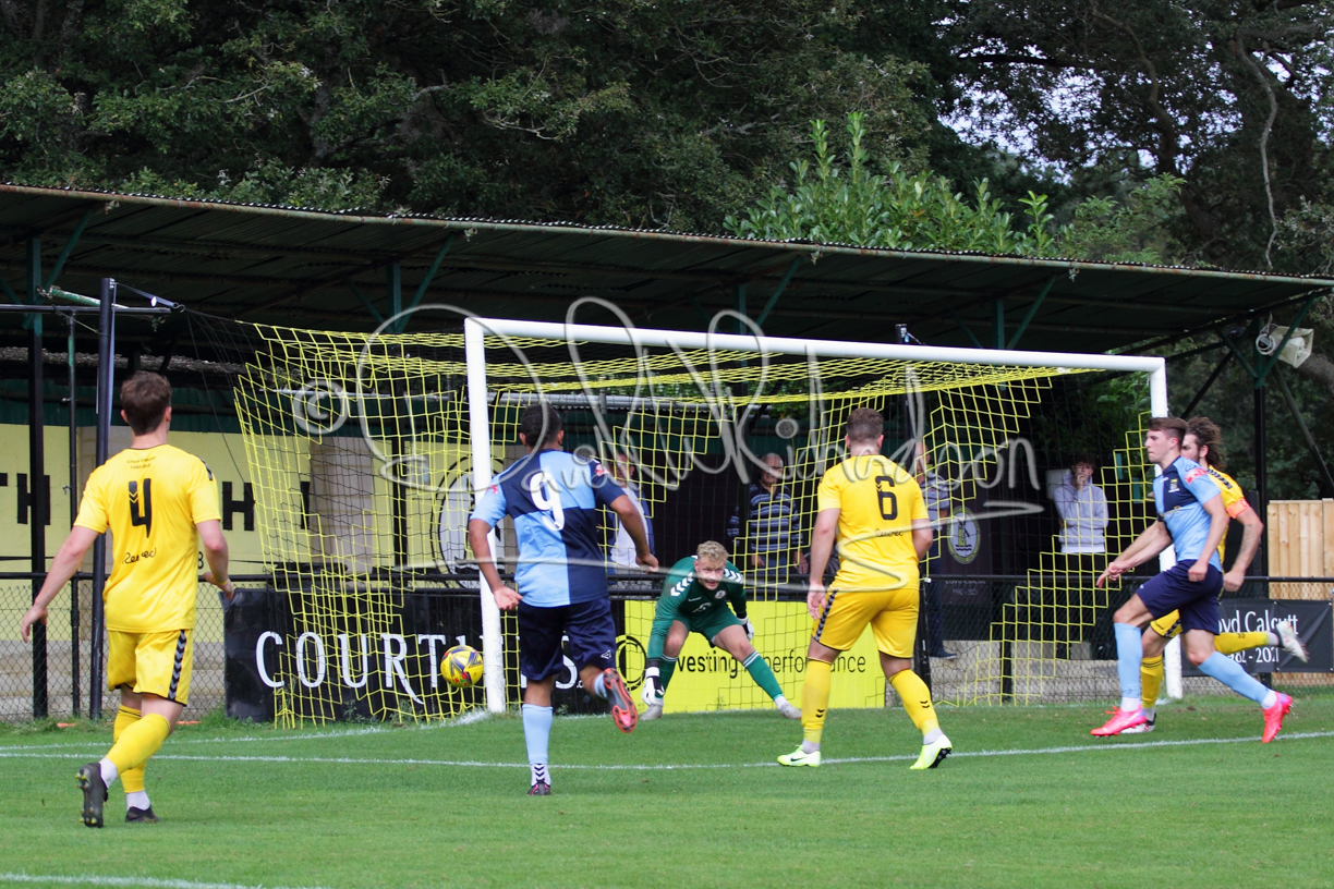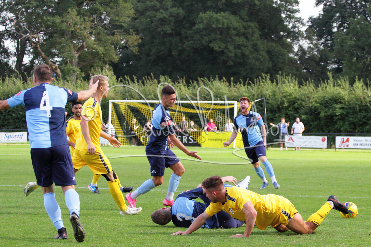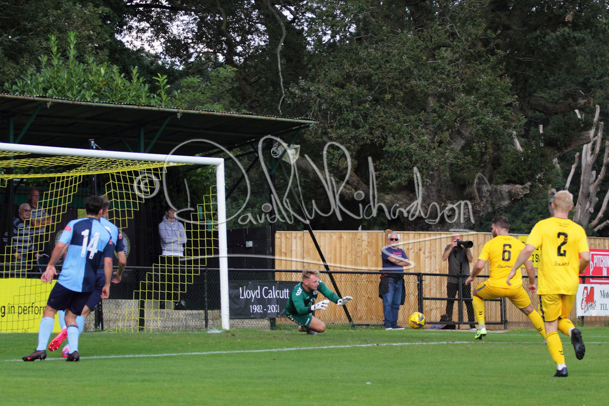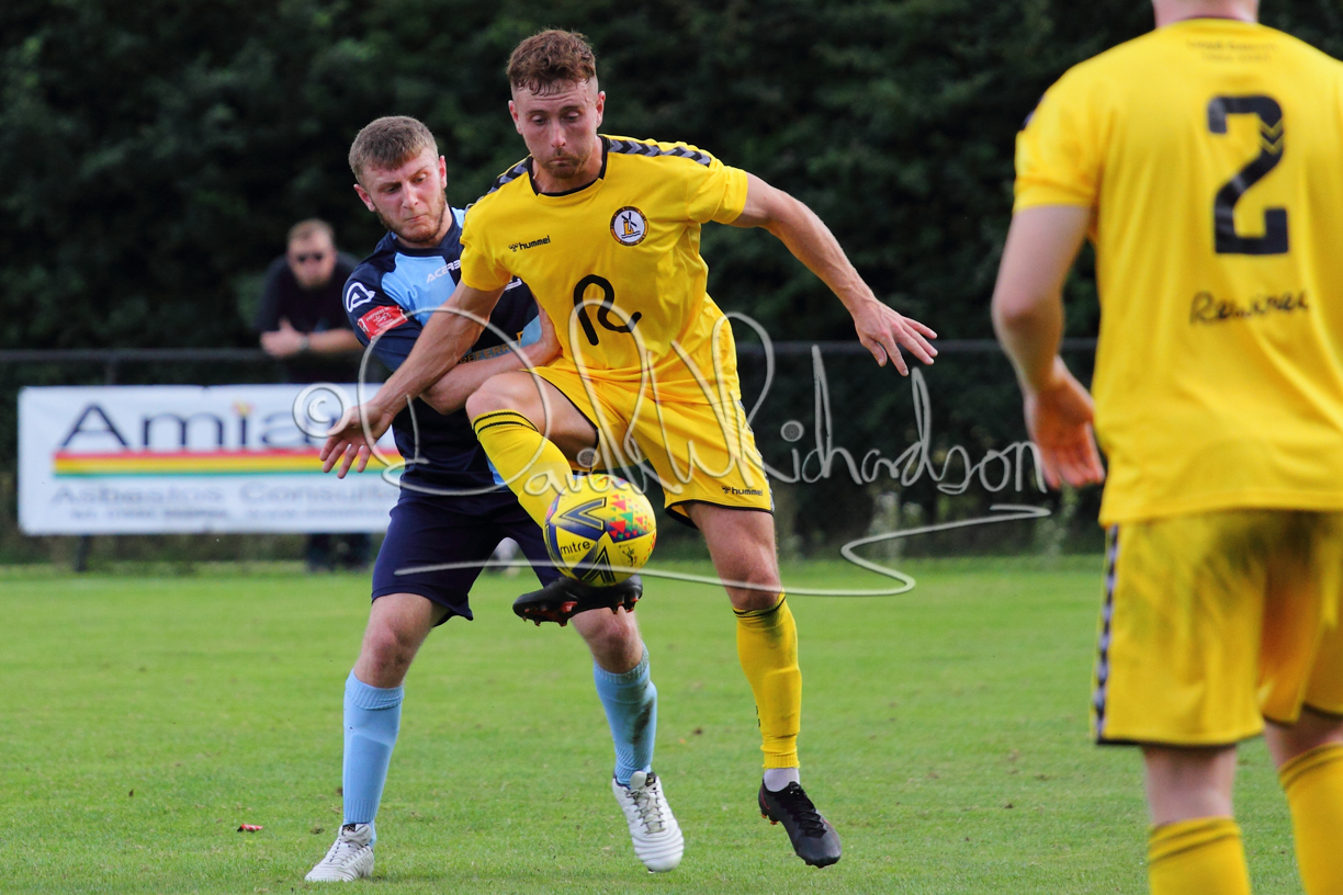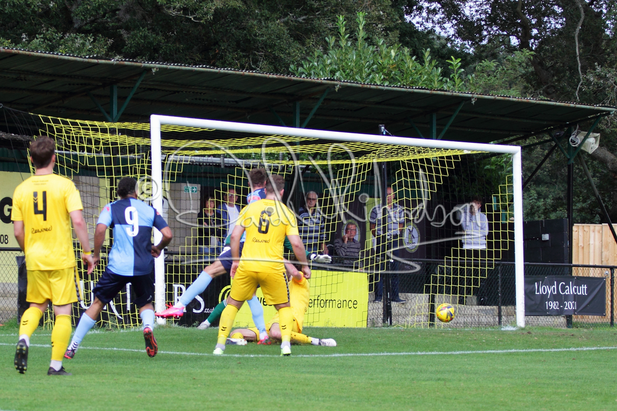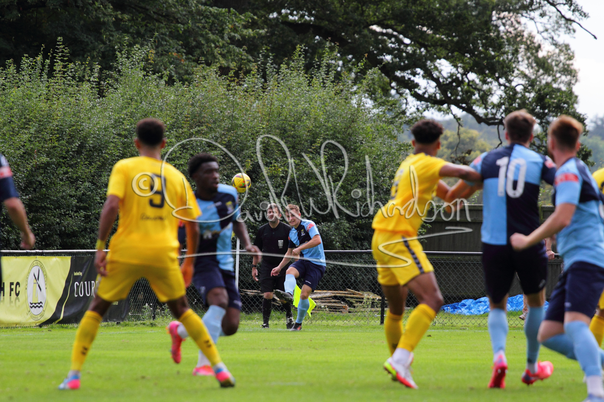 Although the action was stop/start with the over fussy official booking four players in the first 26 minutes – two from each side – with only one of those cautions looking warranted, when Ben Heal was brough down by Roger James. The action that was worthy of mention was Neo Richard-Noel weaving his way past two defenders, but Adam North saved well, and a second effort by the same visiting player also saved. As early as the 19th minute Erin Amu suffered an injury which saw Joe Sutton back in action and the home side only twice seriously threatened the St Neots goal late in the half when following a free kick, a close range shot from Lance Williams was bravely blocked by Chadwick and a second effort – the best chance of the first half – coming from a Roger James cross that found the head of Williams, but to St Neots’ relief he headed wide when scoring looked easier.