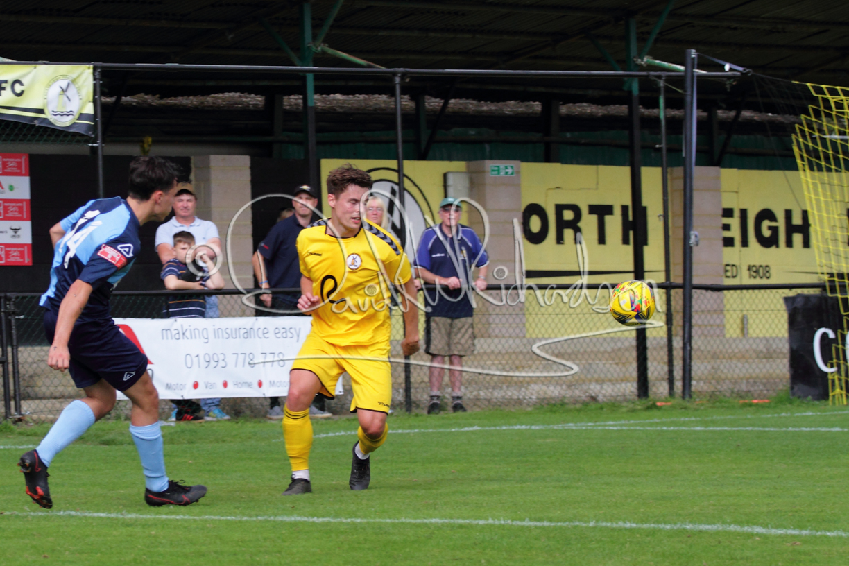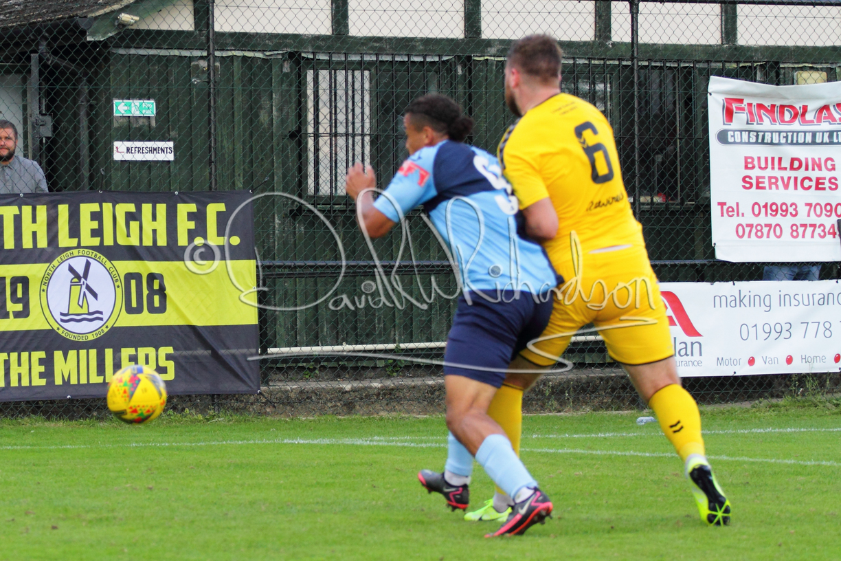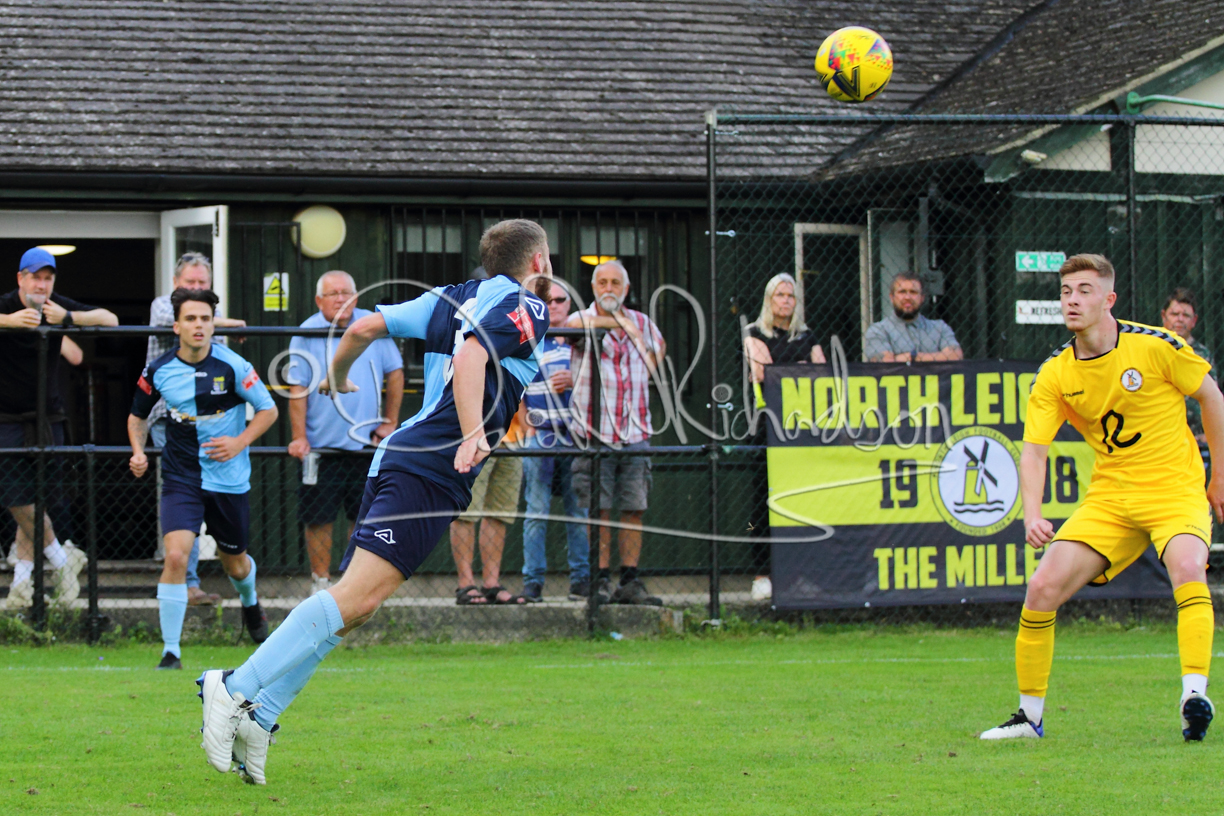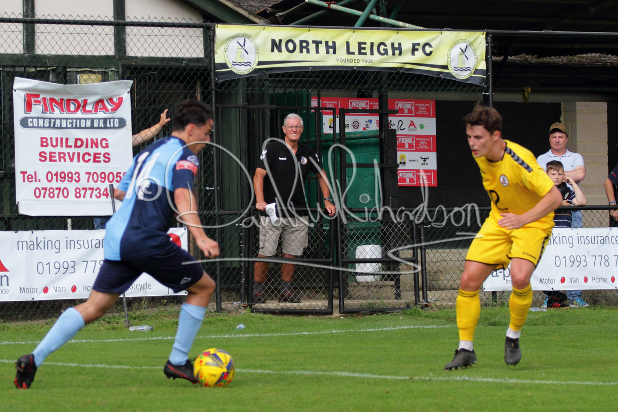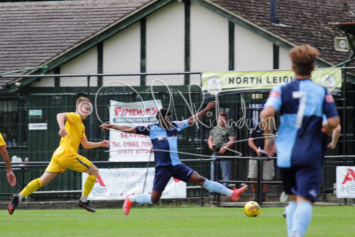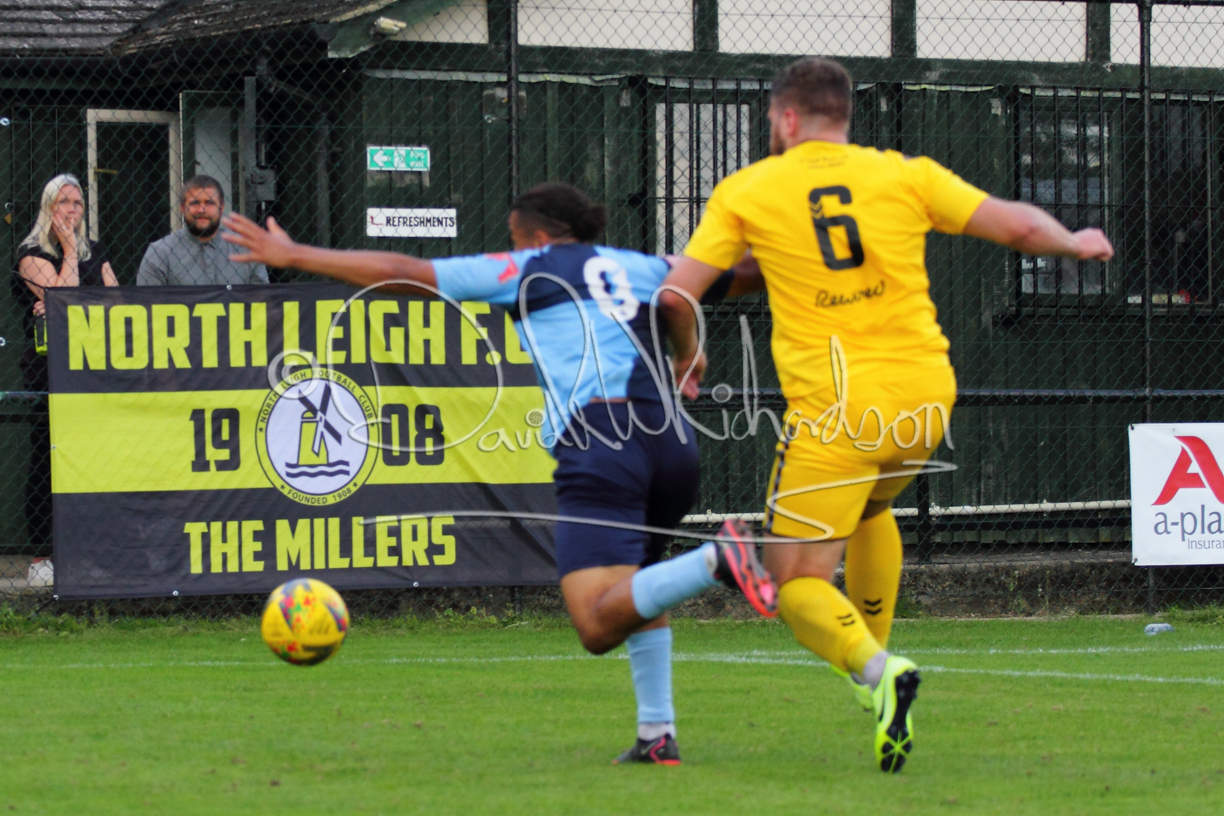 The Referee was in action two minutes in to the second half booking a third home player for an innocuous looking challenge but just sixty seconds later North Leigh took the lead. Another free kick just outside the penalty area delivered by Aaron Heap, saw the tall Luke Carnell outjump the defence and net with a perfectly placed header that gave Louis Chadwick no chance. St Neots tried to boost their defence sending on taller full-back Aaron Smith for Harvey Steel, but by now the home side were relishing their superior possession and midway through the half Jordan Thomas was played clear of the defence but as Louis Chadwick narrowed the angle, he shot tamely wide. After 73 minutes a second goal effectively put the outcome of the match beyond St Neots because they were seldom troubling the home defence. A free kick by Heap was headed back across goal by Carnell and Jensen Wright crashed home an unstoppable shot for that 2-0 lead. Now North Leigh rang the changes with all three permitted substitutes introduced and apart from one shot by Richard-Noel blocked by a defender, St Neots had little to offer, until the final eight minutes when they gave U18 winger Julinho Gomes his first taste of senior football and he responded with two searching contributions – the first a cross just beyond the two St Neots attackers and the second a lob over the advancing goalkeeper that only just cleared the crossbar.