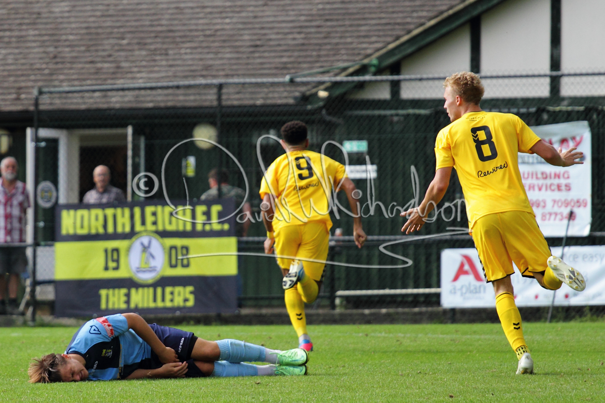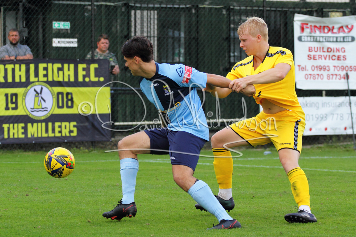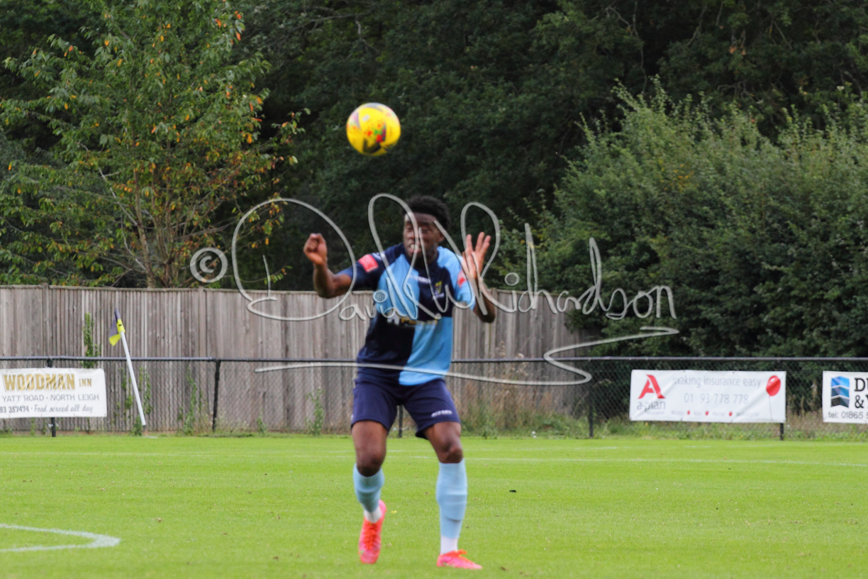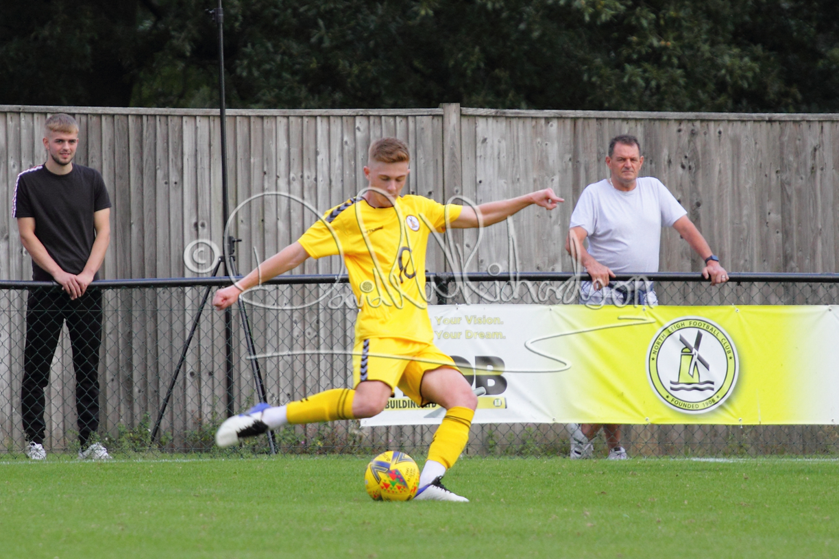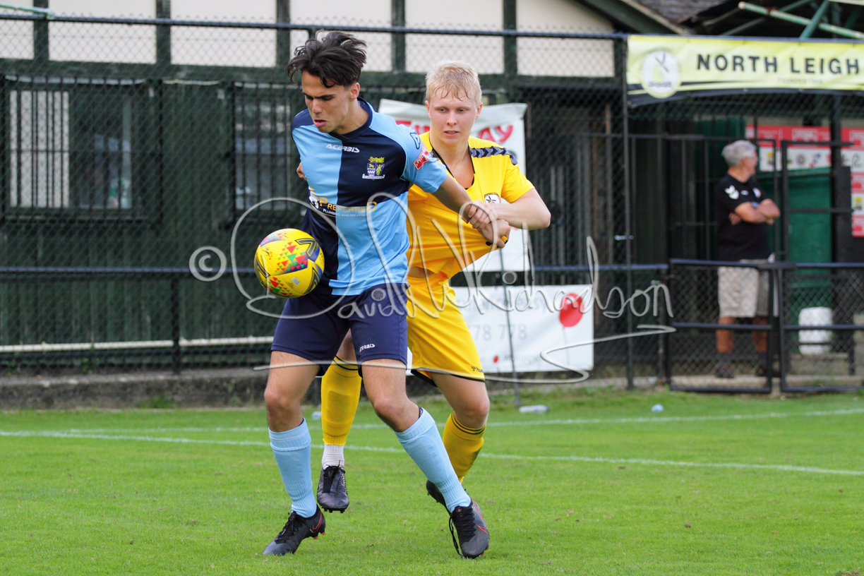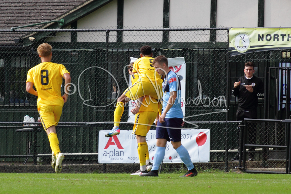The Referee was in action two minutes in to the second half booking a third home player for an innocuous looking challenge but just sixty seconds later North Leigh took the lead. Another free kick just outside the penalty area delivered by Aaron Heap, saw the tall Luke Carnell outjump the defence and net with a perfectly placed header that gave Louis Chadwick no chance. St Neots tried to boost their defence sending on taller full-back Aaron Smith for Harvey Steel, but by now the home side were relishing their superior possession and midway through the half Jordan Thomas was played clear of the defence but as Louis Chadwick narrowed the angle, he shot tamely wide. After 73 minutes a second goal effectively put the outcome of the match beyond St Neots because they were seldom troubling the home defence. A free kick by Heap was headed back across goal by Carnell and Jensen Wright crashed home an unstoppable shot for that 2-0 lead. Now North Leigh rang the changes with all three permitted substitutes introduced and apart from one shot by Richard-Noel blocked by a defender, St Neots had little to offer, until the final eight minutes when they gave U18 winger Julinho Gomes his first taste of senior football and he responded with two searching contributions – the first a cross just beyond the two St Neots attackers and the second a lob over the advancing goalkeeper that only just cleared the crossbar.