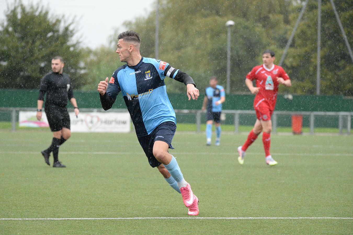 After the break St Neots were playing into a swirling wind but they adapted well keeping the ball largely on the ground and showing patience as they sought to level the sores. On the hour they decided on a change with Jake Battersby replacing Harvey Steel and he was quickly effective down the left flank. Harlow did get he ball in the net after 63 minutes, but the effort was cancelled out by an offside flag and a minute later St Neots was level as home keeper Middlehurst fumbled a Battersby cross and skipper Lee Watkins gleefully bundled the ball into the net for his first goal of the season. The play continued with both sides still committed to attacking play, but clear chances were limited until Rider nodded down a Battersby cross to set up Richard-Noel who shot wildly over the bar. Demaray Anyadike who had tantalised the St Neots defence had a net bound shot deflected and as the home side looked for a winning goal, Chadwick produced the save of the match to deny substitute Jaedon Phillips. The game ended on a low note for the home side when another substitute, Alfie Attrill picked up a second yellow card in time added and was sent off.