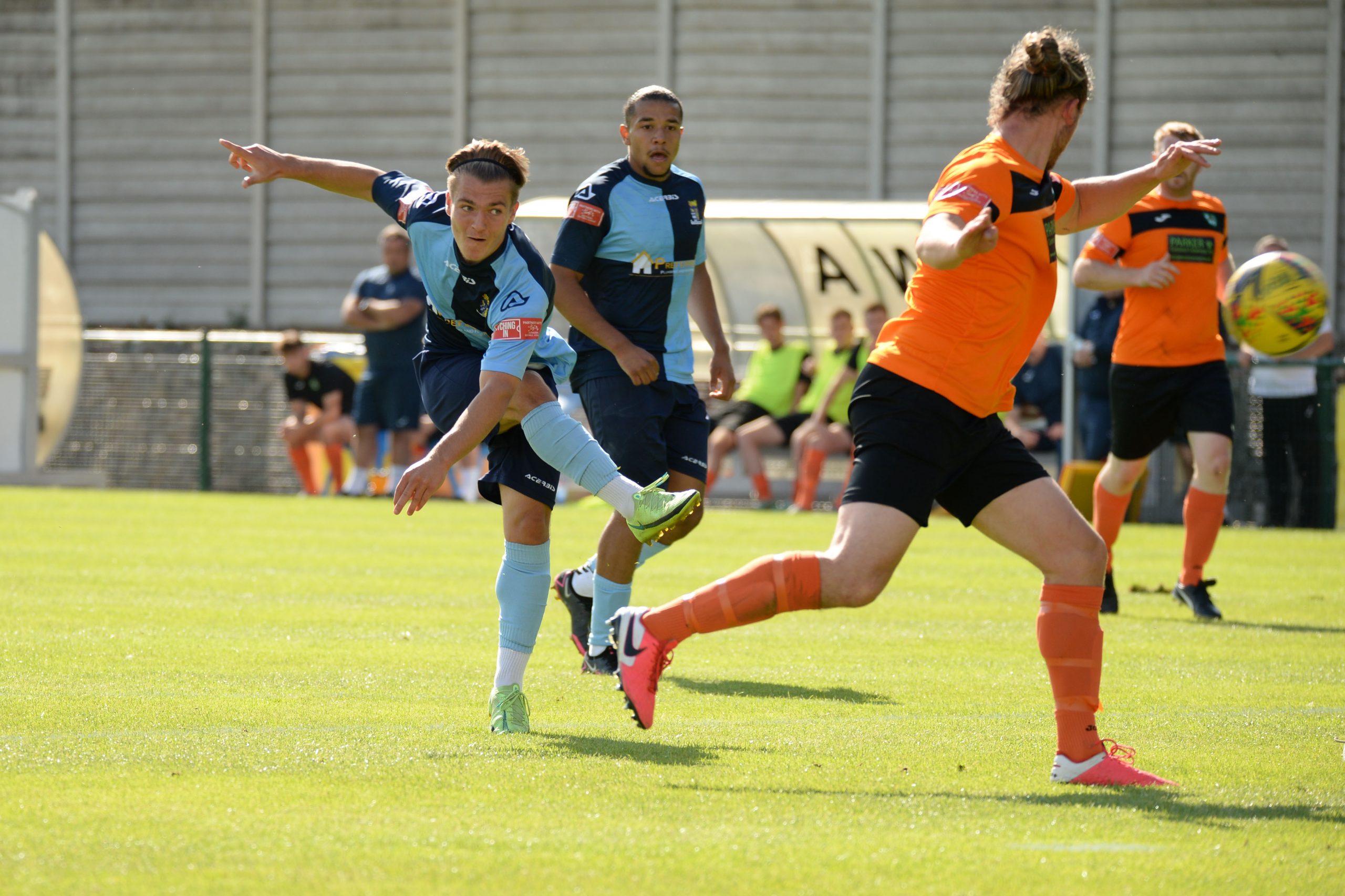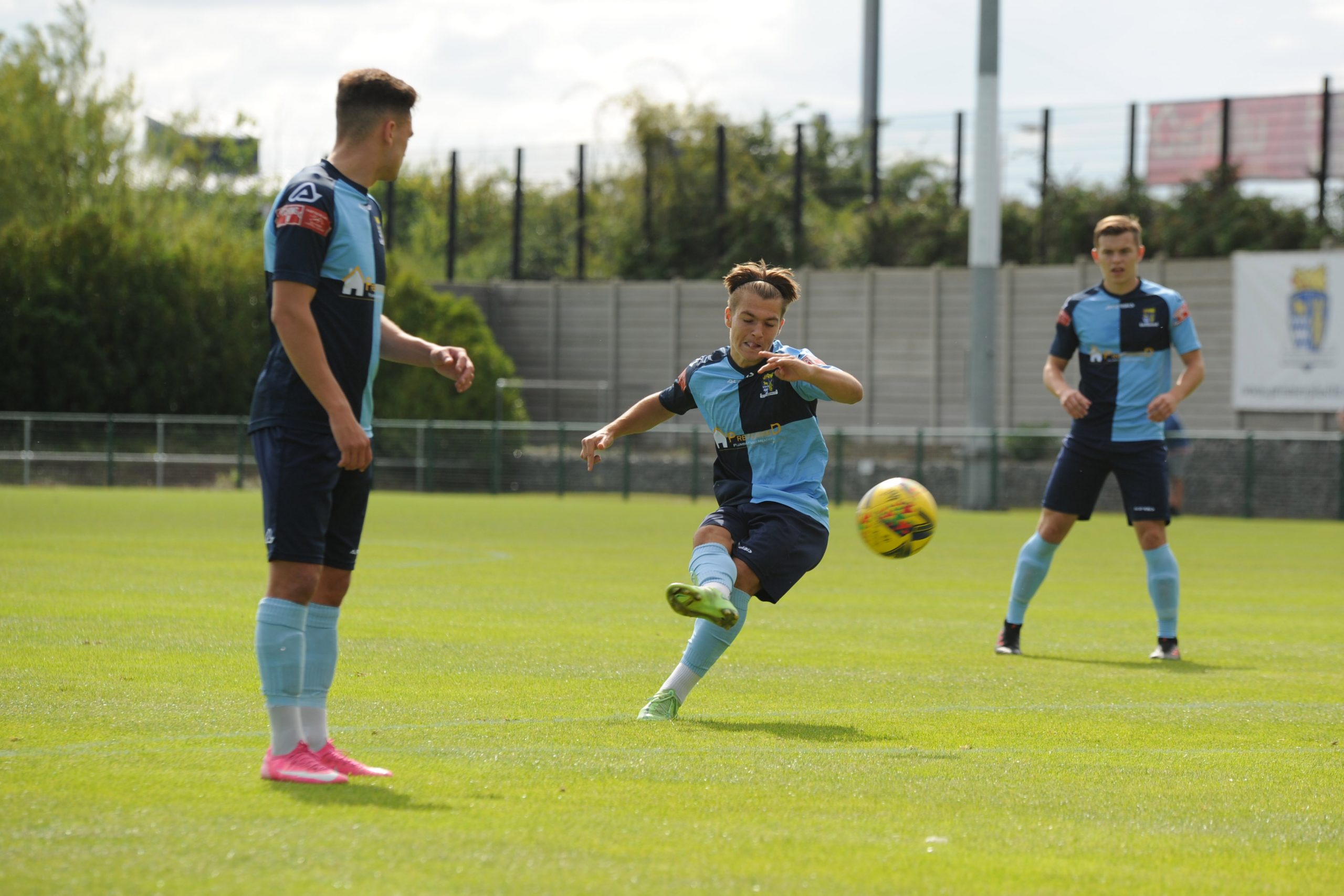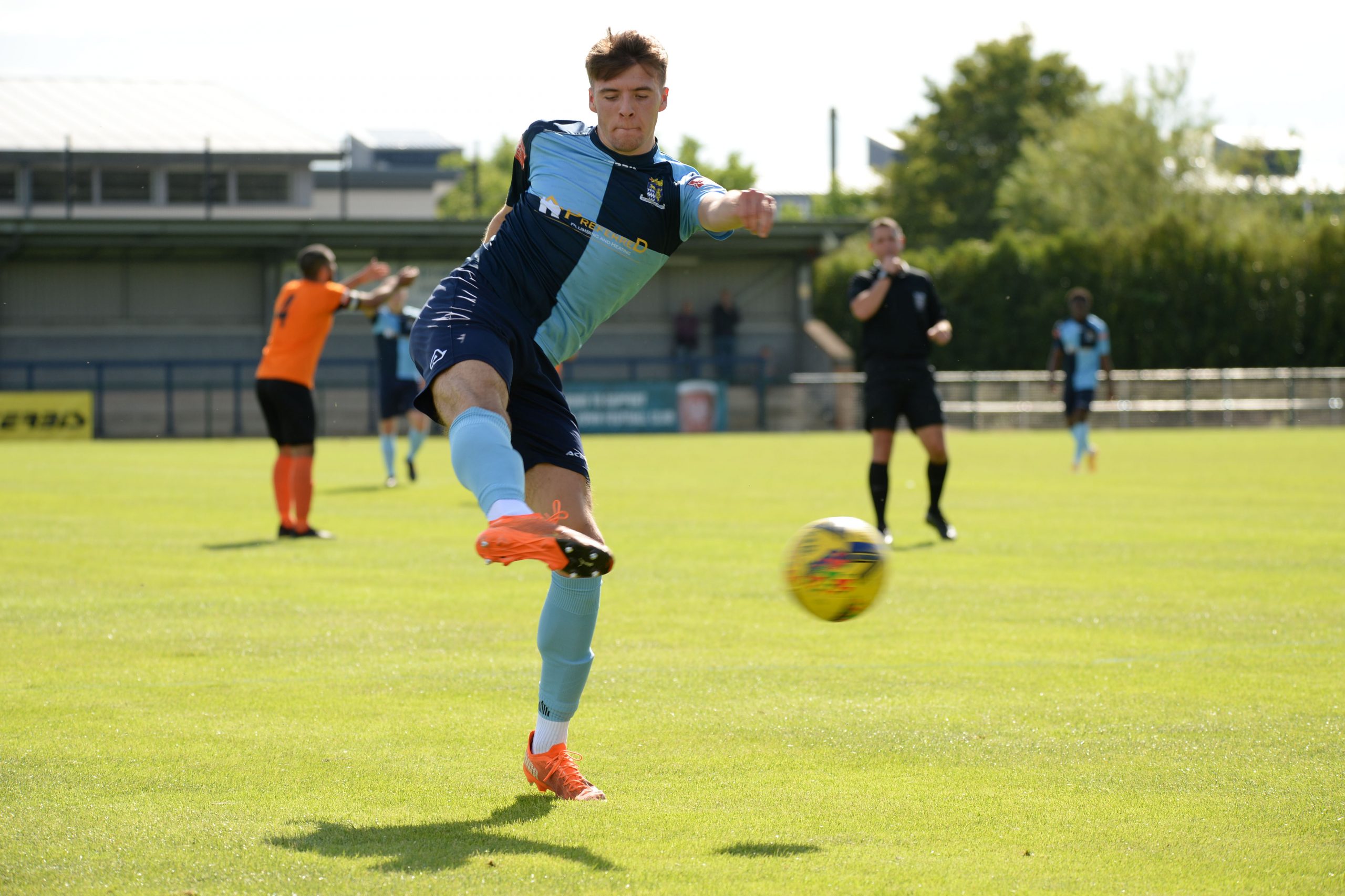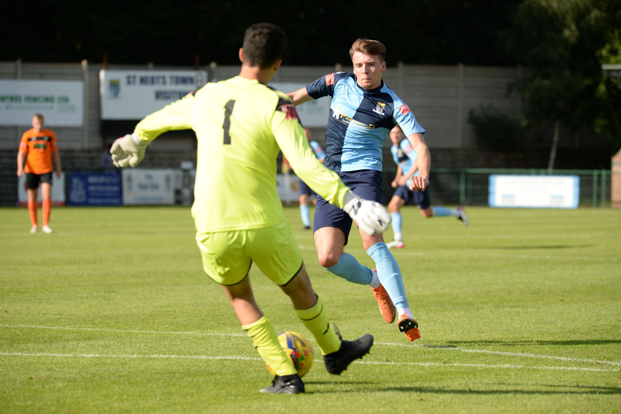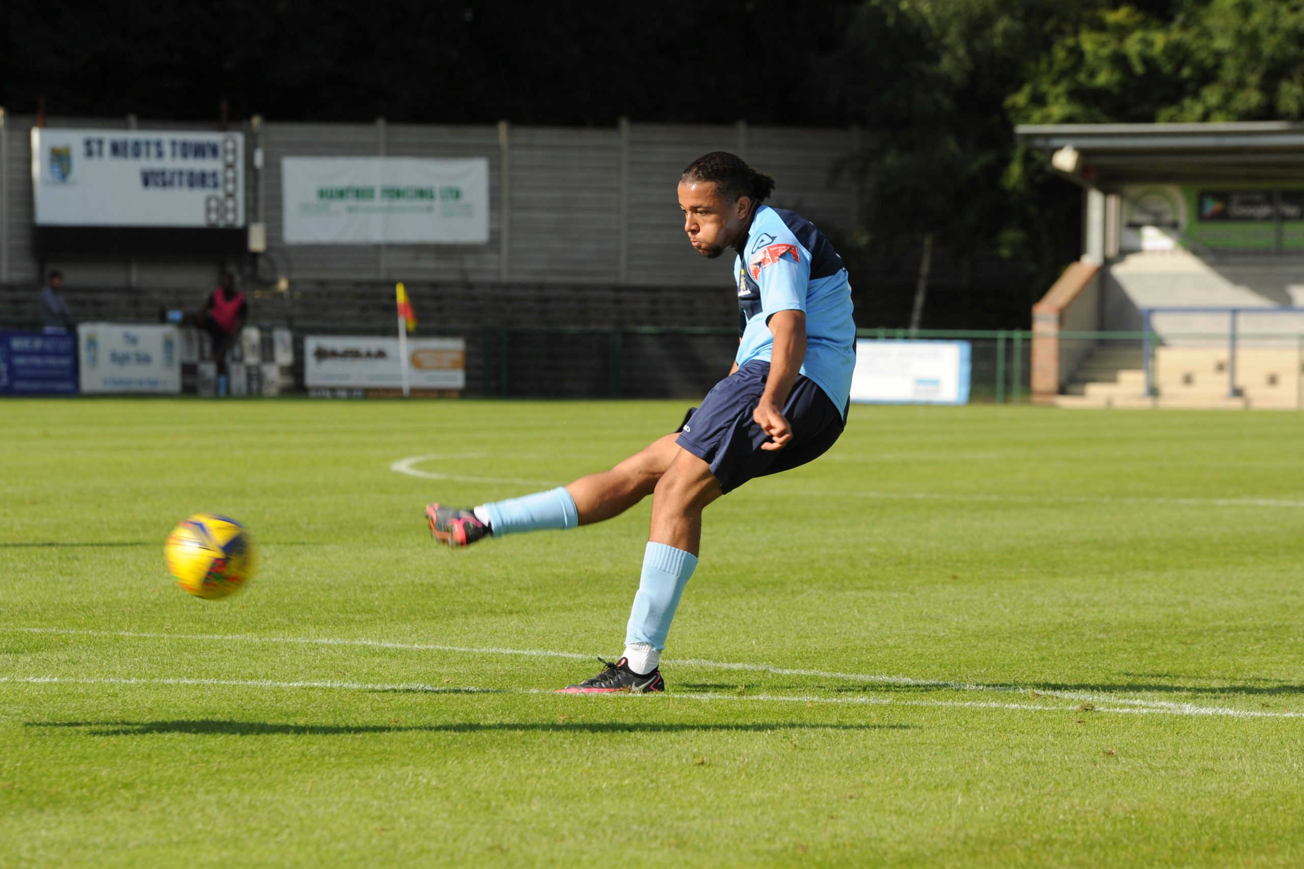 St Neots made much the better start creating two good chances before taking the lead on 13 minutes. Charley Barker stung Harry Way’s hands with a 30 yarder after four minutes and three minutes later the visiting keeper was again in action parrying a Myles Cowling effort after unselfish play by Joe Rider. The opening goal came courtesy of a Joe Rider penalty kick after visiting skipper Lewis Gabbidon had scythed down Cowling as he wove his way through the defence. Briefly the visitors rallied, and John Mills sent a free kick from a promising position high over the crossbar, and a Gabbidon free kick was pushed away by Louis Chadwick. St Neots continued to dominate from midfield and ten minutes before the break the mercurial Myles Cowling did negotiate his way through the visiting defence to score his first goal of the season. Rider then got the ball in the net only to by pulled back by an offside flag and as half time approached Cowling had two further chances to increase the home lead. He first went around the last defender and goalkeeper only to be denied by too narrow an angle as he found the side netting, and then after a flowing team move Lee Watkins set him up at the far post but his finish was too high. However, St Neots were not to be denied and in the final seconds of the first period Barker crossed to the far post for Joe Rider to claim his second goal of the match.