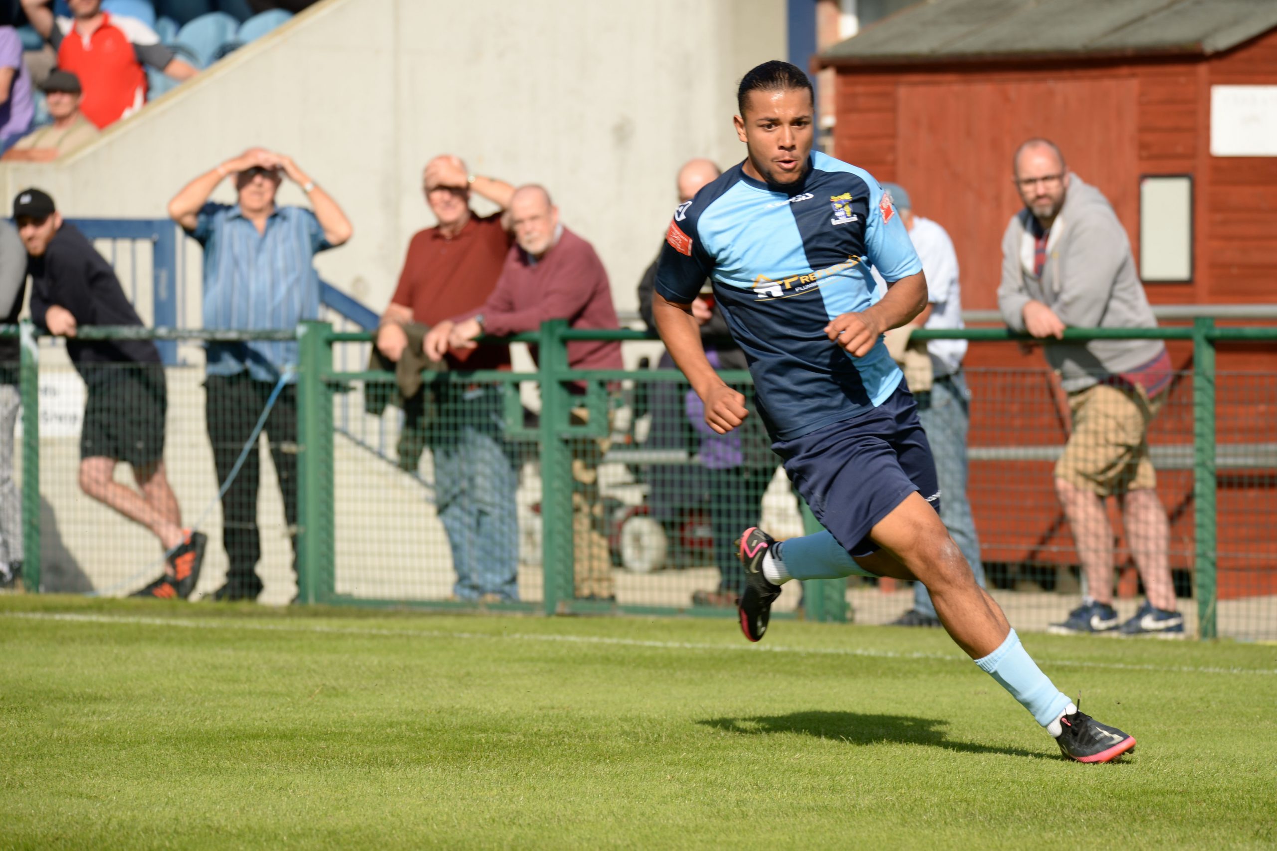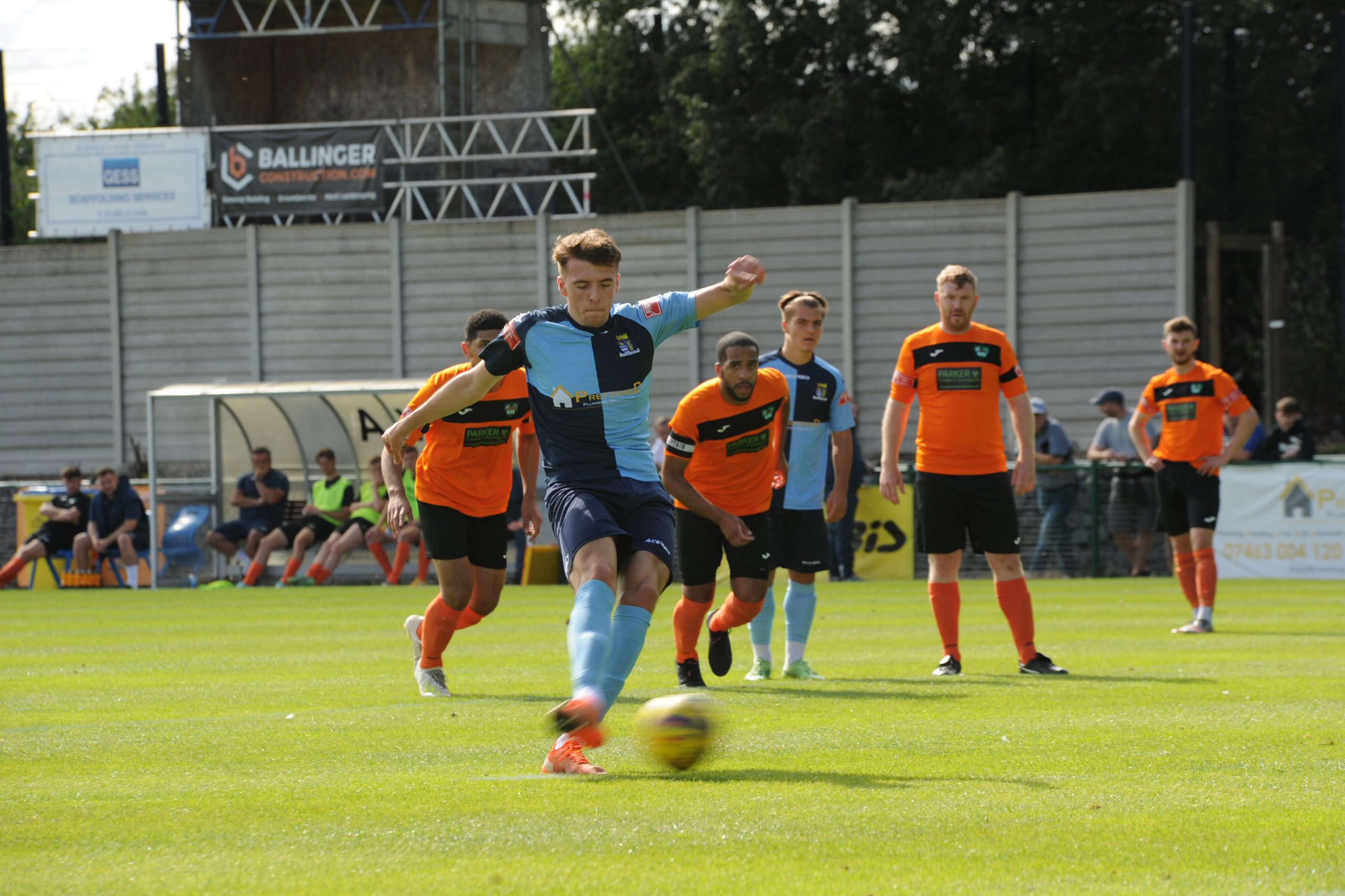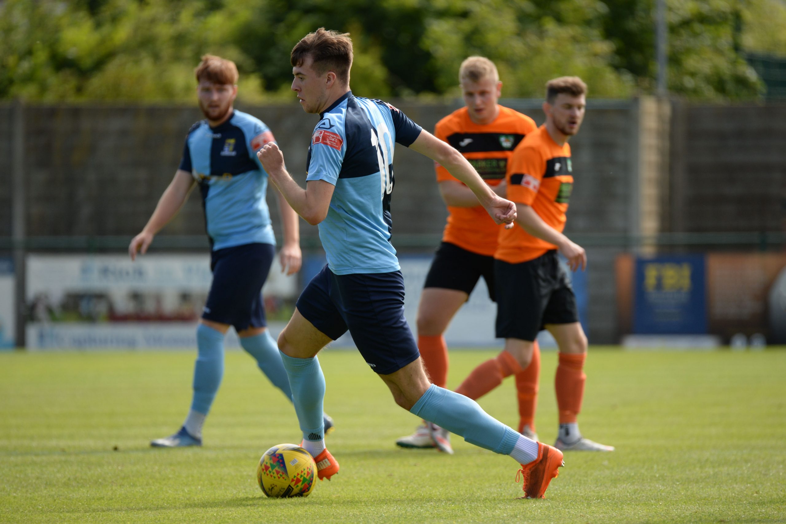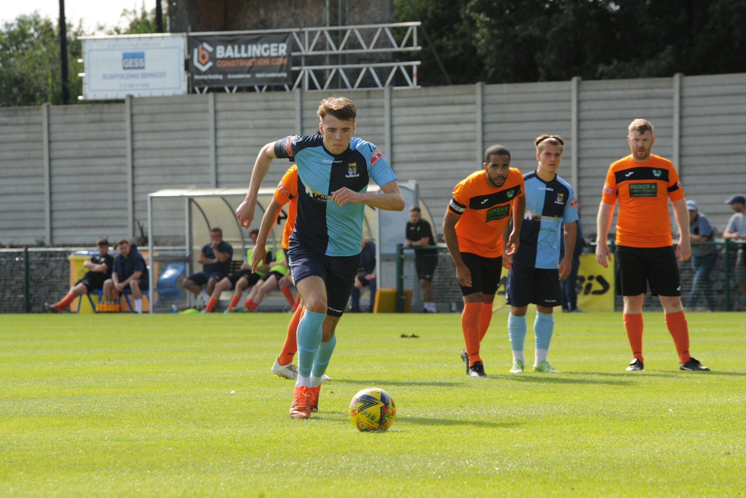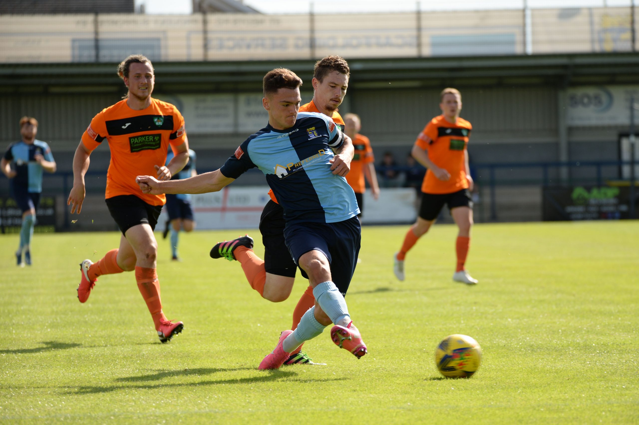 St Neots made much the better start creating two good chances before taking the lead on 13 minutes. Charley Barker stung Harry Way’s hands with a 30 yarder after four minutes and three minutes later the visiting keeper was again in action parrying a Myles Cowling effort after unselfish play by Joe Rider. The opening goal came courtesy of a Joe Rider penalty kick after visiting skipper Lewis Gabbidon had scythed down Cowling as he wove his way through the defence. Briefly the visitors rallied, and John Mills sent a free kick from a promising position high over the crossbar, and a Gabbidon free kick was pushed away by Louis Chadwick. St Neots continued to dominate from midfield and ten minutes before the break the mercurial Myles Cowling did negotiate his way through the visiting defence to score his first goal of the season. Rider then got the ball in the net only to by pulled back by an offside flag and as half time approached Cowling had two further chances to increase the home lead. He first went around the last defender and goalkeeper only to be denied by too narrow an angle as he found the side netting, and then after a flowing team move Lee Watkins set him up at the far post but his finish was too high. However, St Neots were not to be denied and in the final seconds of the first period Barker crossed to the far post for Joe Rider to claim his second goal of the match.