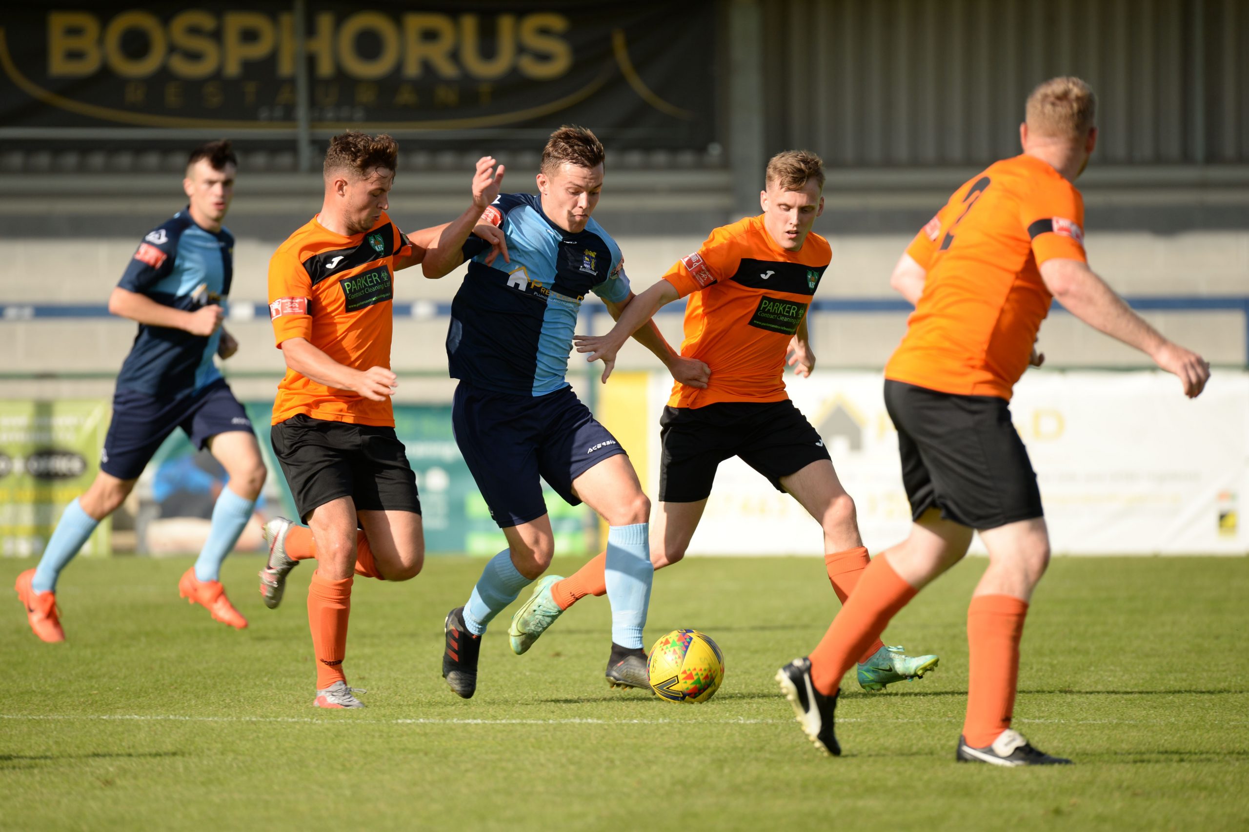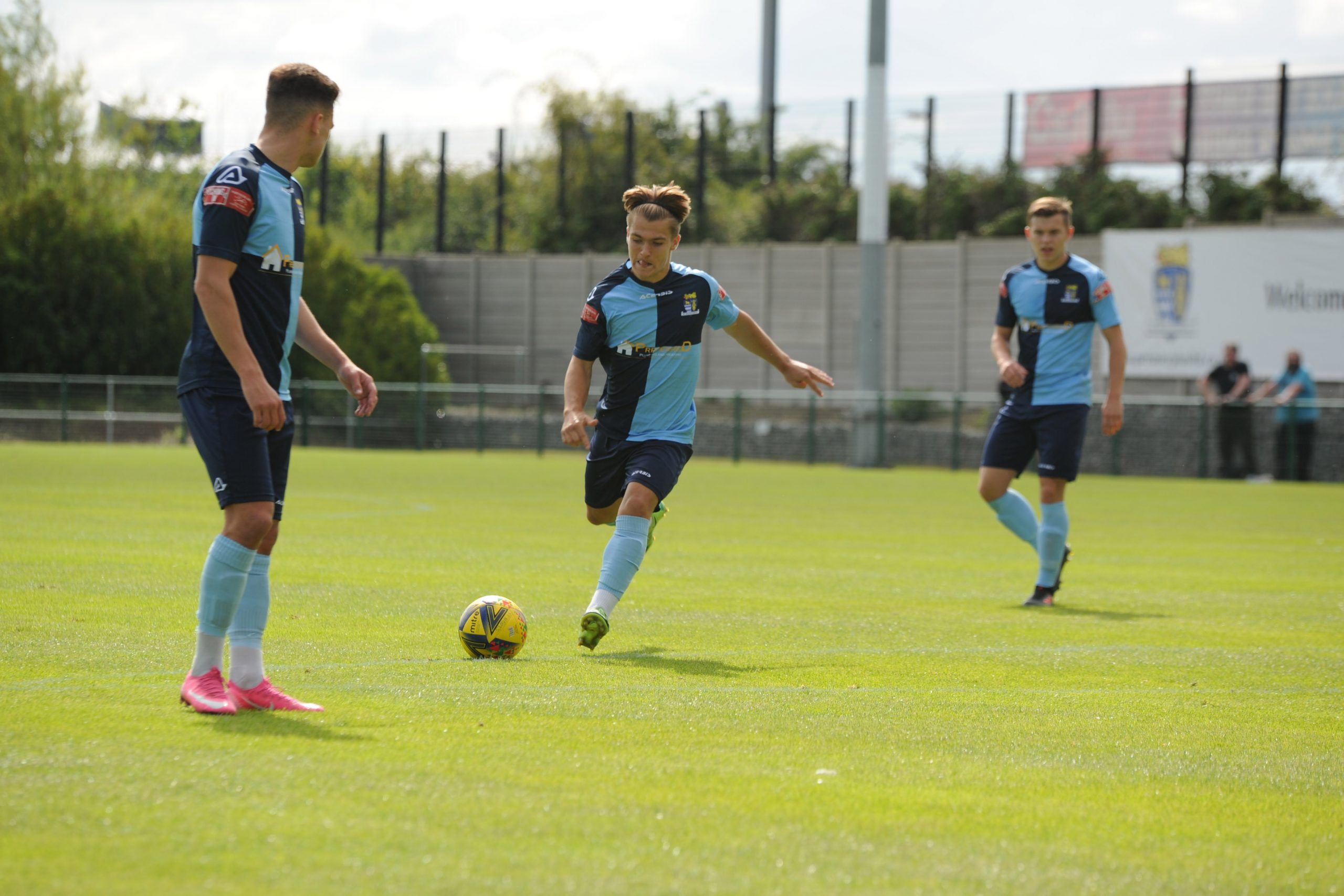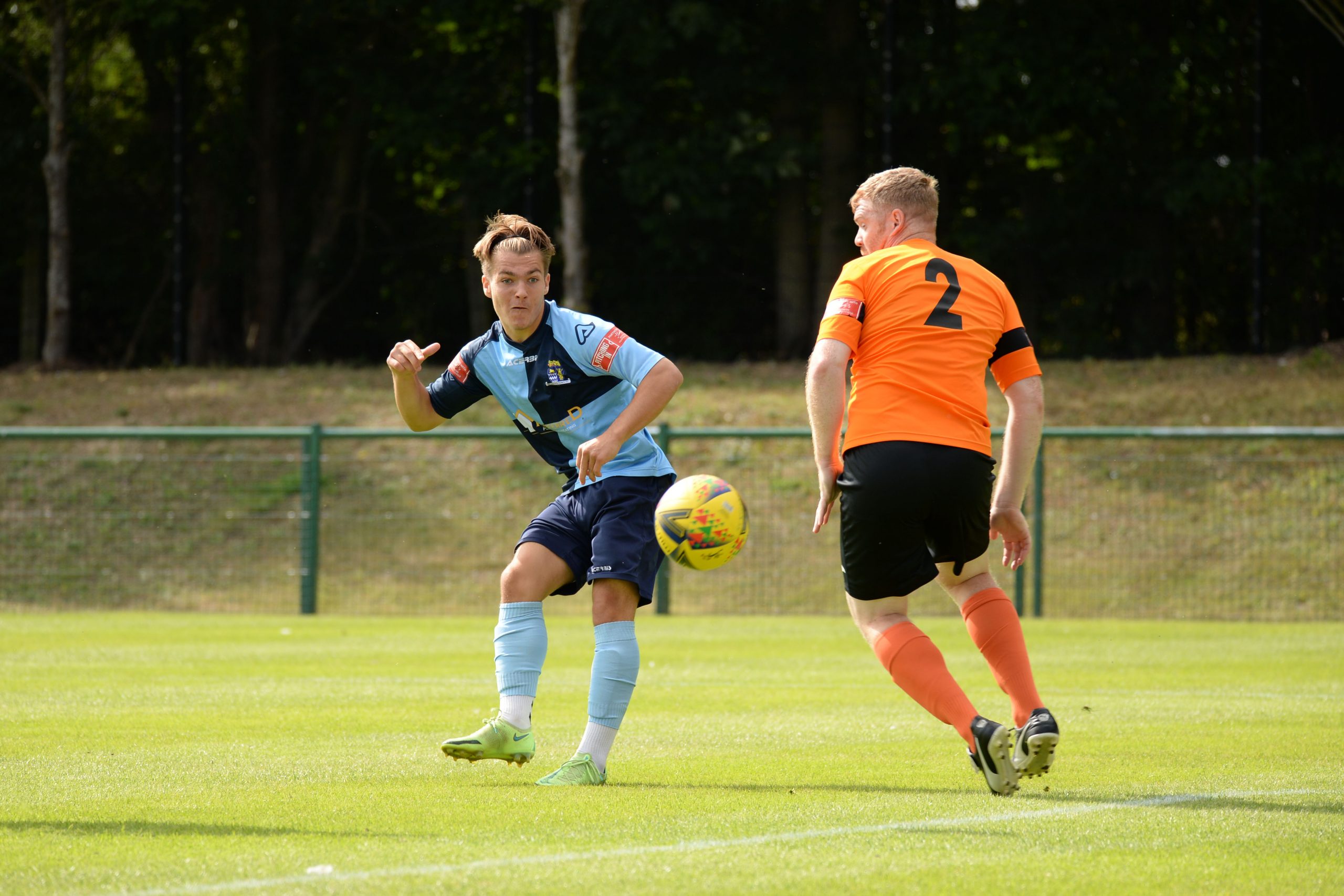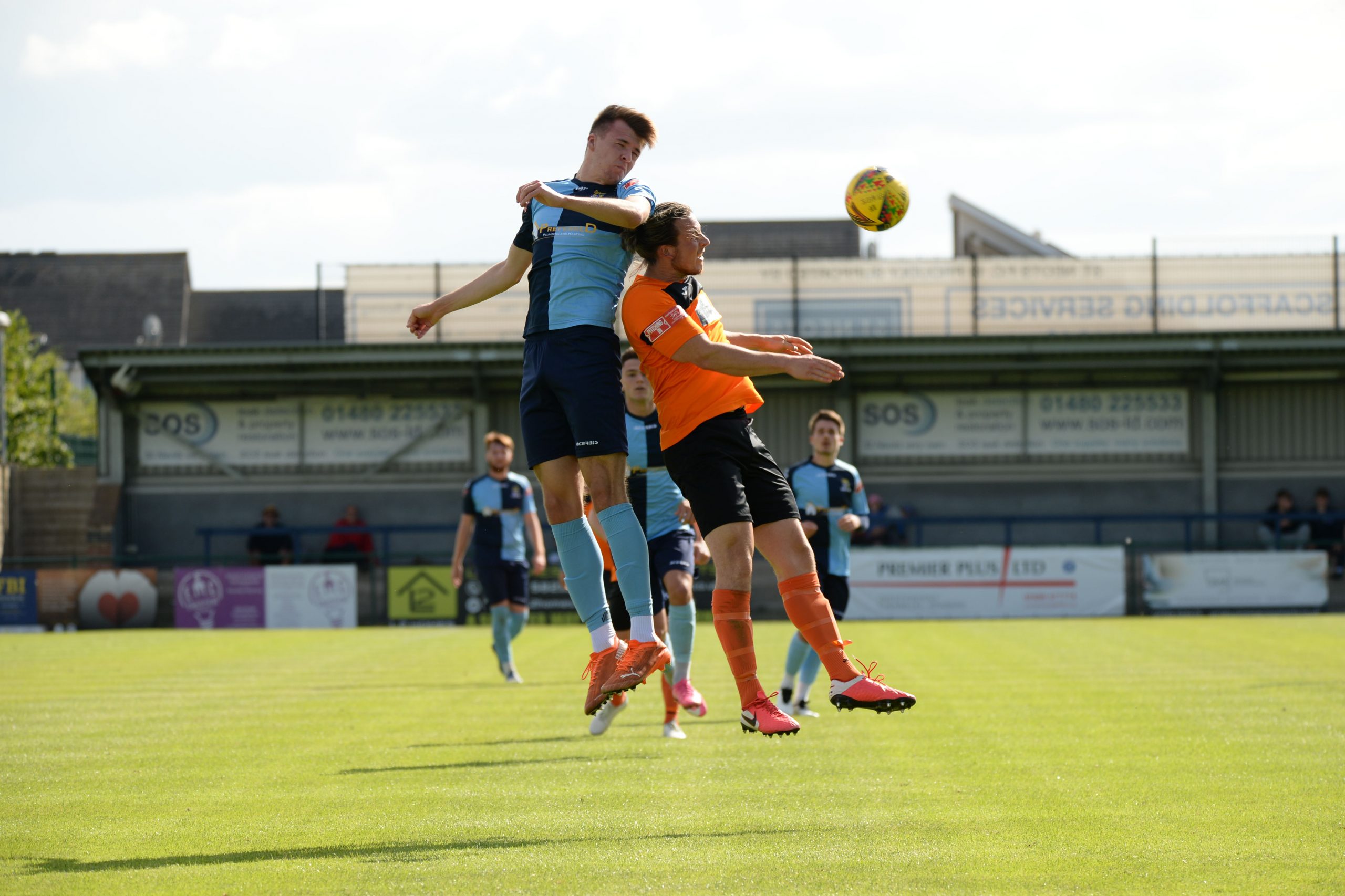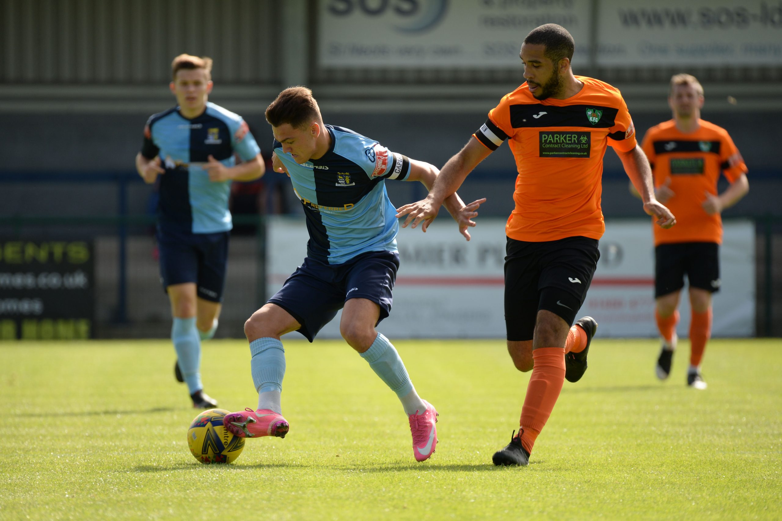 St Neots made much the better start creating two good chances before taking the lead on 13 minutes. Charley Barker stung Harry Way’s hands with a 30 yarder after four minutes and three minutes later the visiting keeper was again in action parrying a Myles Cowling effort after unselfish play by Joe Rider. The opening goal came courtesy of a Joe Rider penalty kick after visiting skipper Lewis Gabbidon had scythed down Cowling as he wove his way through the defence. Briefly the visitors rallied, and John Mills sent a free kick from a promising position high over the crossbar, and a Gabbidon free kick was pushed away by Louis Chadwick. St Neots continued to dominate from midfield and ten minutes before the break the mercurial Myles Cowling did negotiate his way through the visiting defence to score his first goal of the season. Rider then got the ball in the net only to by pulled back by an offside flag and as half time approached Cowling had two further chances to increase the home lead. He first went around the last defender and goalkeeper only to be denied by too narrow an angle as he found the side netting, and then after a flowing team move Lee Watkins set him up at the far post but his finish was too high. However, St Neots were not to be denied and in the final seconds of the first period Barker crossed to the far post for Joe Rider to claim his second goal of the match.